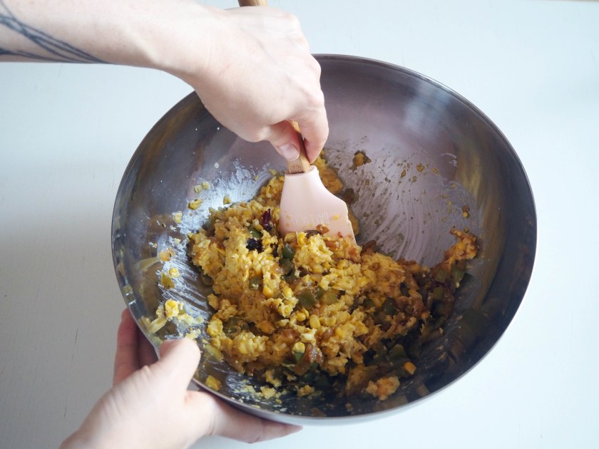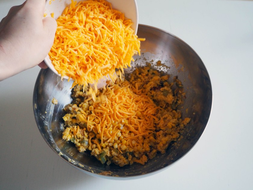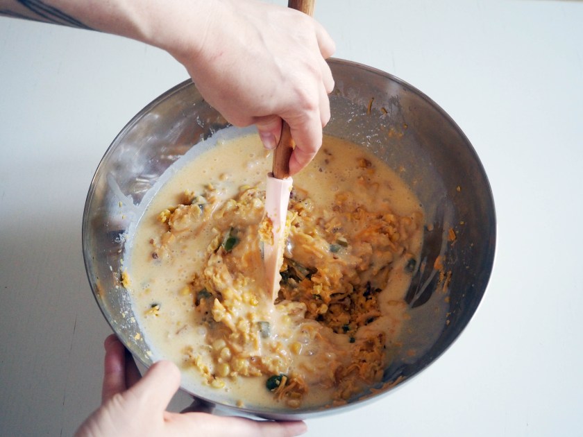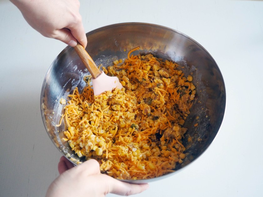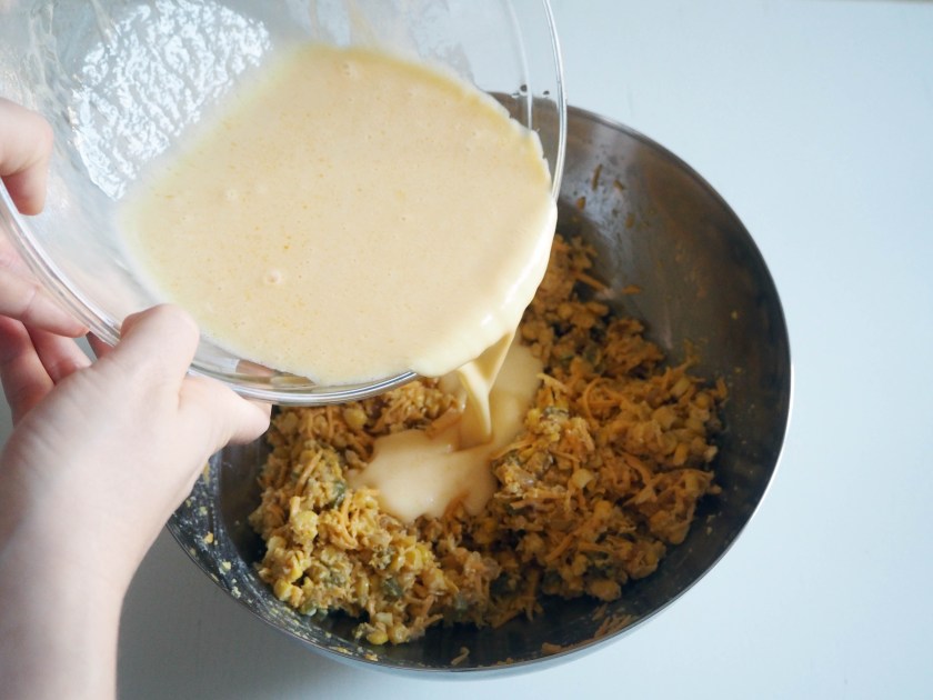 11. Add the egg mixture to the corn mixture and fold until all ingredients are well mixed.