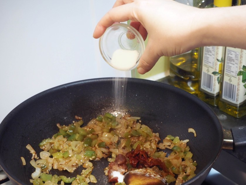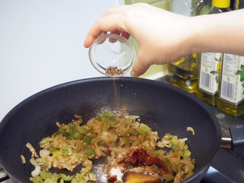2. In a medium pan, put olive oil and warm for about 20 seconds on medium high heat. Add onions and bell pepper and saute for about 6-7 minutes, until both are well cooked.