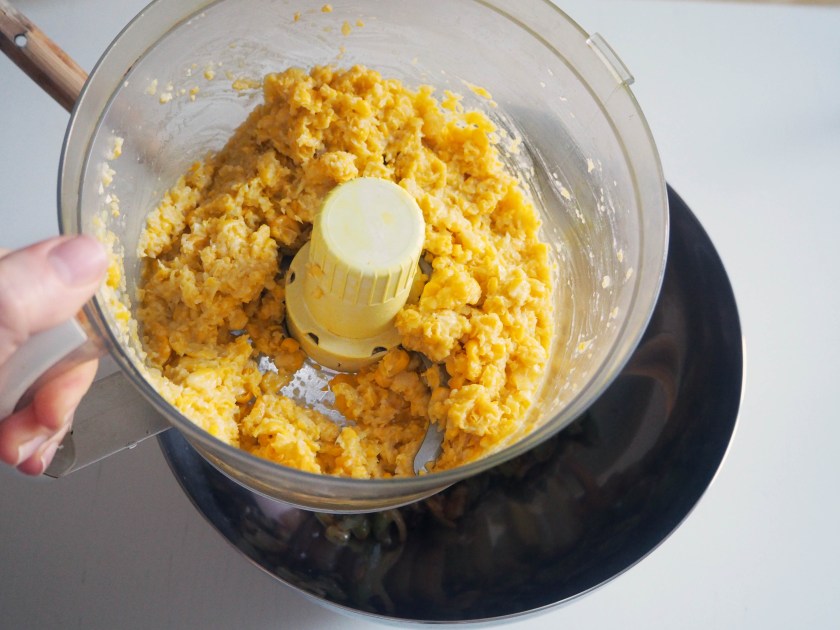 6. In a food processor, blitz 7.5 dl (or 3 cups) of corn into a paste – or as close to a paste as possible. It’s ok if there are some pieces left in between. Add this corn to the onion mixture.