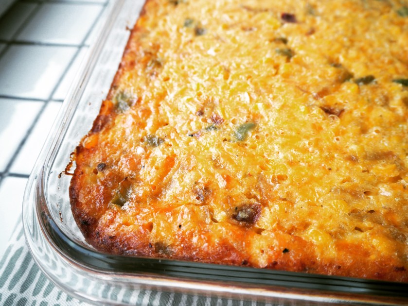 This corn dish though is not at all like anything from my childhood memories. Well, but this is a proper corn dish you can eat even all by itself, though you can also eat it as a side dish – or, you can keep this casserole as the main dish and just have a light salad along with it.
