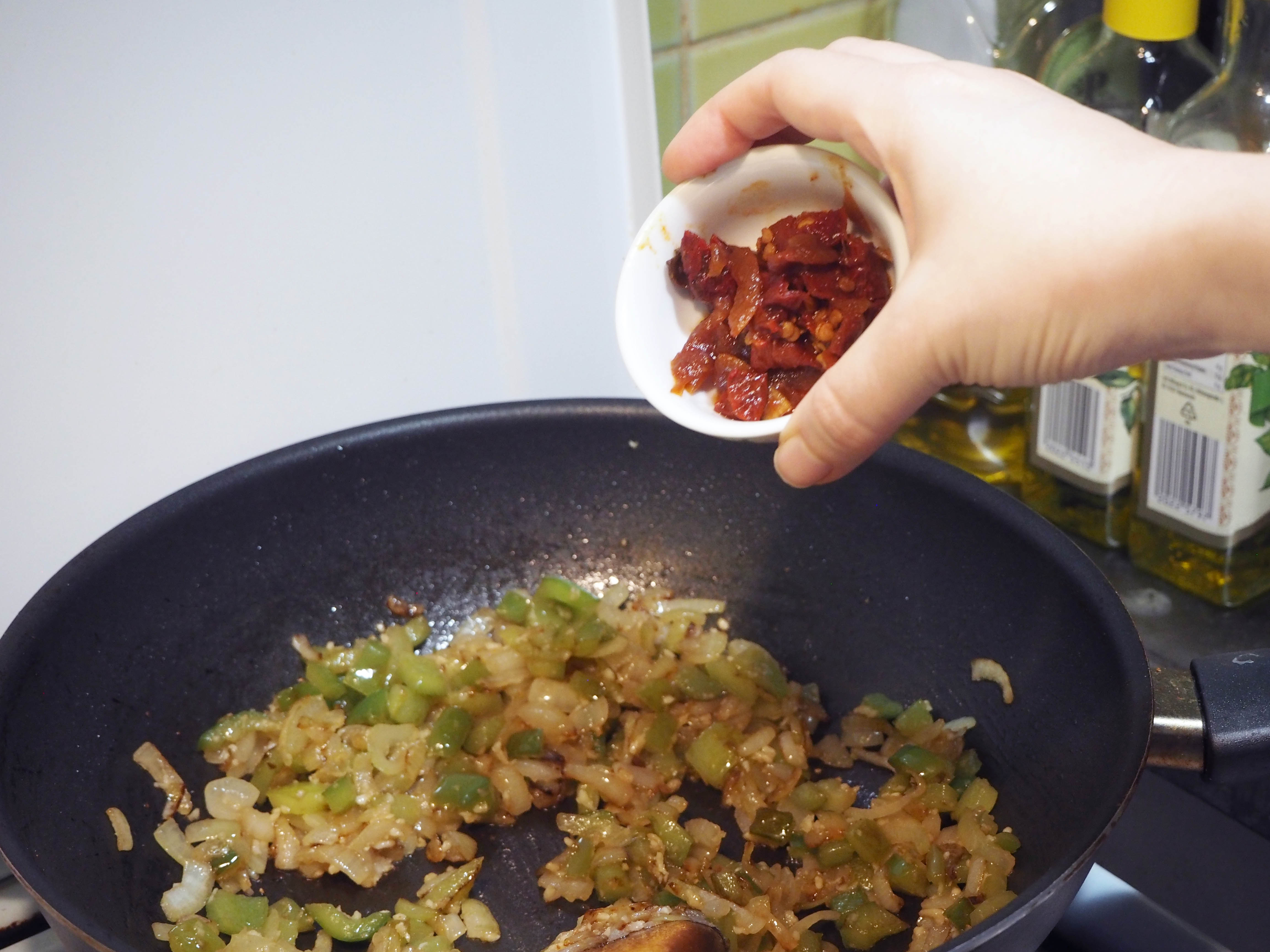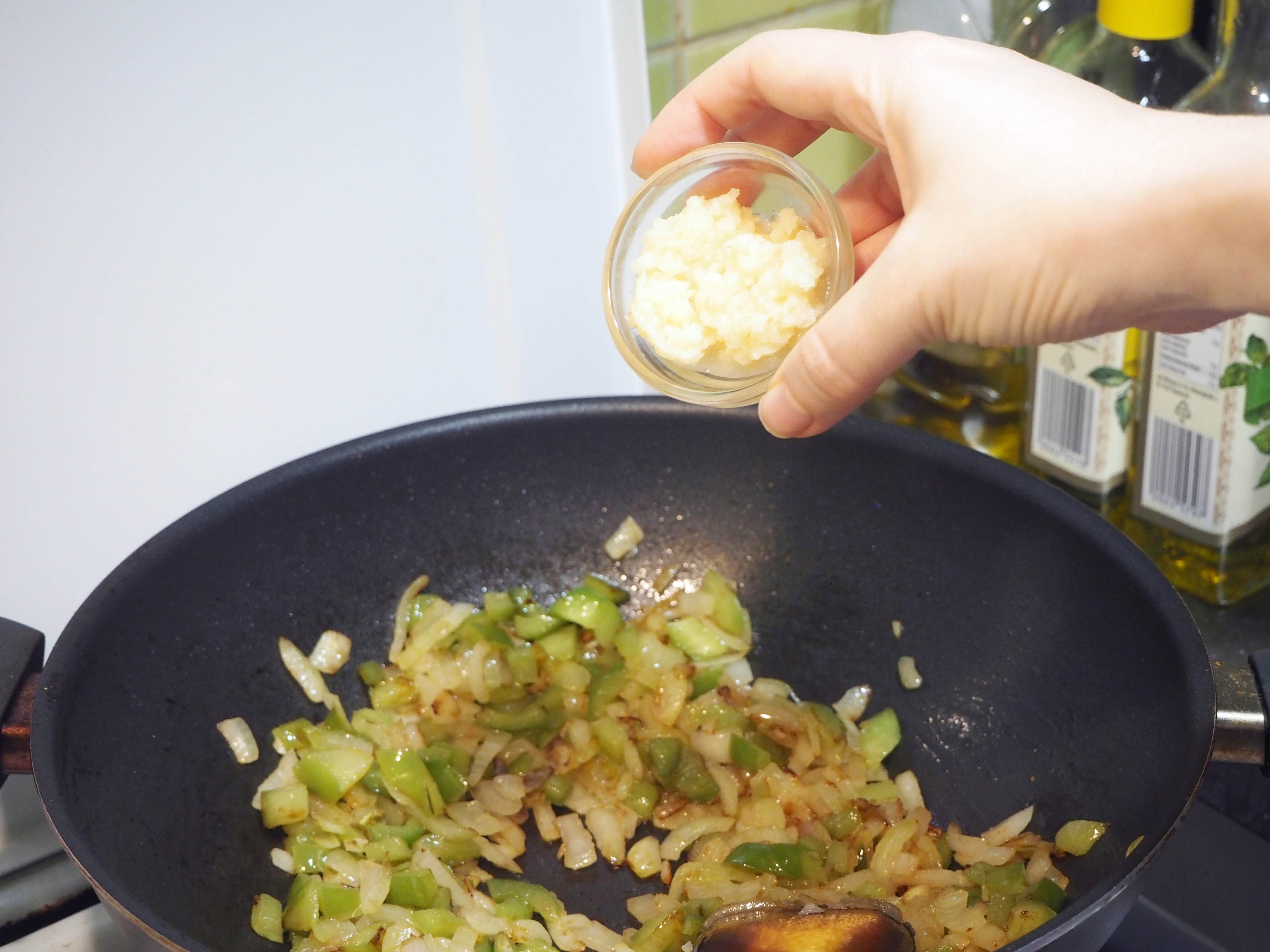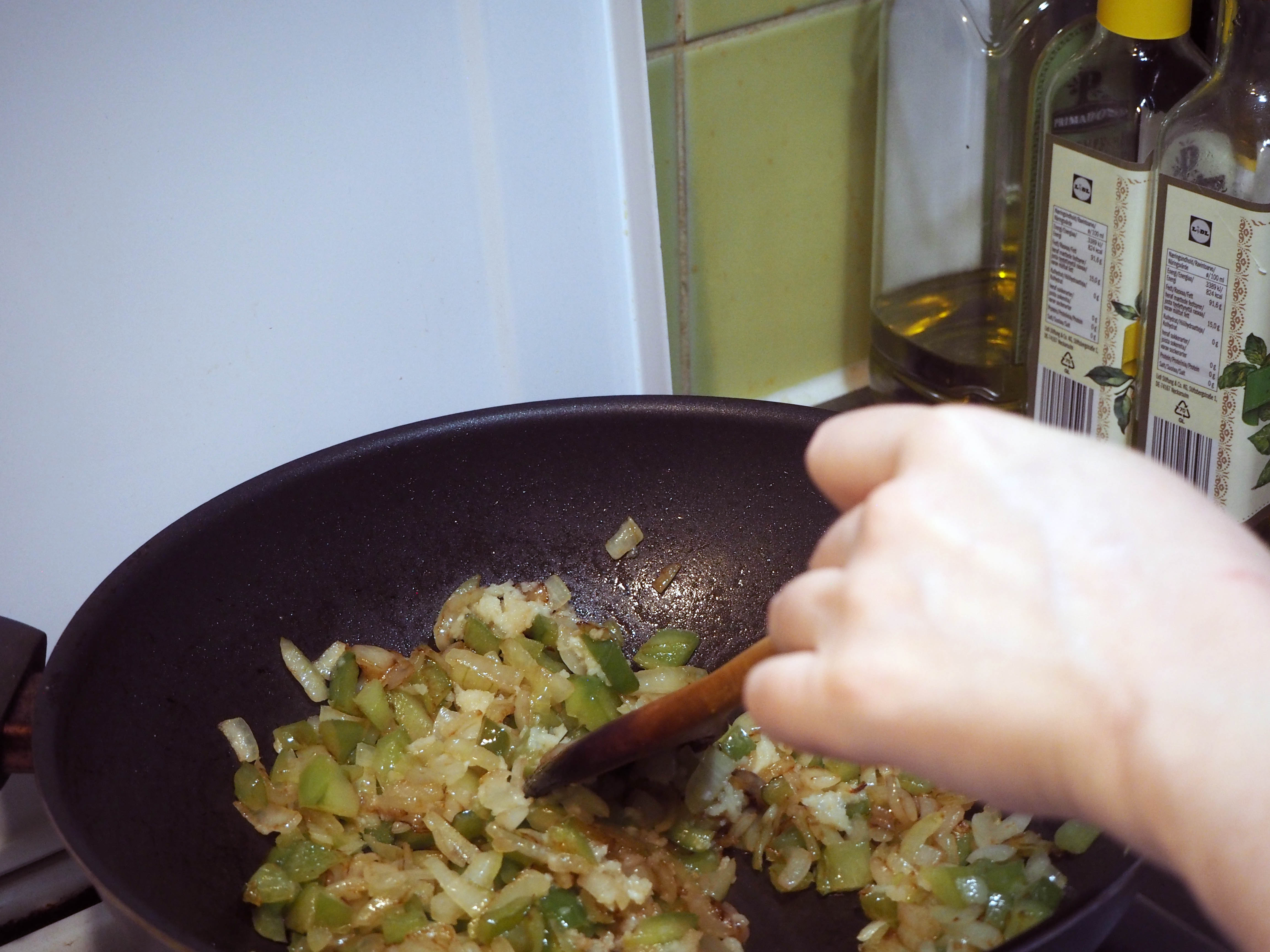 2. In a medium pan, put olive oil and warm for about 20 seconds on medium high heat. Add onions and bell pepper and saute for about 6-7 minutes, until both are well cooked.