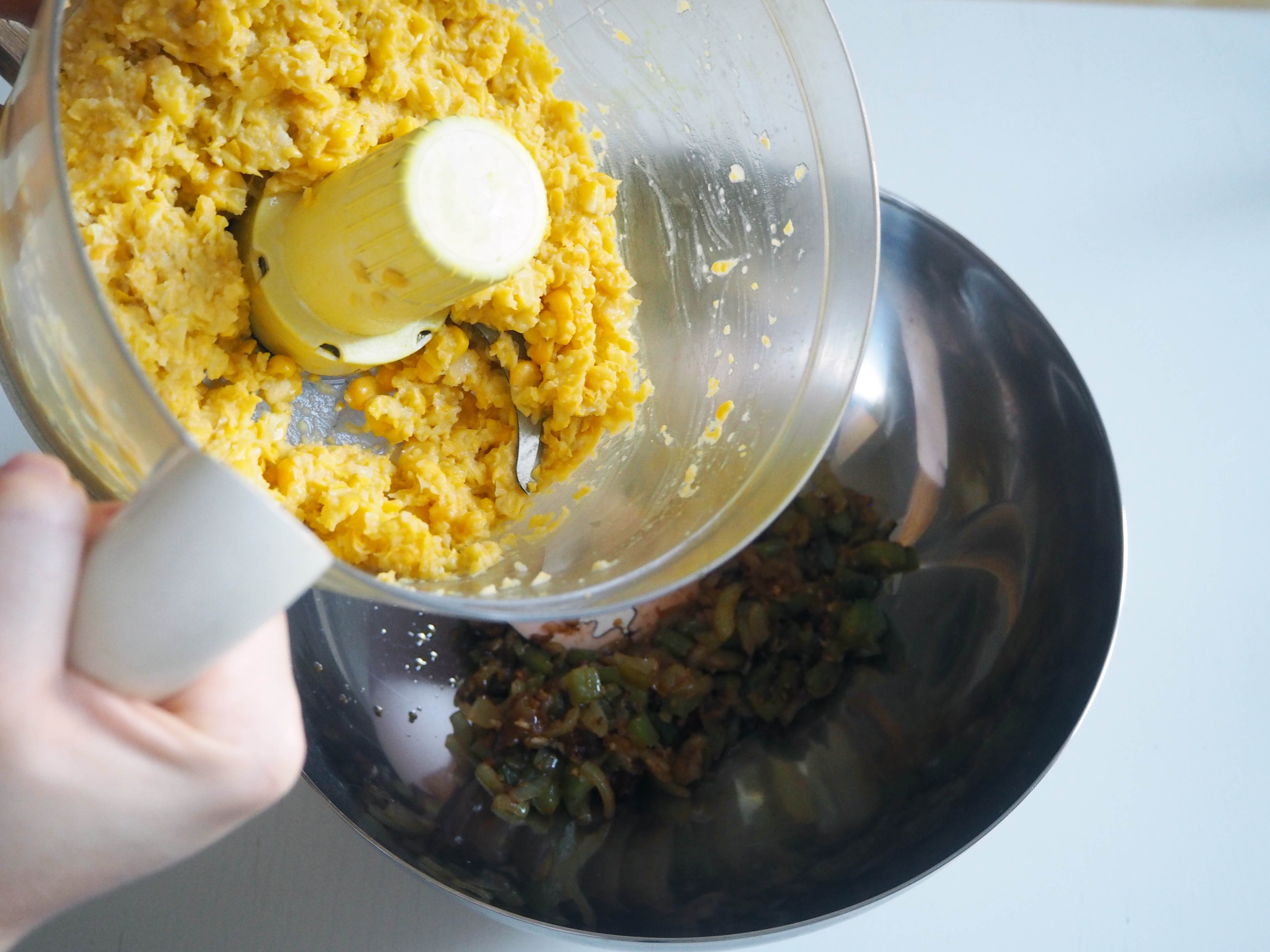 6. In a food processor, blitz 7.5 dl (or 3 cups) of corn into a paste – or as close to a paste as possible. It’s ok if there are some pieces left in between. Add this corn to the onion mixture.