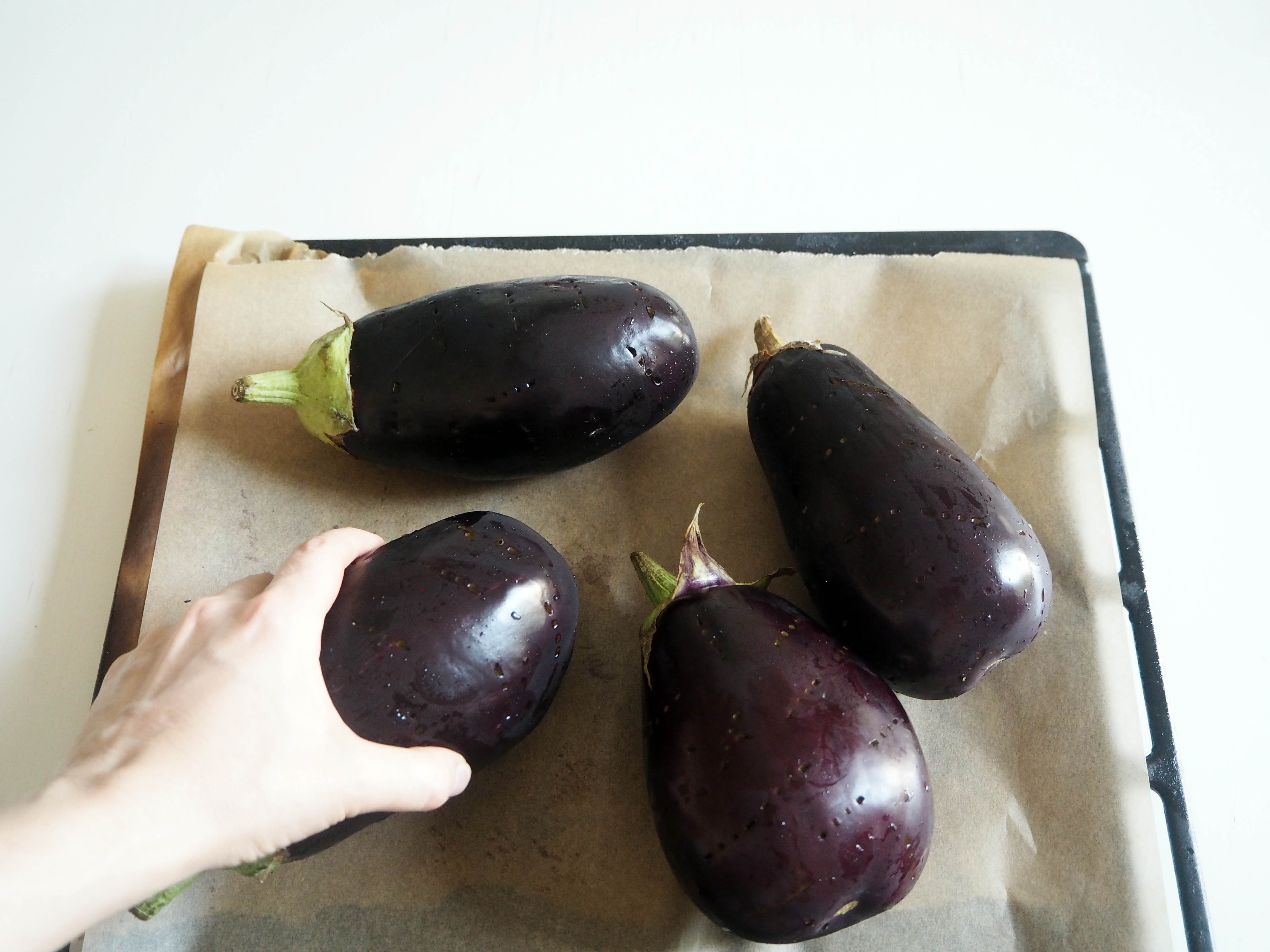 2. Punch holes using a fork on each eggplant (many many holes). Put the eggplants on the tray you prepared and roast in the oven, in medium rack, for 50 to 60 minutes, until eggplants are really really soft.