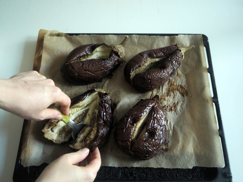 3. Let the roasted eggplants cool down for about 15-20 minutes after roasting, then cut each in 2 and scoop the flesh with a spoon.