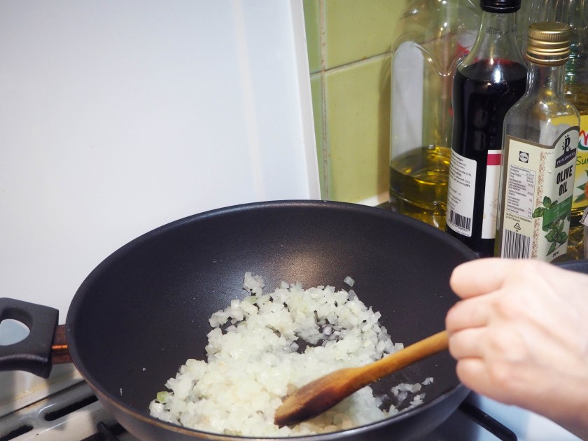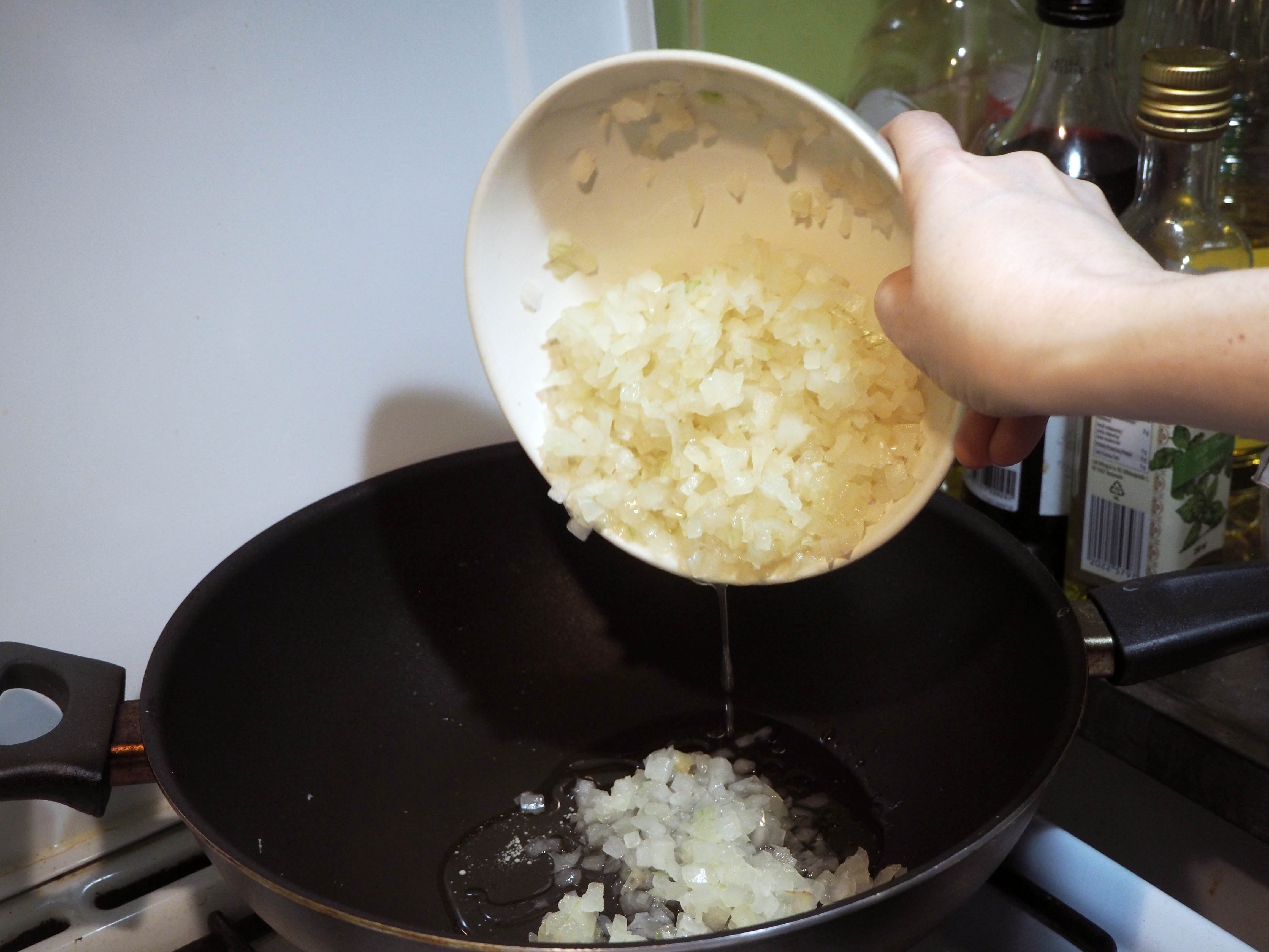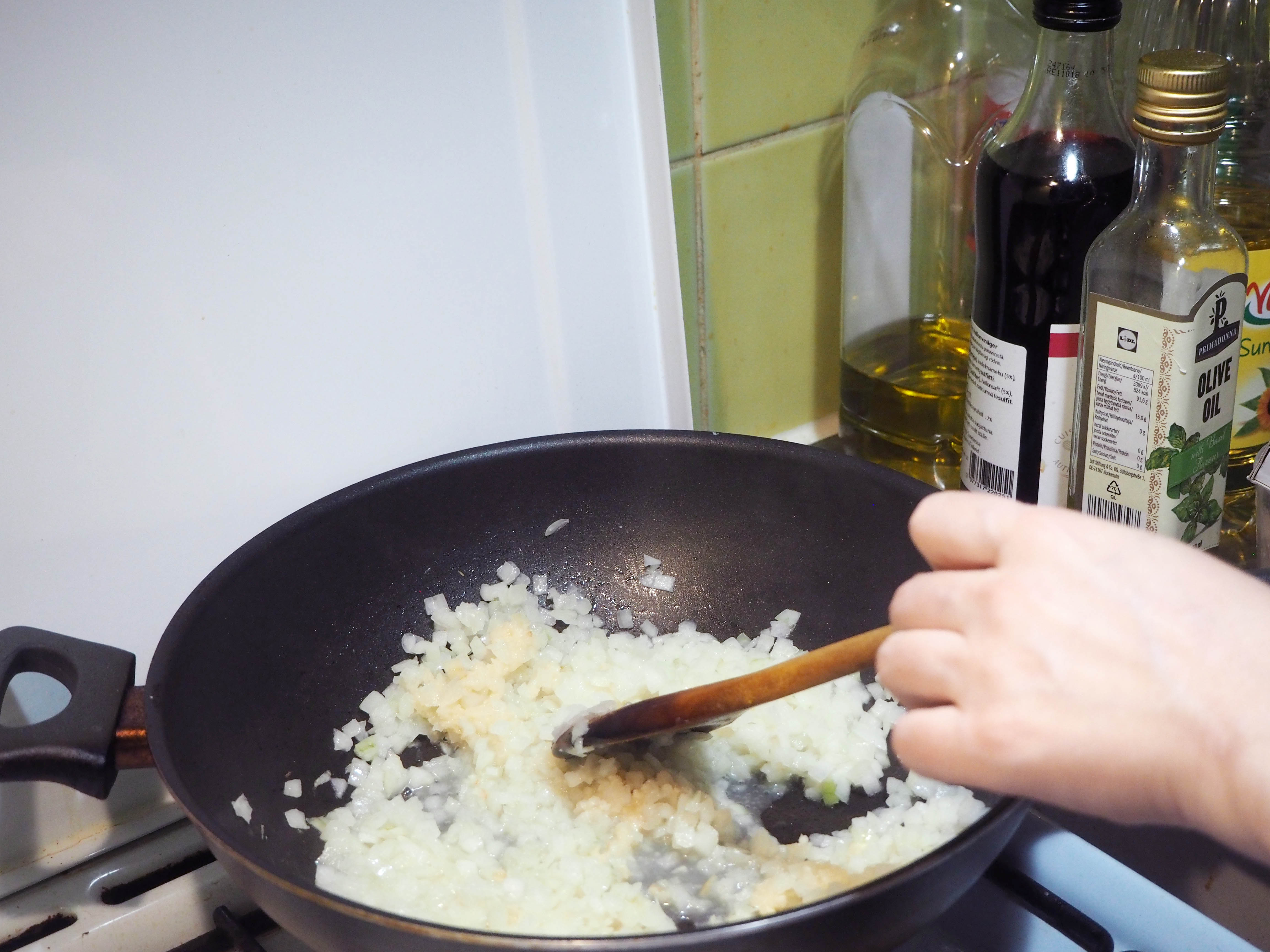 4. Put a large pan on medium high heat and add olive oil. Warm it for about 20 seconds, then add onions and sauté for about 7-8 minutes, stirring frequently, until they cook really well.