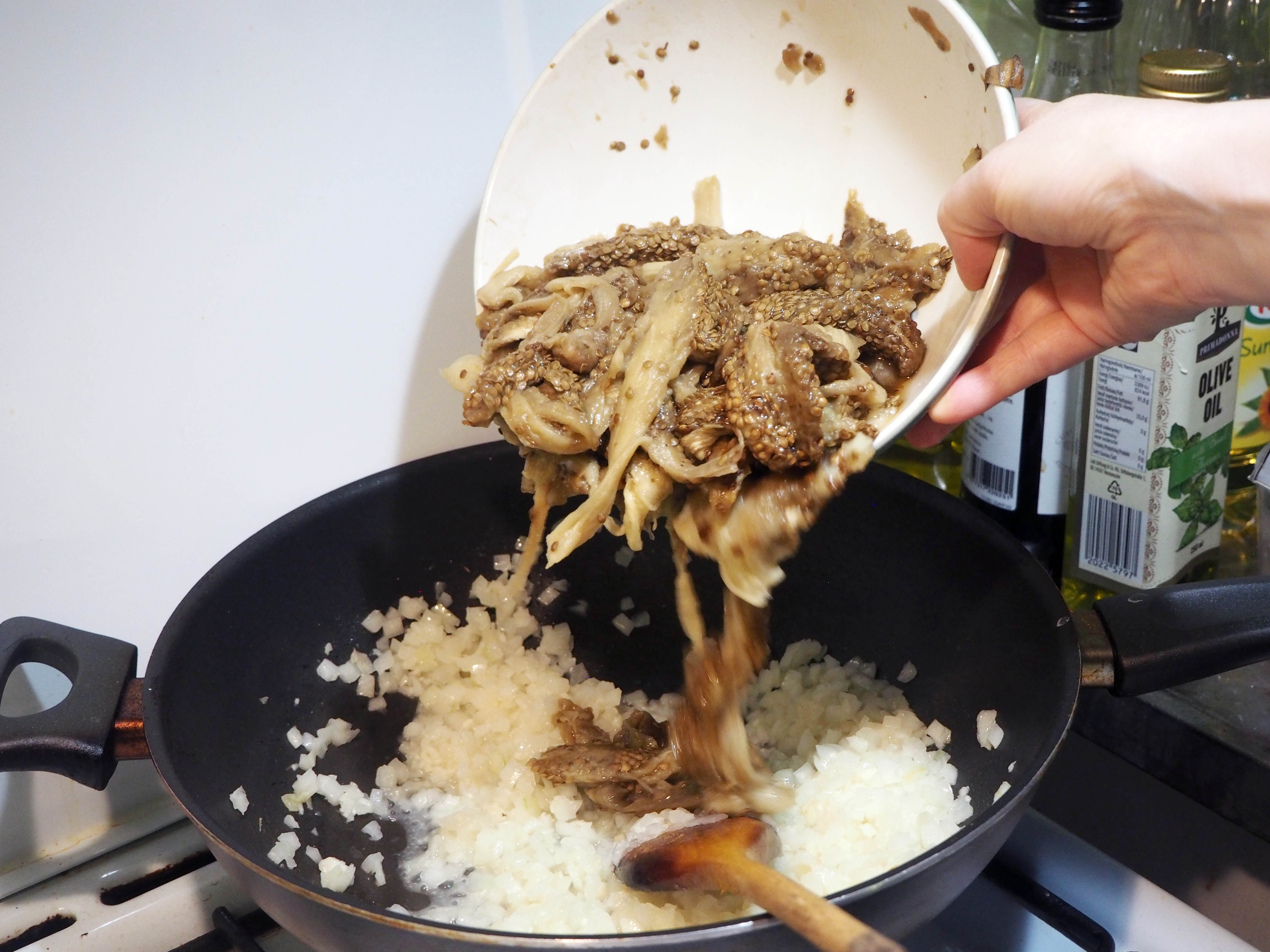 The recipe starts similar to baba ganoush – by roasting eggplants (though, traditionally, the eggplant in baba ganoush is smoked on the stove but well, it creates a mess…). Roasting is as far as it goes with the similarities though, because after that, comes onion and other ingredients.