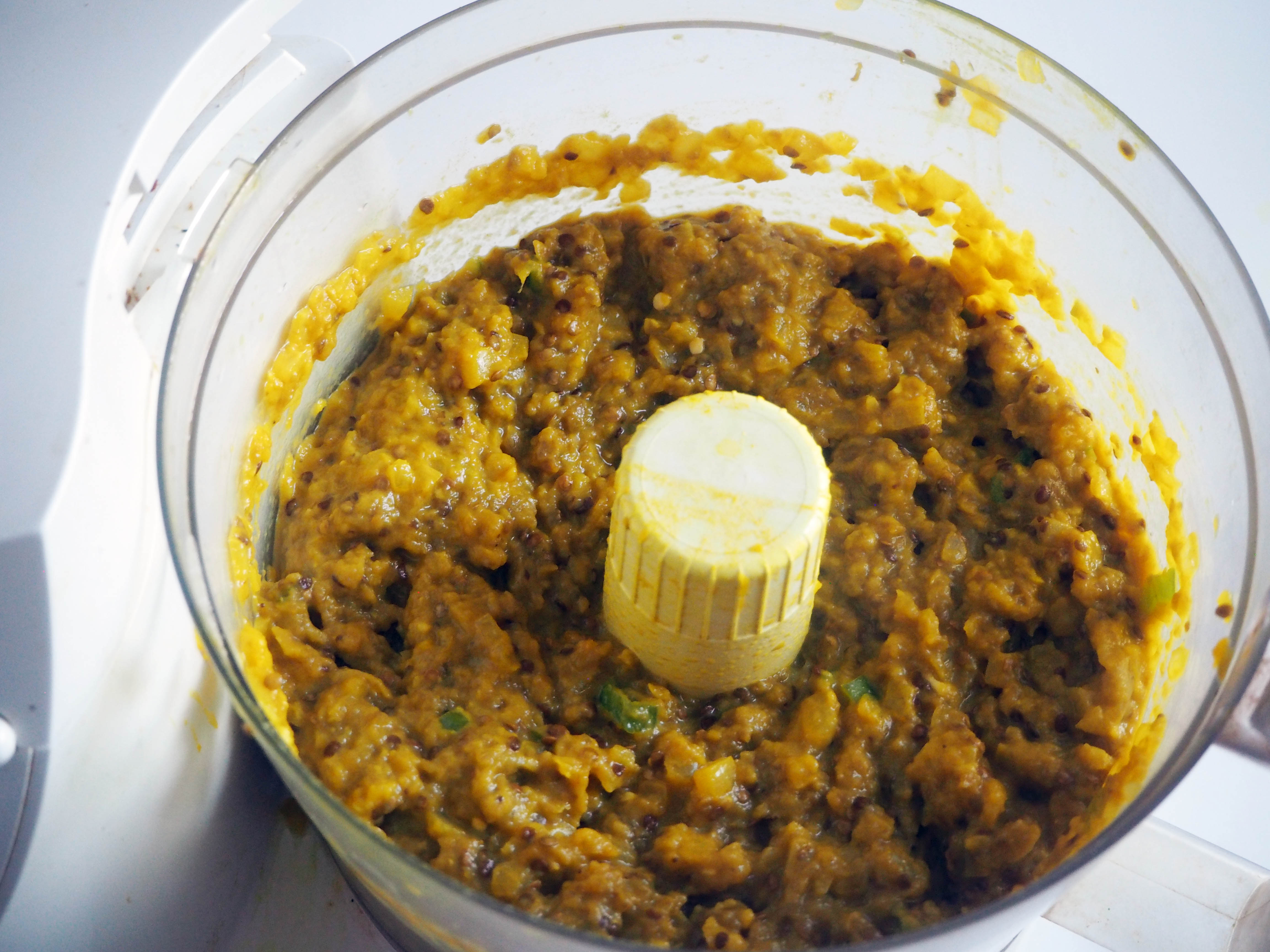 7. Transfer the mixture into a food processor. Add yogurt and green chili pepper and process until you get a rather smooth paste.