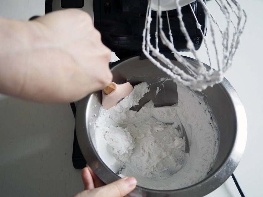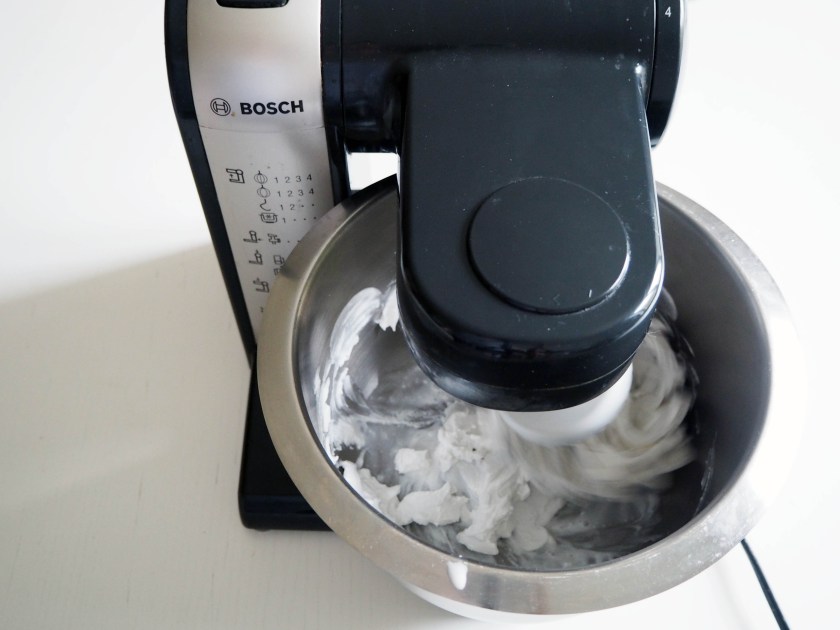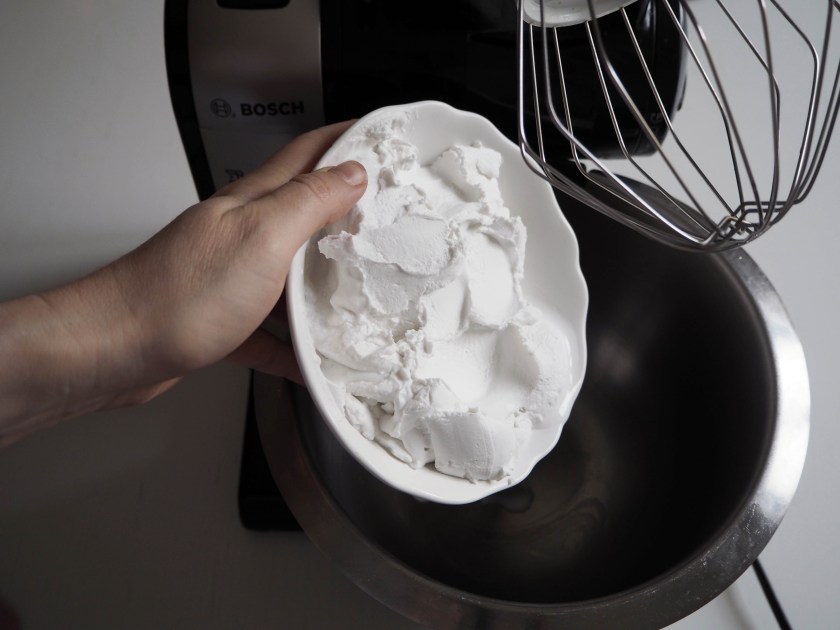 4. Put the coconut cream into the bowl of an electric mixer and whisk in high speed until you get stiff peaks (it took me about 3 minutes to do that). Scrape the sides of the bowl using a spatula in the end.