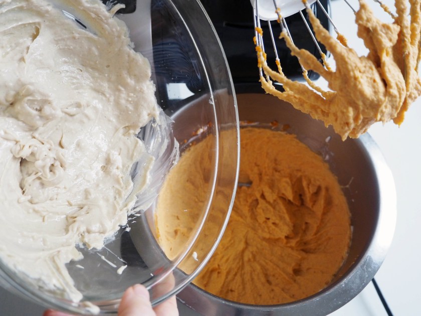 5. Add pumpkin puree and continue whisking for a couple more minutes, until both ingredients are mixed well.