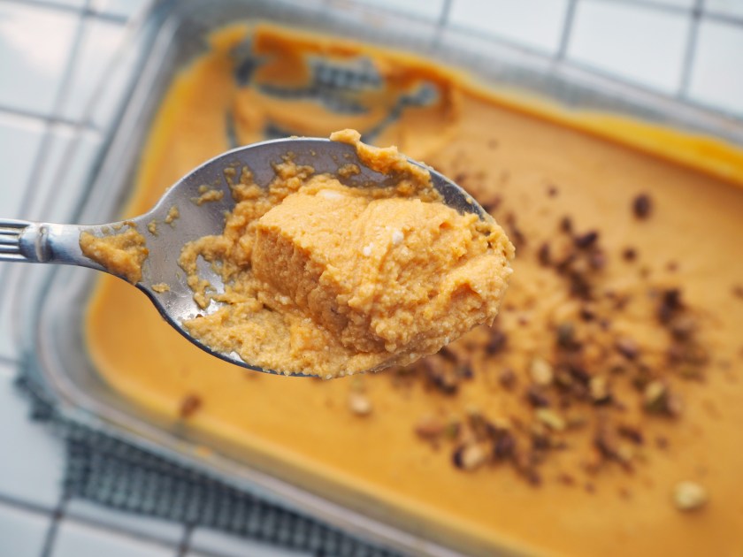 I wrote above that it is not cheap, especially because of the vegan white chocolate. It is delicious all by itself as any chocolate, however it will be way costly than regular white chocolate. The other rather expensive ingredient is the canned pumpkin, at least here in Helsinki, but of course you can totally make pumpkin puree yourself if you cannot find it or if you’d like the challenge.
