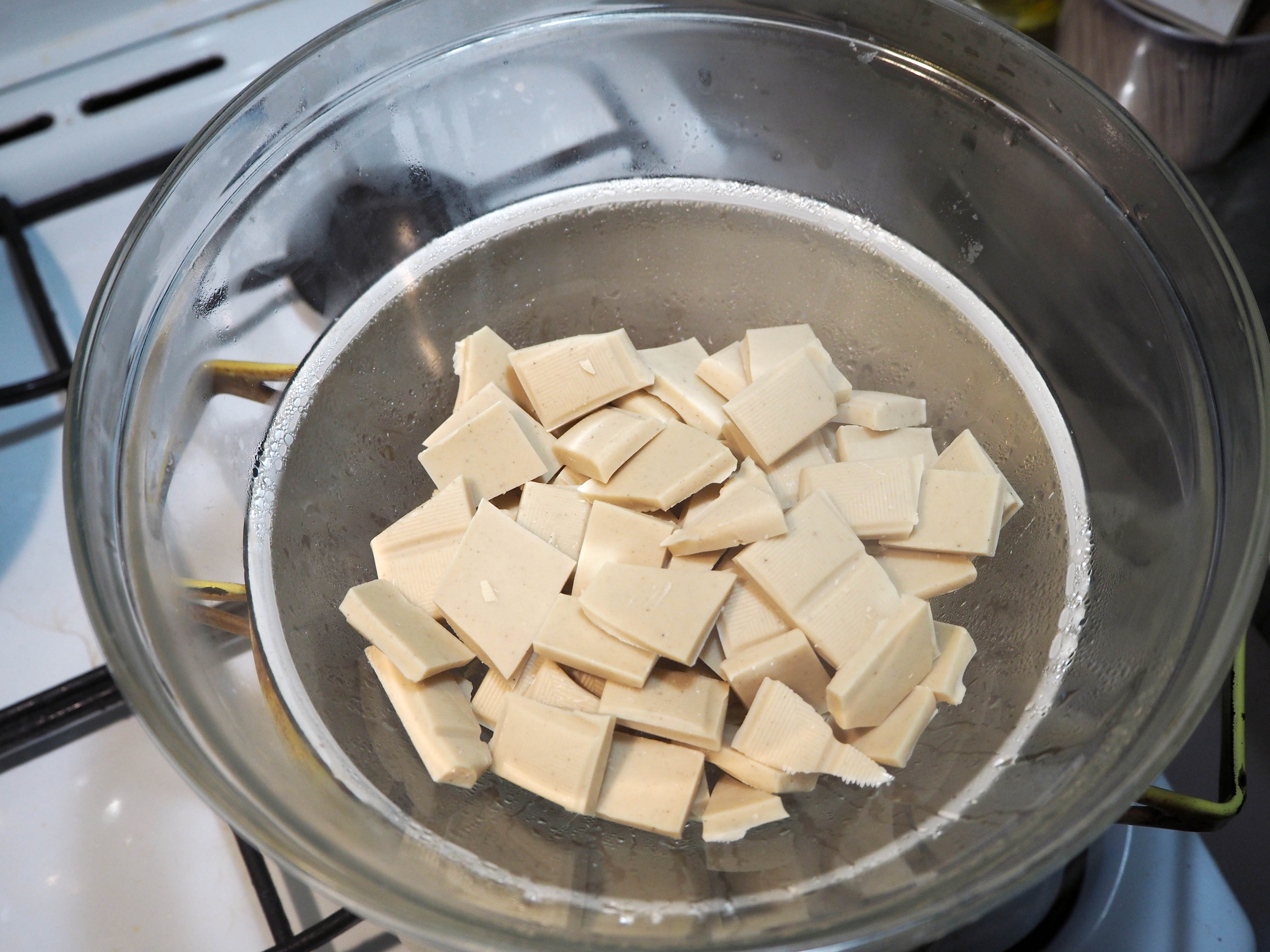 3. Put the bowl with chocolate on top of pot with water and melt the chocolate in bain-marie style, then take away from the heat and put aside.