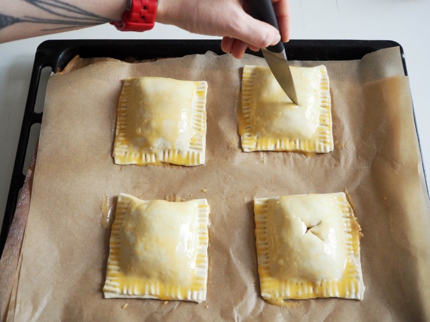 11. Transfer the parcels on an oven tray with a baking paper. Press a fork on the three sealed edges of each parcel. This will both create a nice shape and seal the parcels better. Brush the surface of each parcel with egg yolk. Using a sharp knife, cut an x shape on the surface of each parcel, to let the steam escape from inside while baking. Put in the oven, in medium rack for about 30 minutes, until the top of each parcel gets golden. I put the tray on top rack of the oven for the last 5 minutes to get the surface more golden, you can also try that. Let the parcels cool down for at least 15-20 minutes on a wire rack before serving. Enjoy!