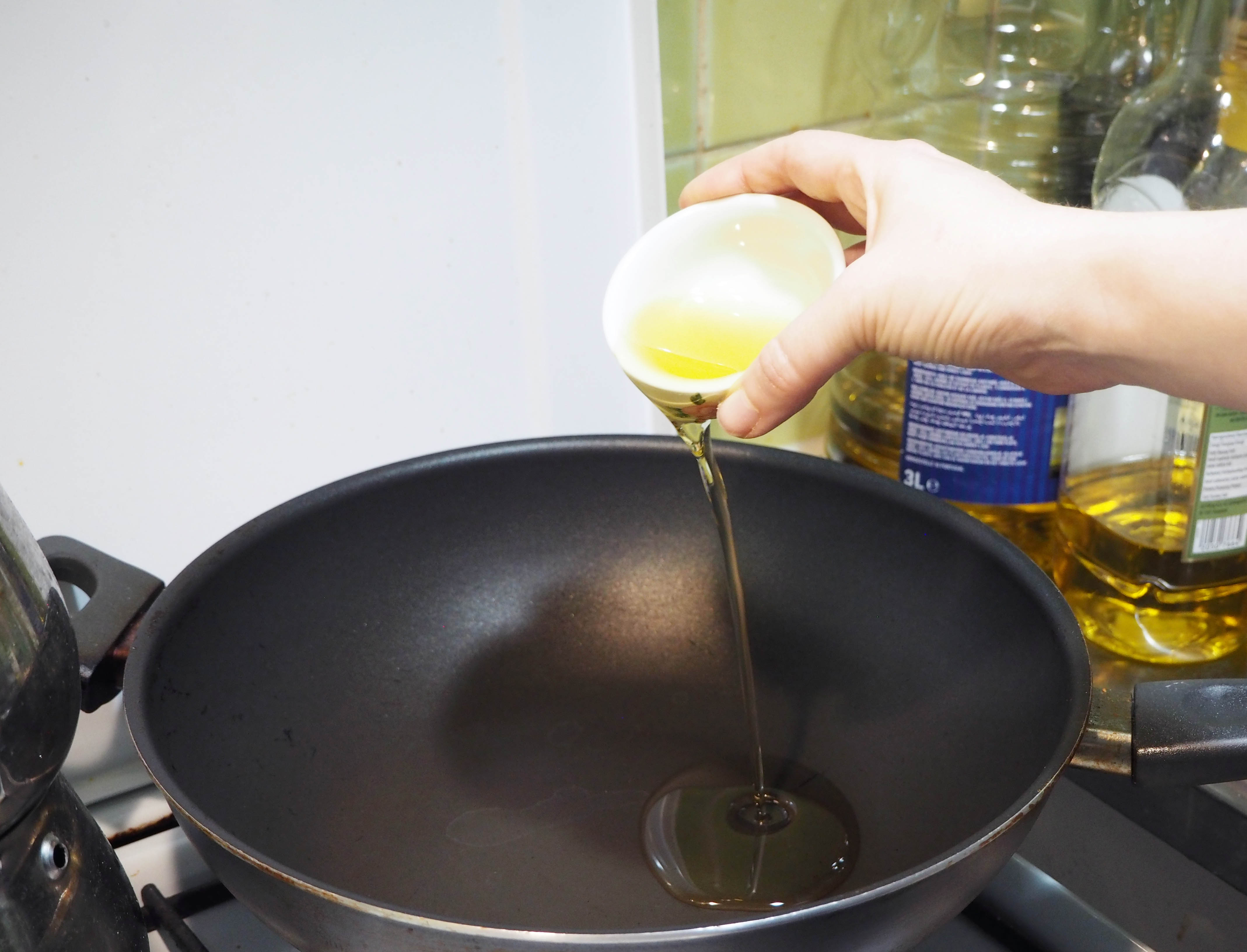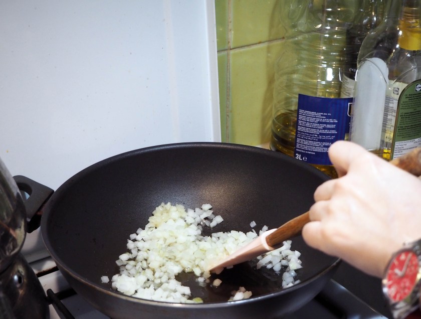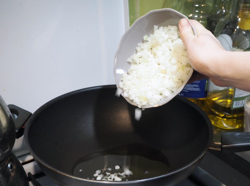2. In a large pan, put olive oil and heat it on medium high heat for about 20 seconds, then add onion and sauté for about 3 minutes, until it starts to get translucent.