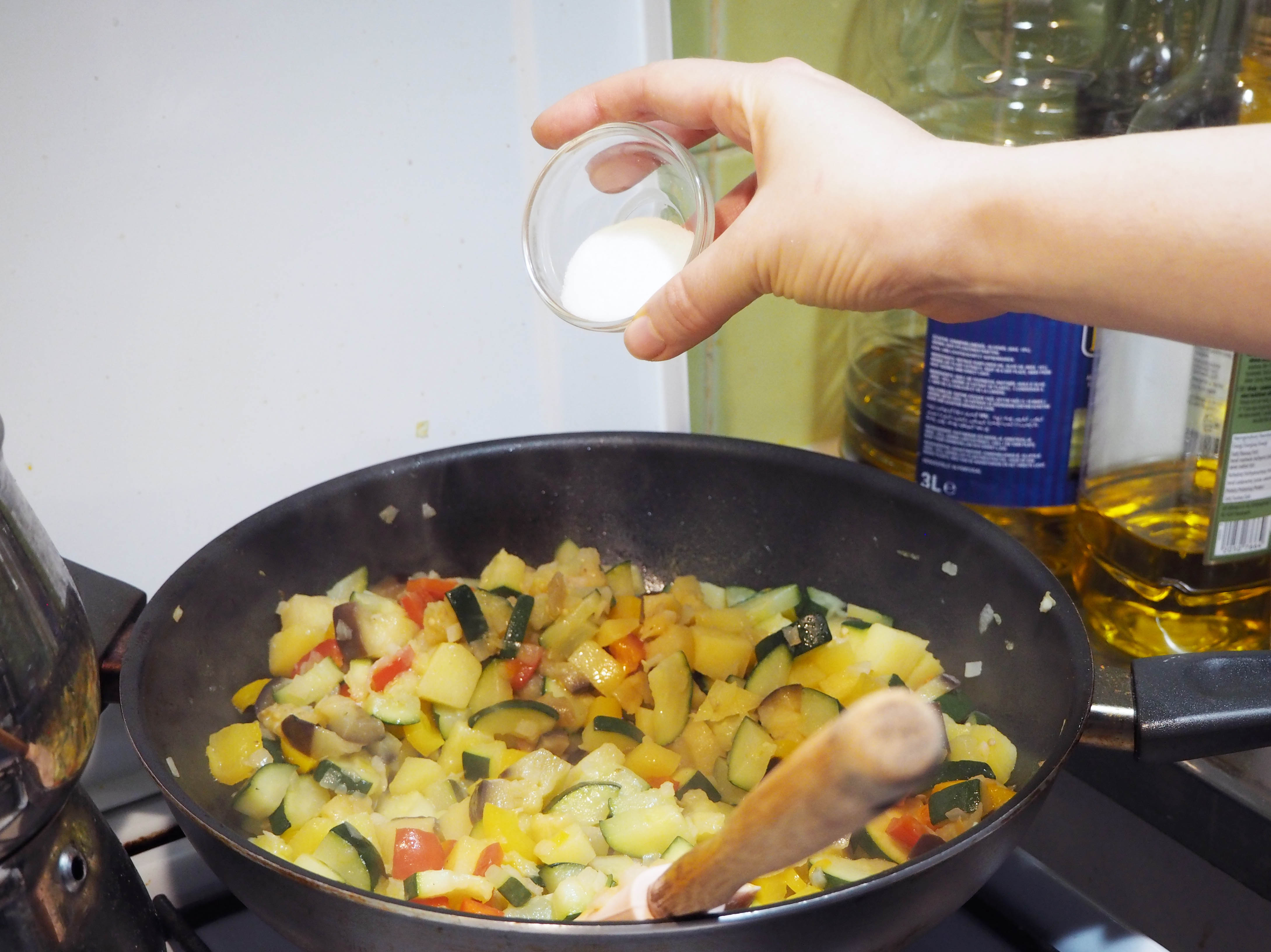 5. Add eggplant and zucchini and continue to cook, stirring frequently, until all vegetables are soft and cooked (takes about 12-15 minutes).