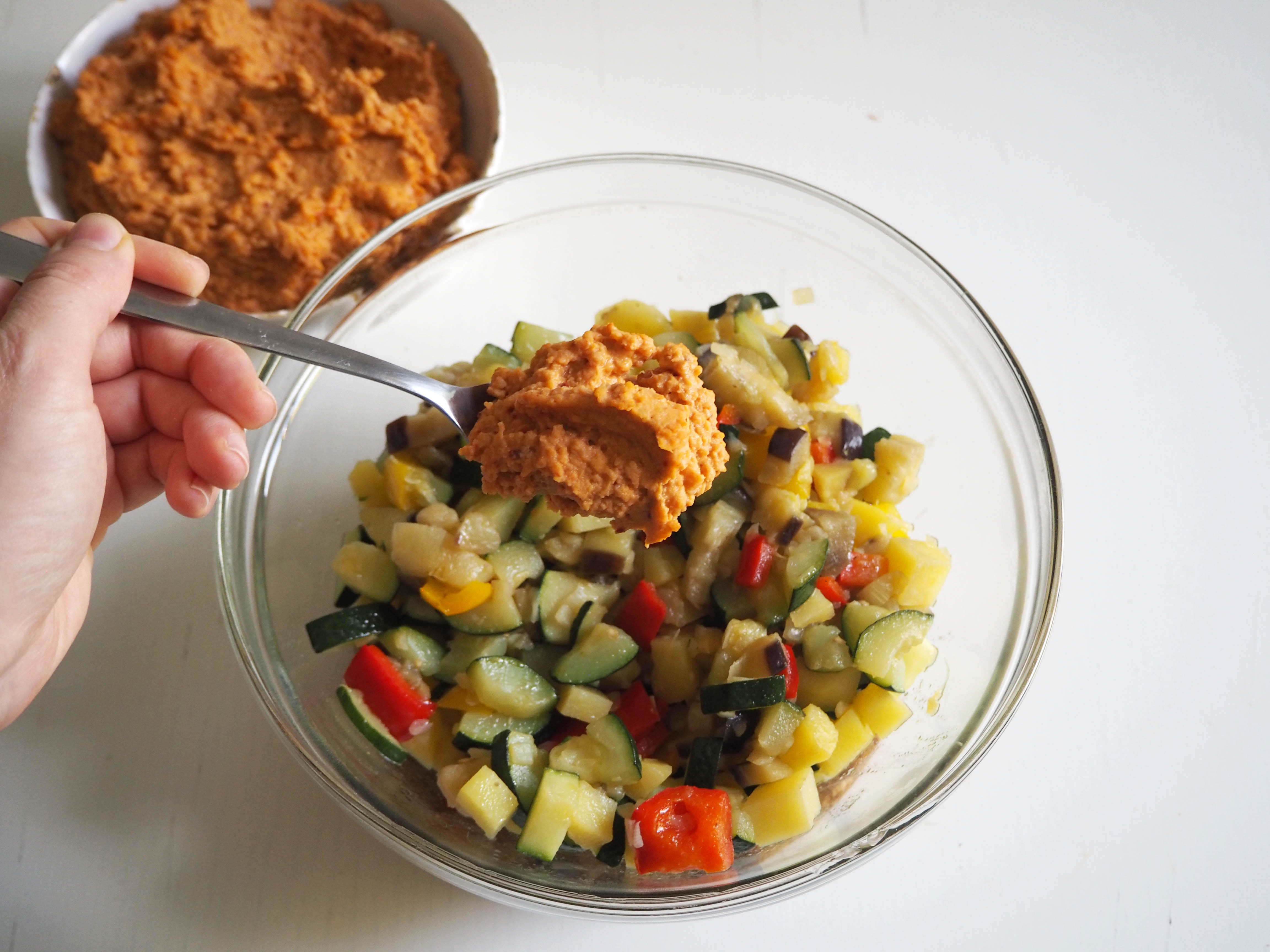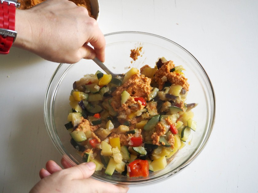 7. When the mixture is cooled down, add about 1.2 dl (or 1/2 cup) of pomegranate hummus to the mixture and mix well.