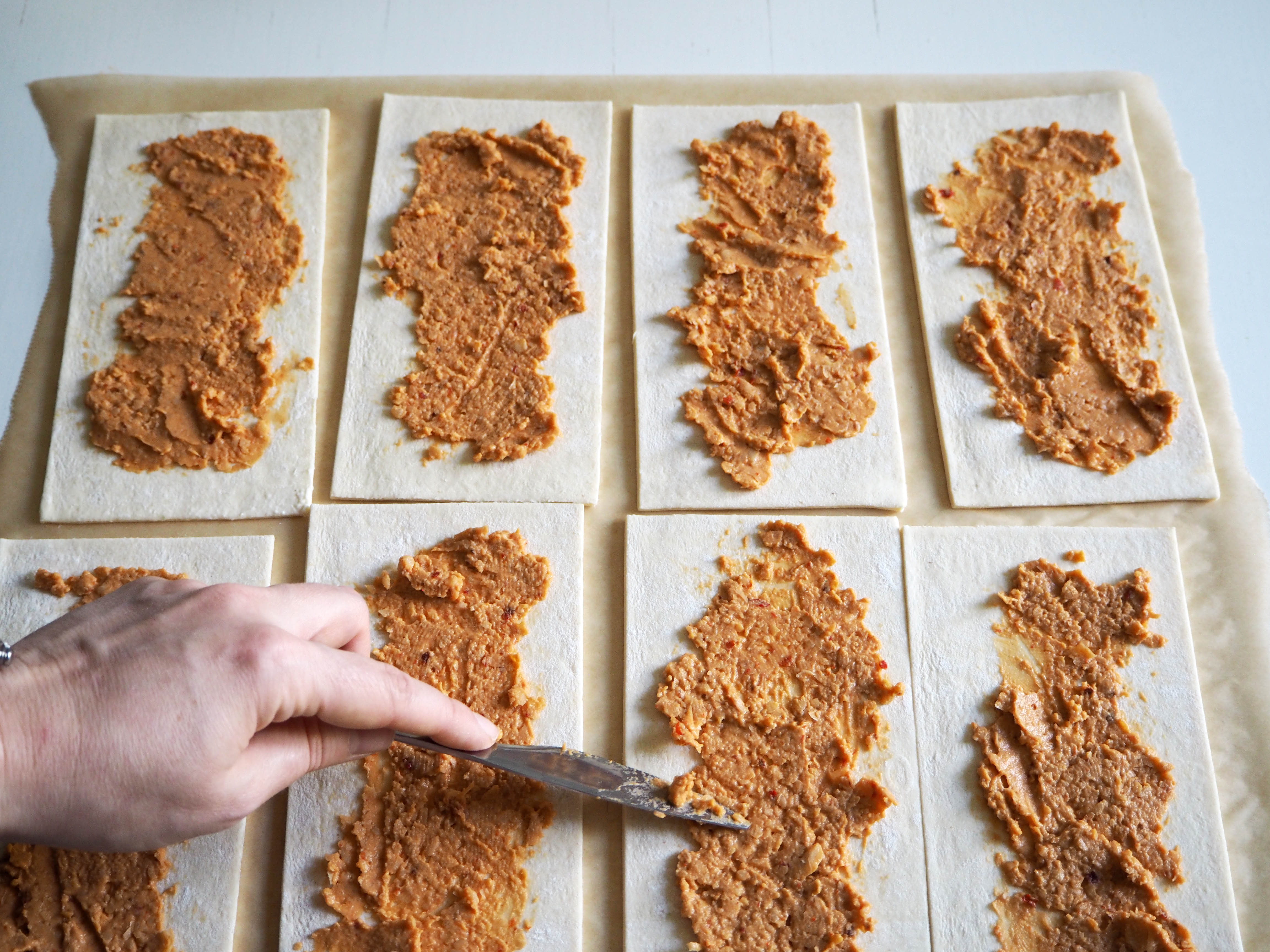 8. Spread remaining hummus on pastry sheets, leaving at least half cm empty space from the edges.