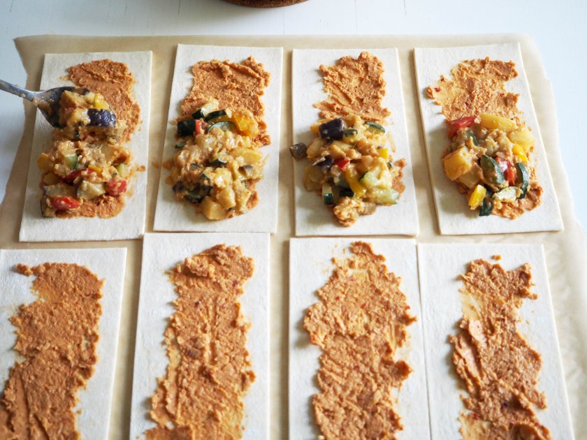 9. On top of half of the each sheet, put about 2 tbsp of vegetable mixture.