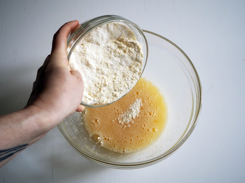 3. Add flour mixture and lemon zest and continue to whisk well.