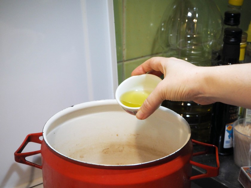 1. Put olive oil in a medium size pot and put it on medium high heat. Add onion and sauté for about 5 minutes, until it gets translucent.