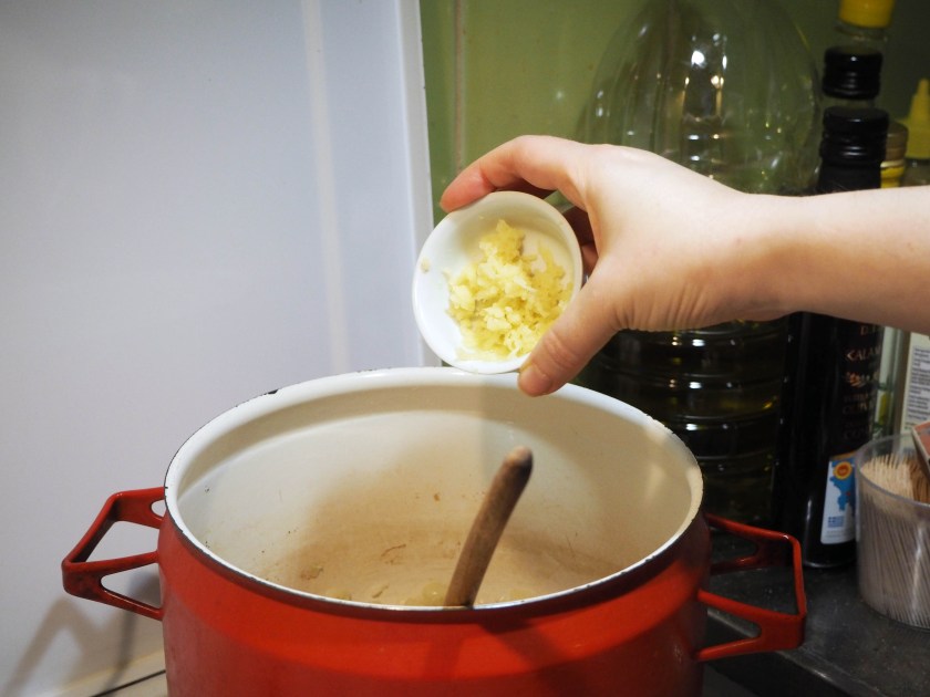 2. Add grated ginger and continue to sauté for 1-1.5 more minutes.