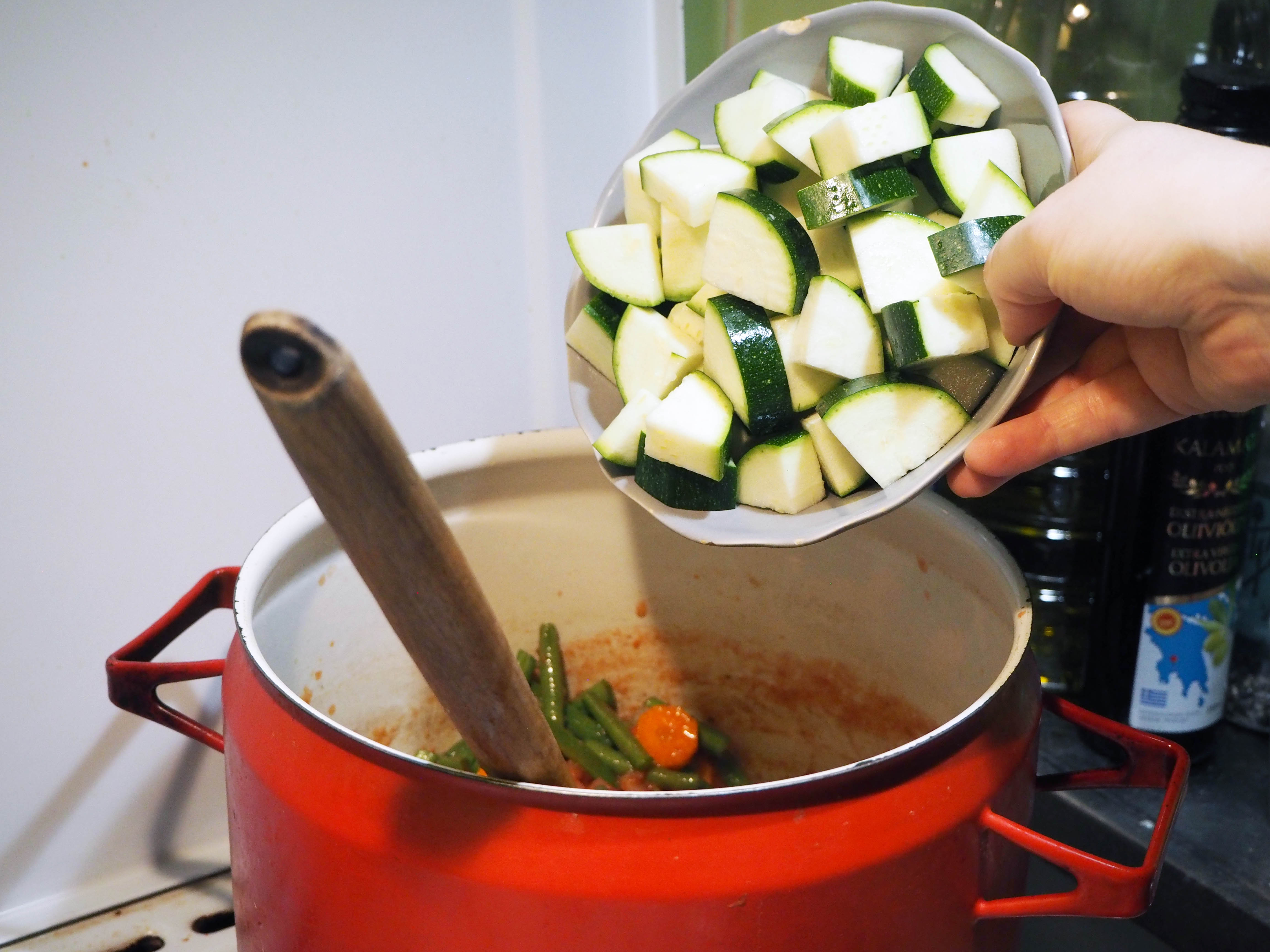 4. Add carrots, green beans and zucchini and stir well.
