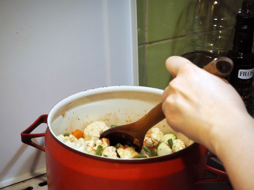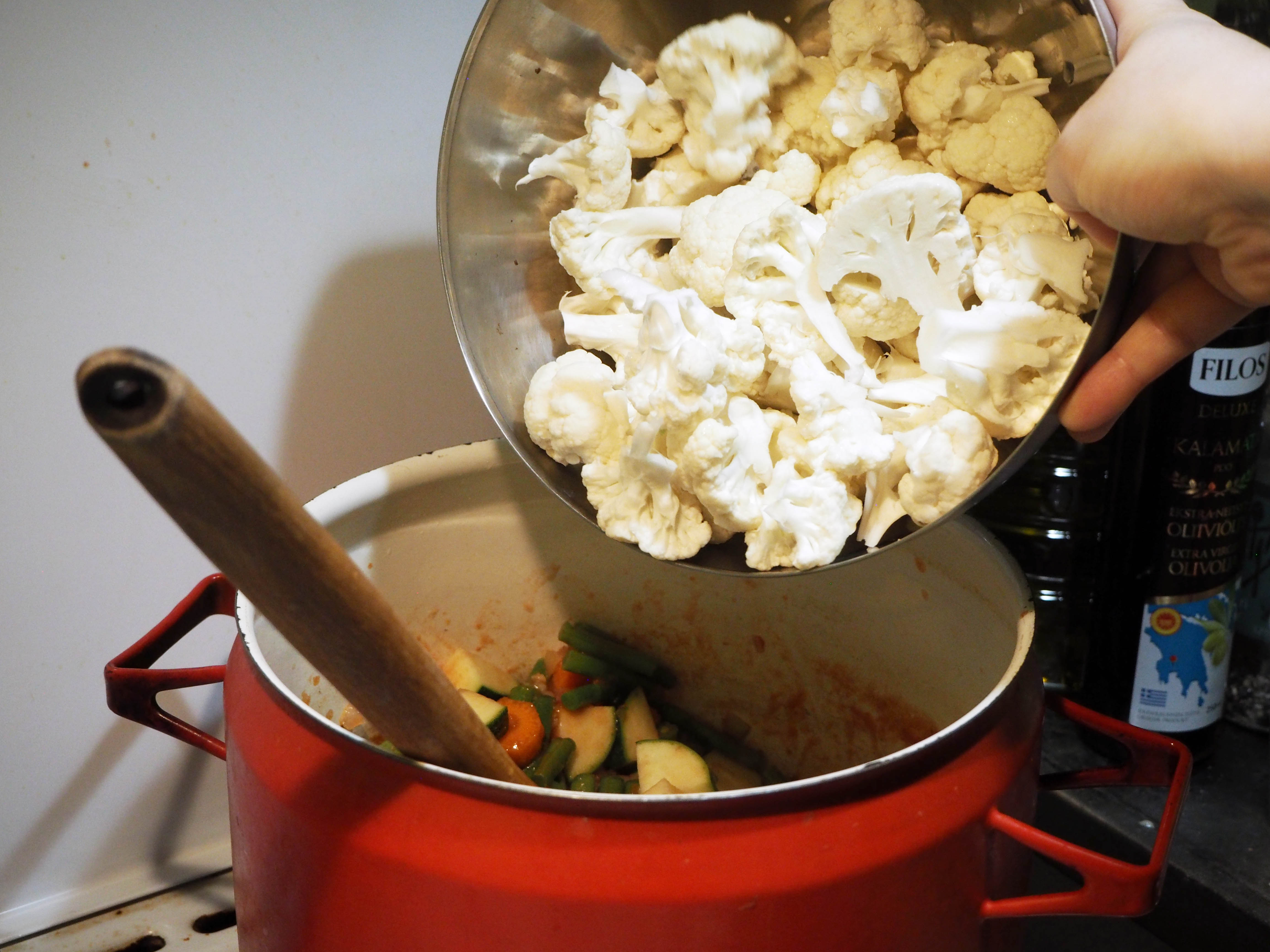 It is very easy to cook this dish. The most important thing is to have all pieces of vegetables more or less the same size. If you don’t, then they will not cook evenly. Especially cauliflower may get mushy if you cook it too much.