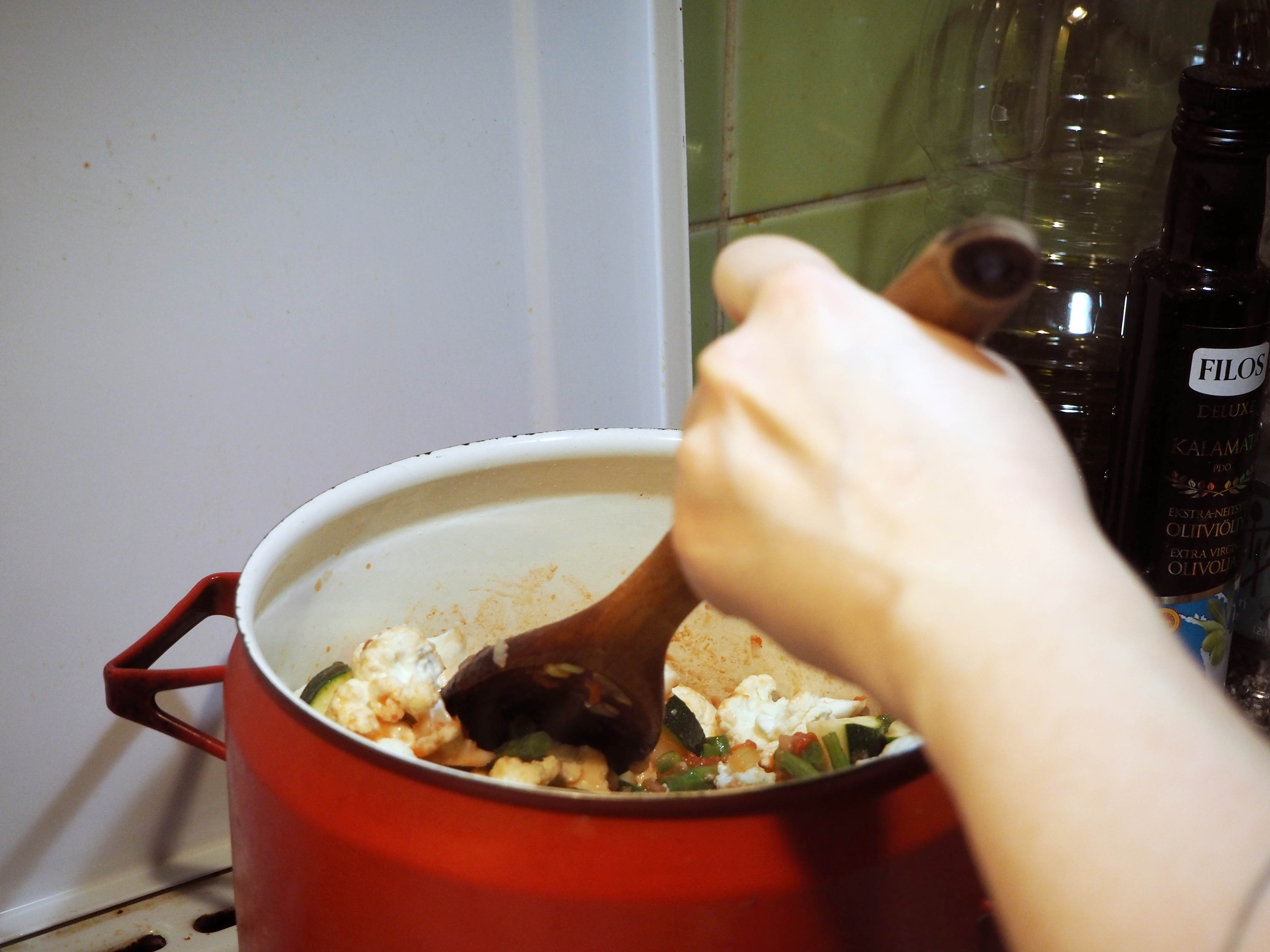 5. Add cauliflower and stir more.