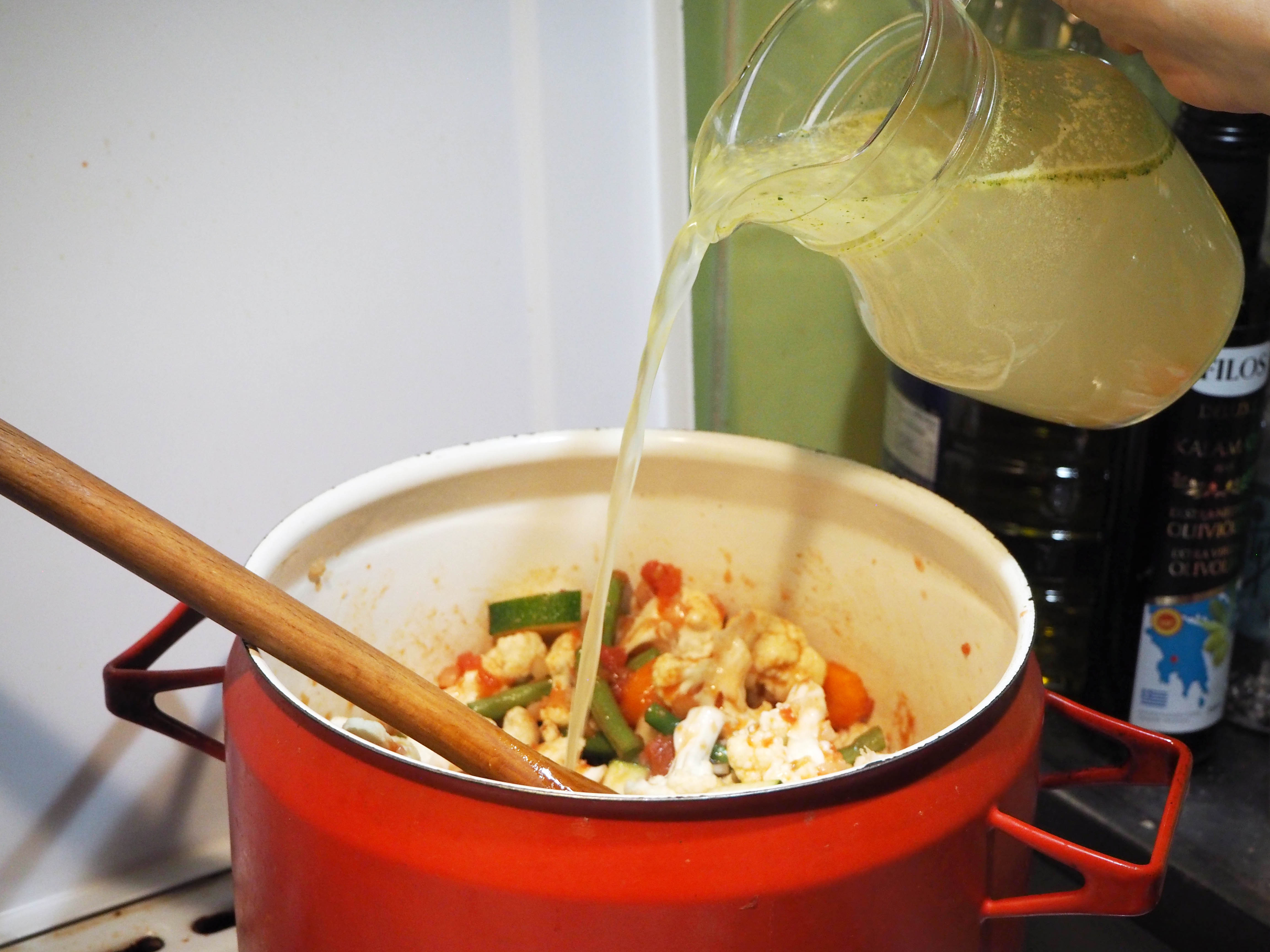 6. Add vegetable broth, stir and cover the pot.
