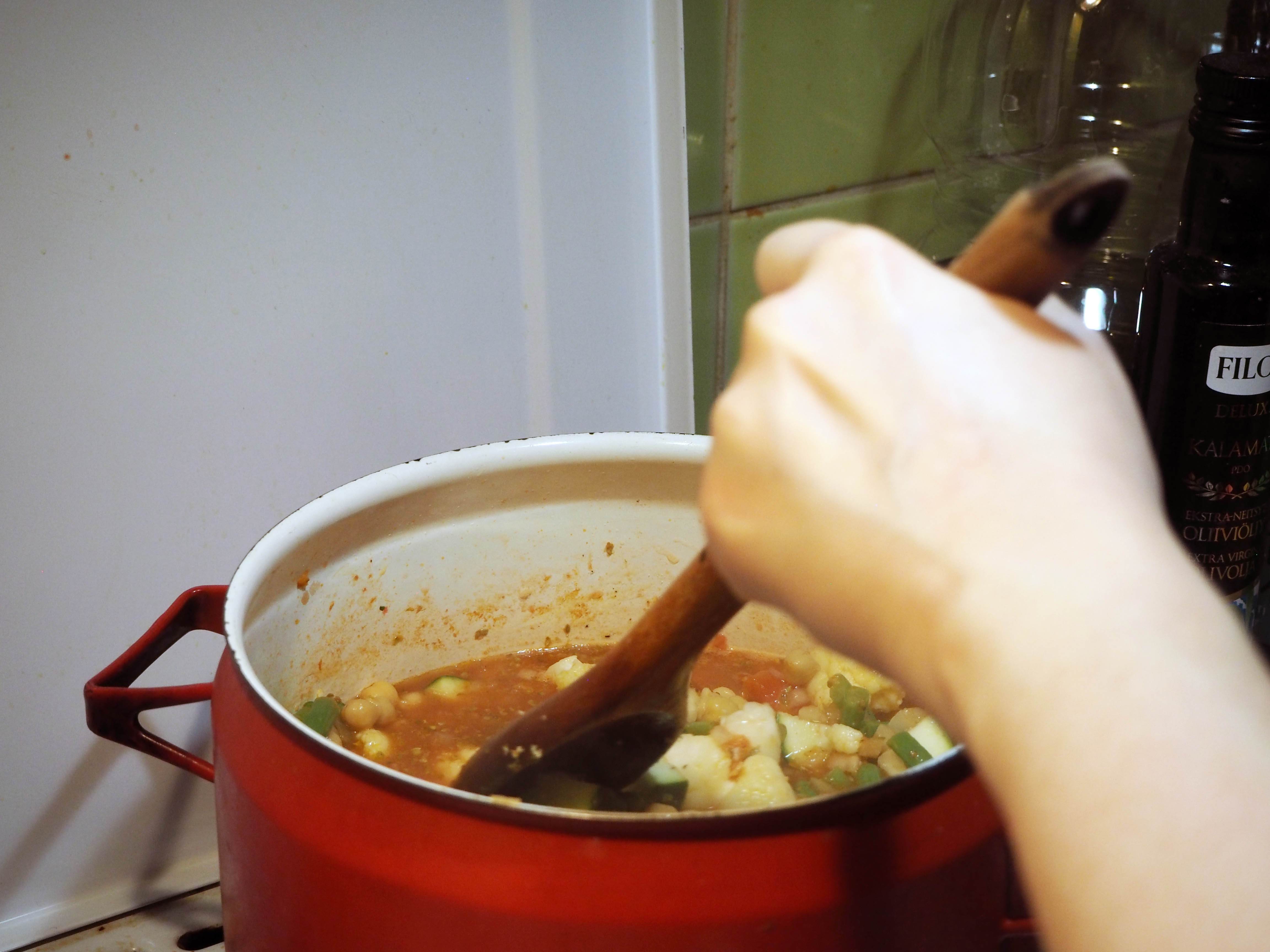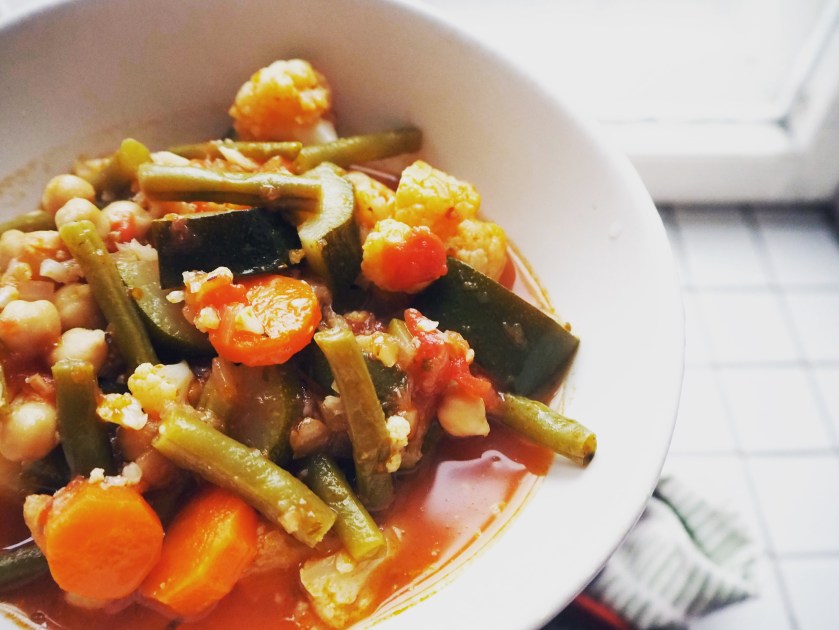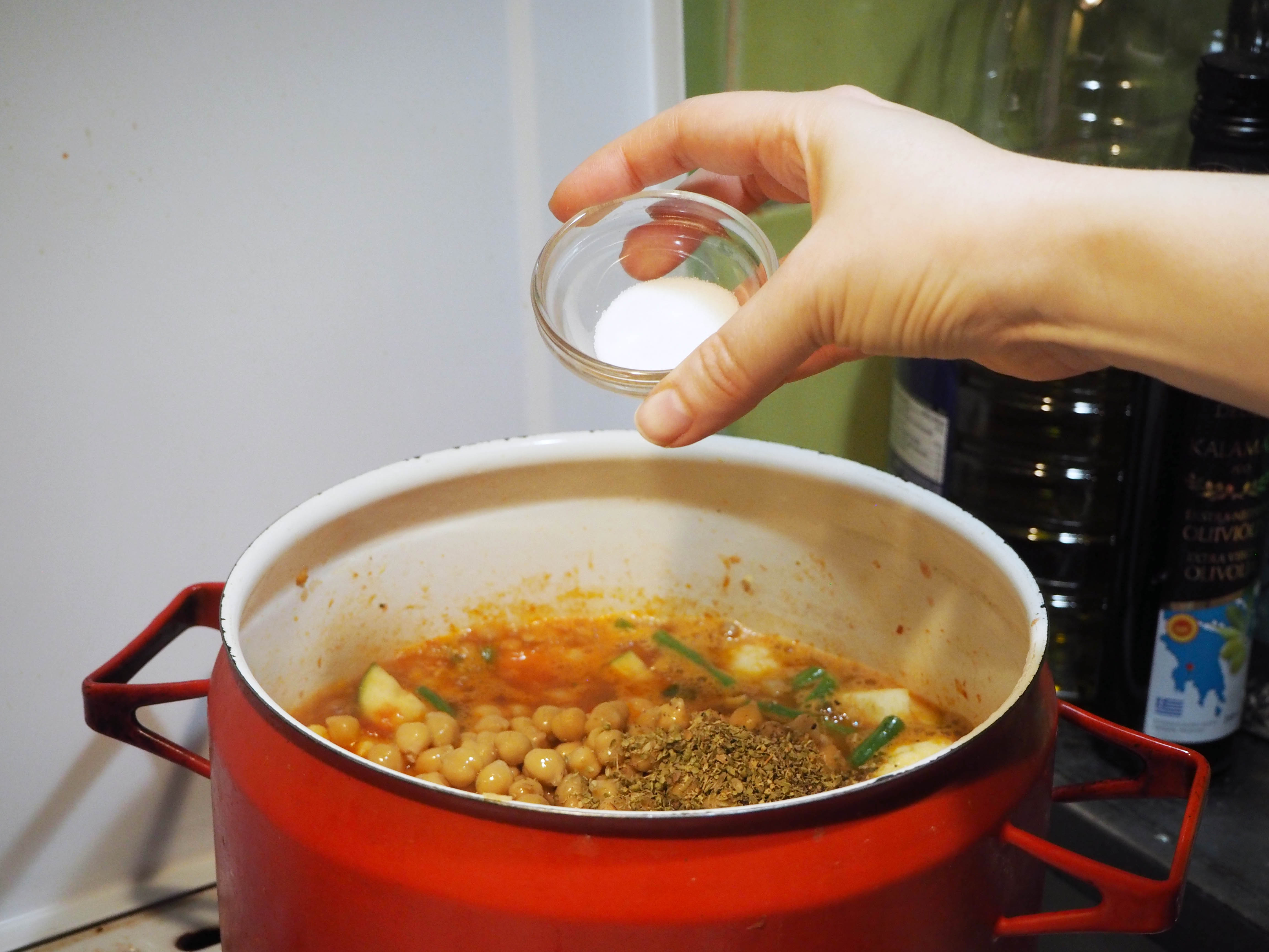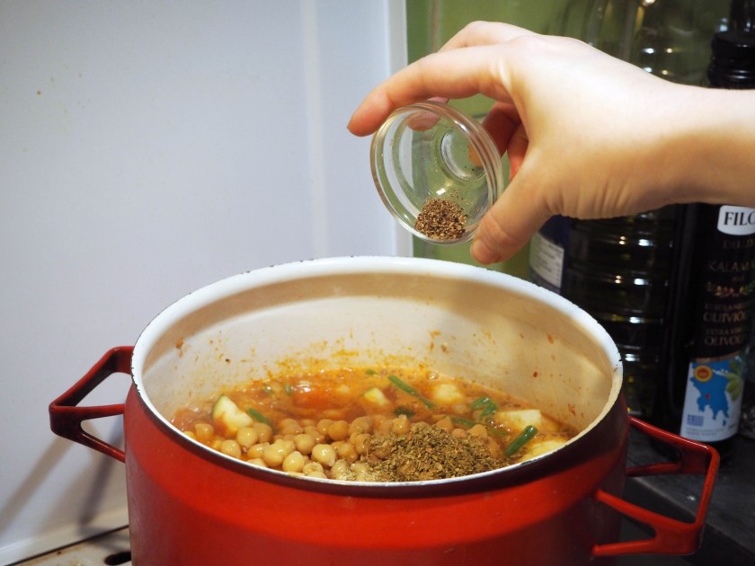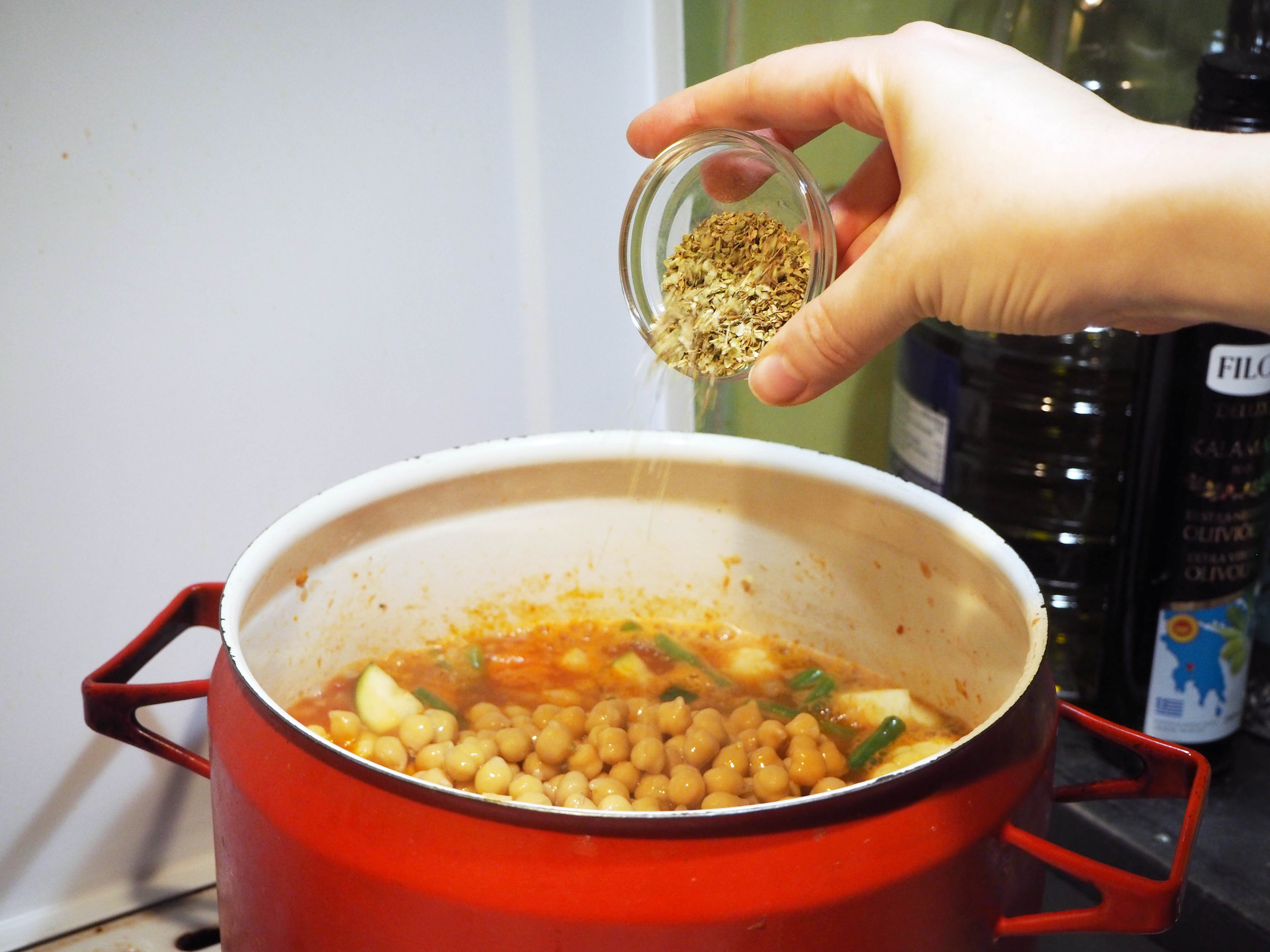7. When the stew is boiling, add chickpeas, oregano, salt and pepper and lower the heat to medium to continue cooking, with the lid on. Cook the dish for about 20 more minutes, or until all vegetables are evenly cooked (but not overcooked and got mushy). Enjoy!