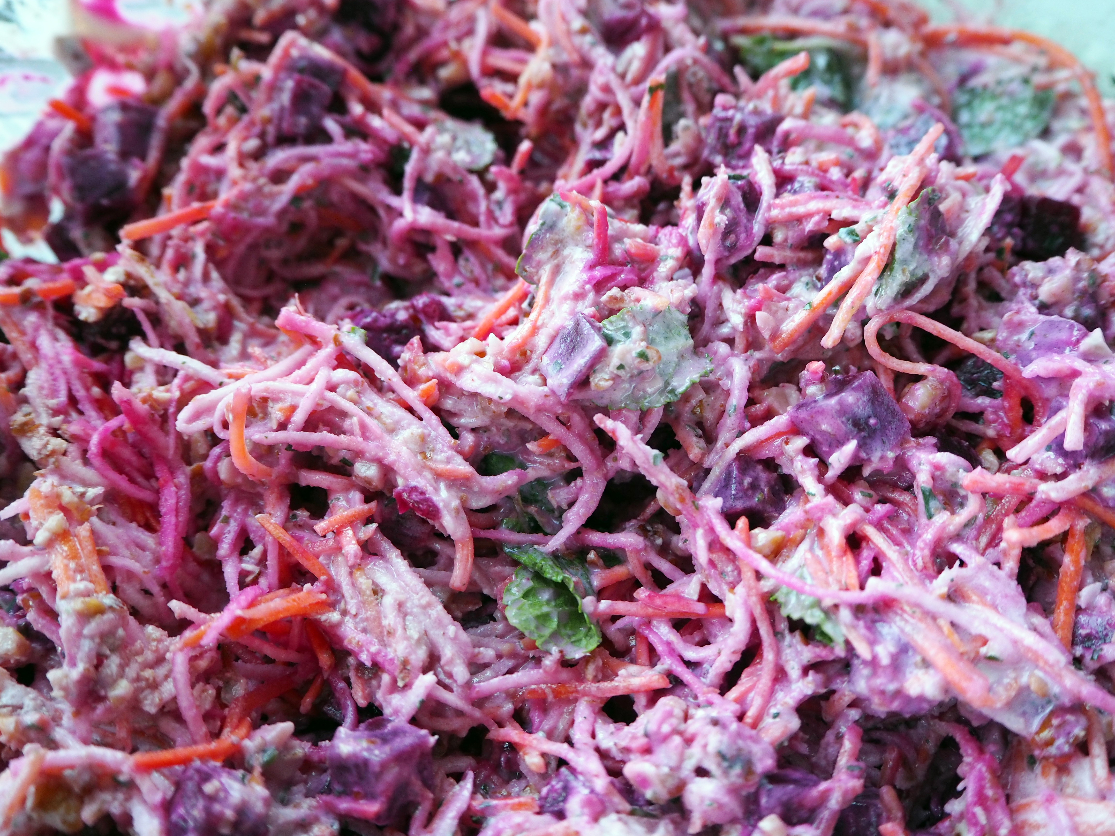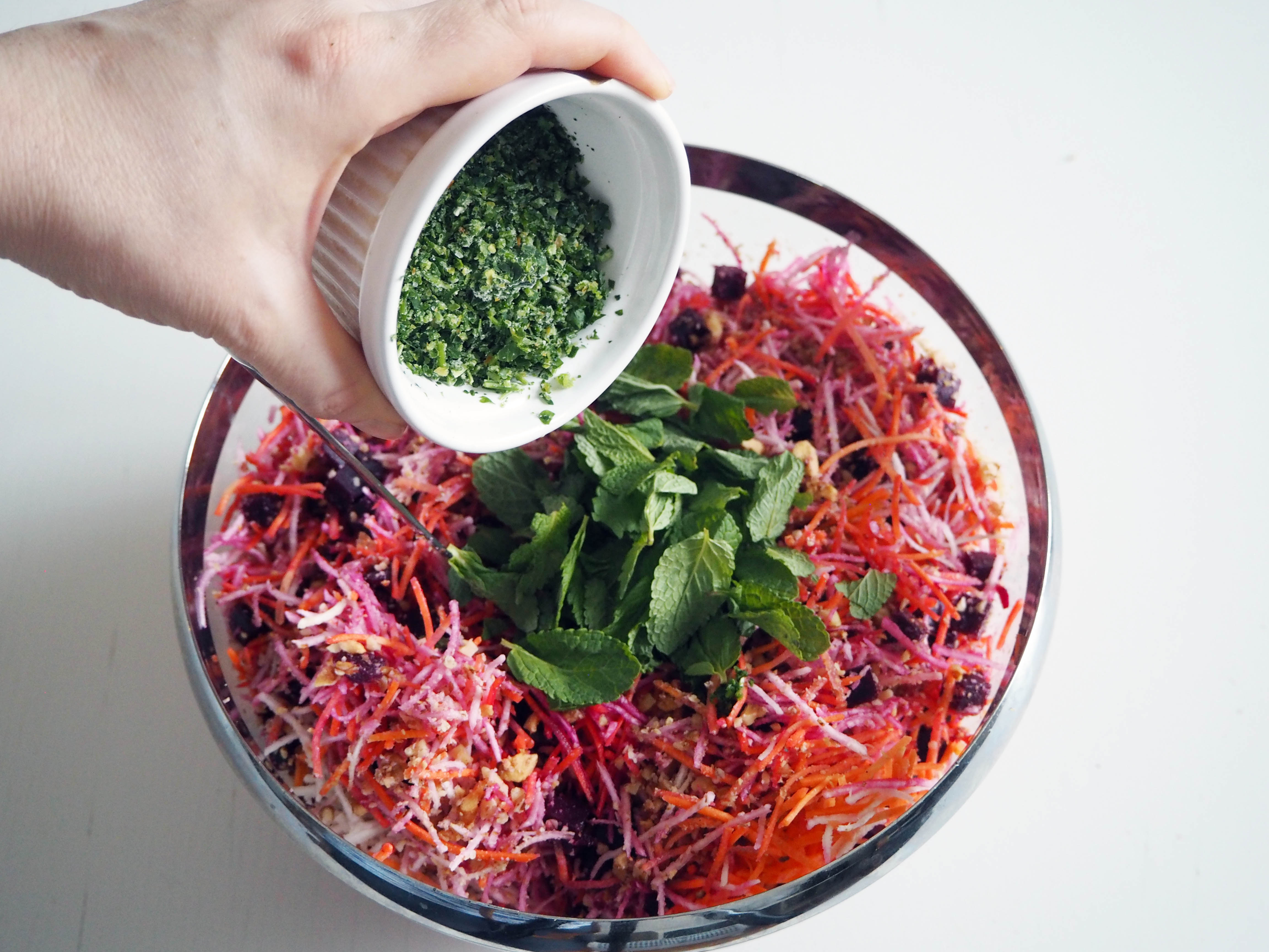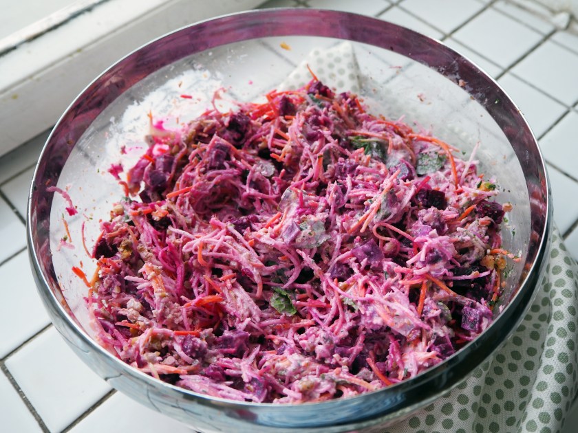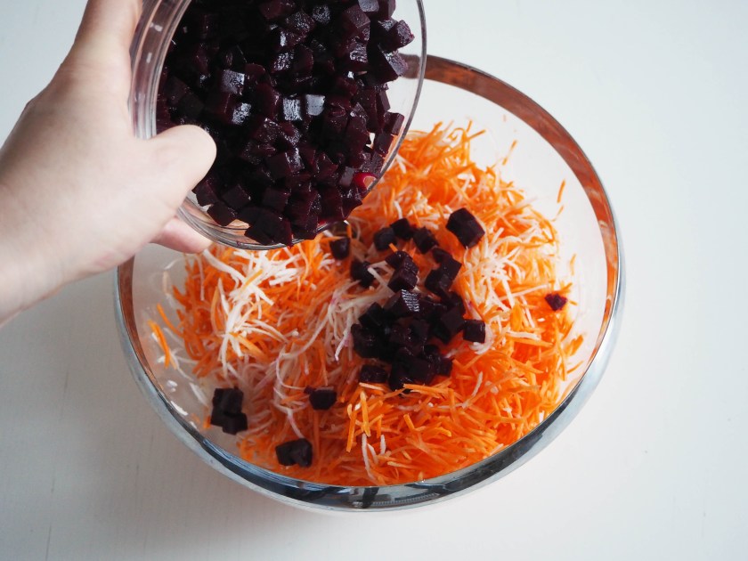 1. In a large salad bowl, put grated carrots, celeriac and beetroot and mix.