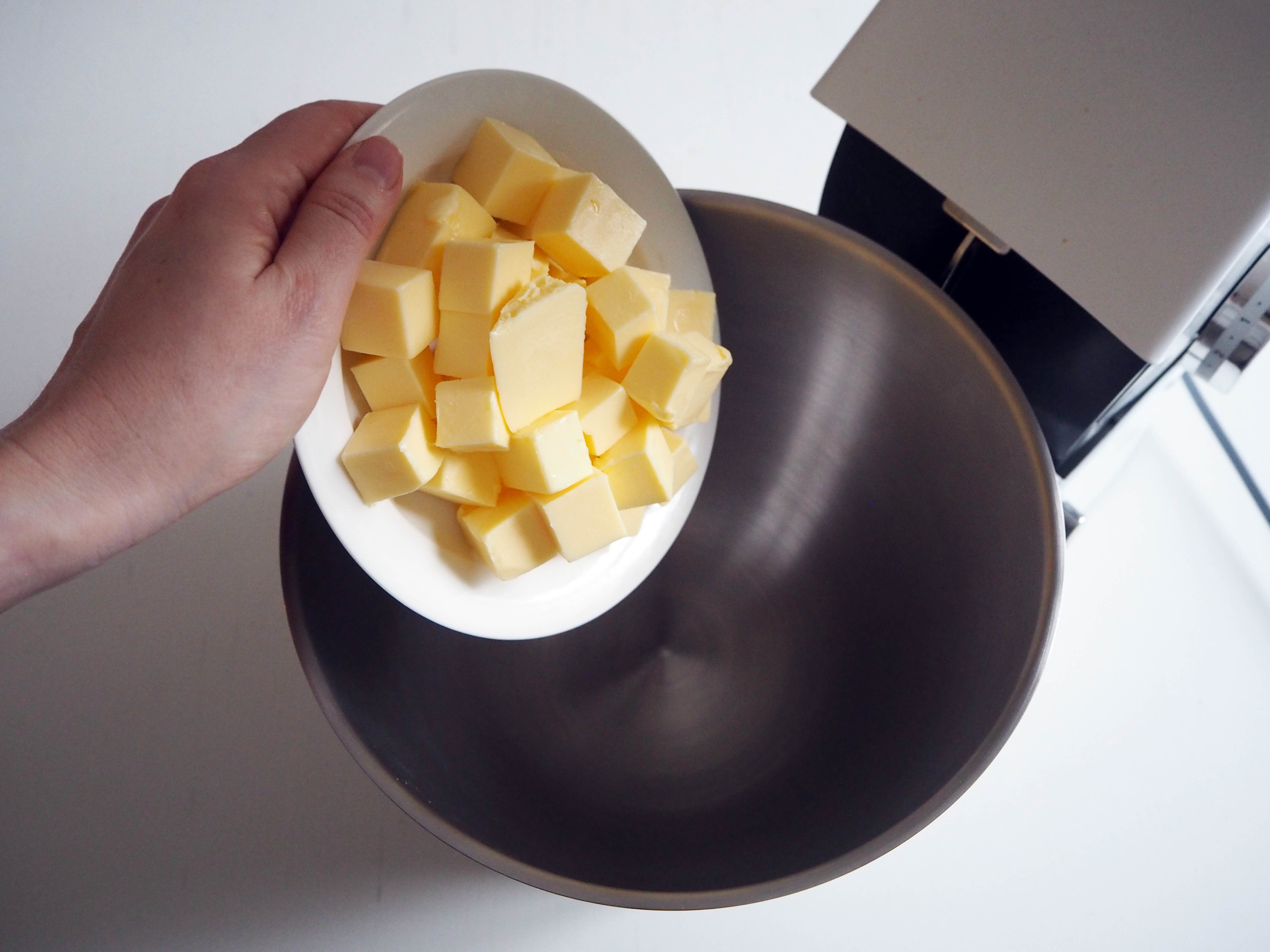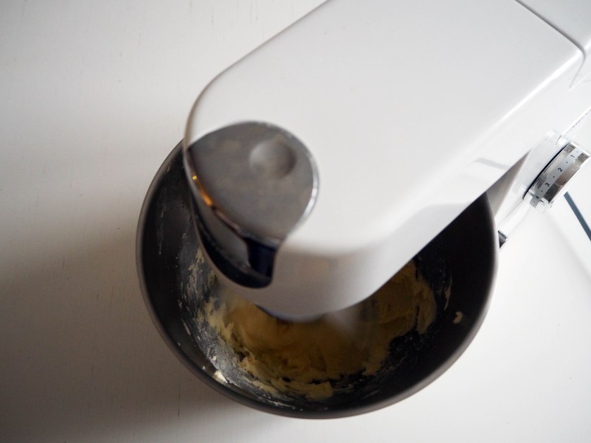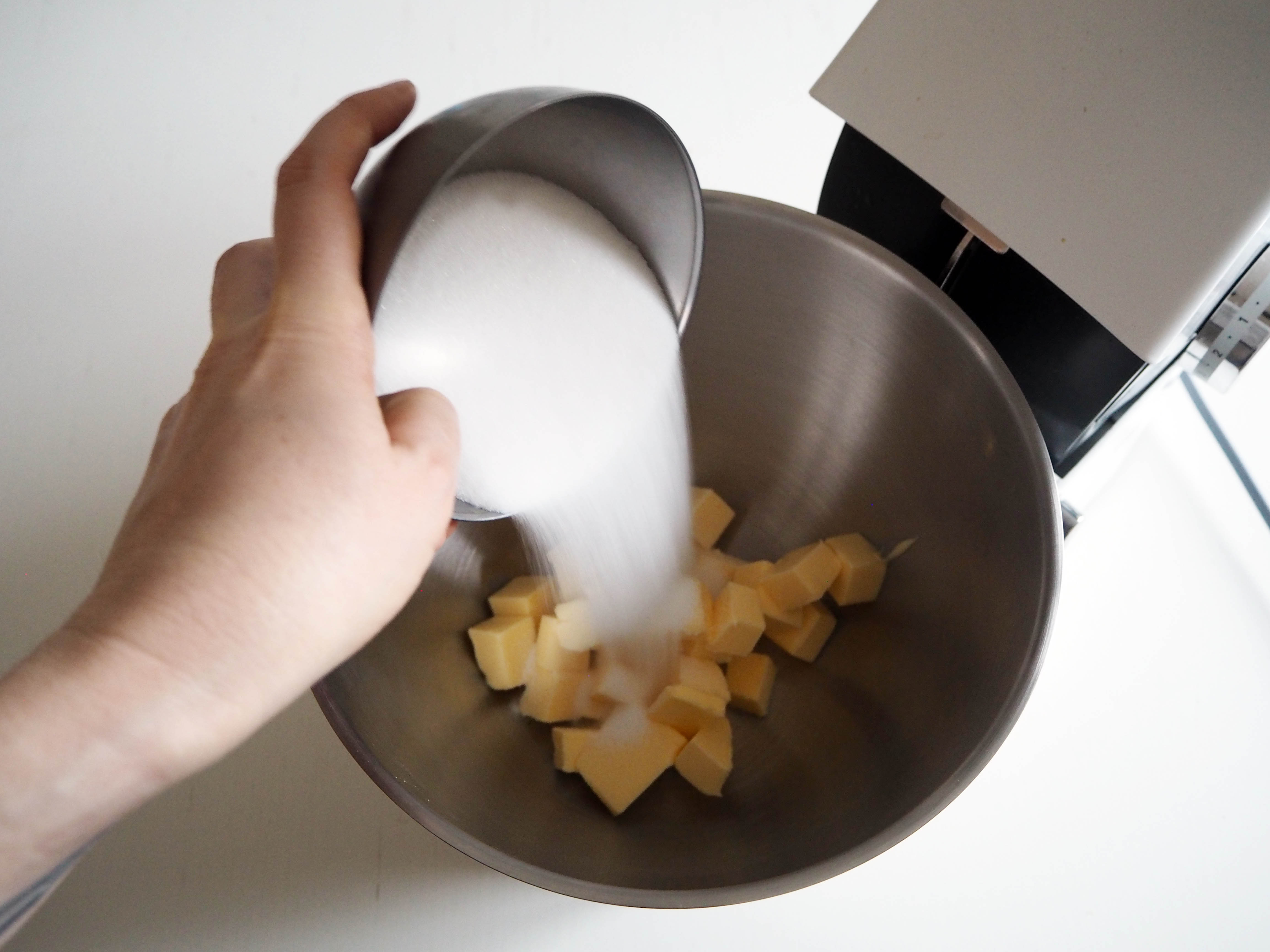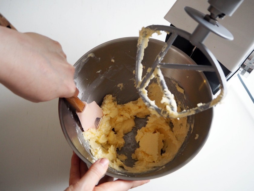 1. In a mixing bowl put softened butter and sugar and mix from slow to high speed until creamy, for about 3-4 minutes. Scrape the sides of the bowl when needed.