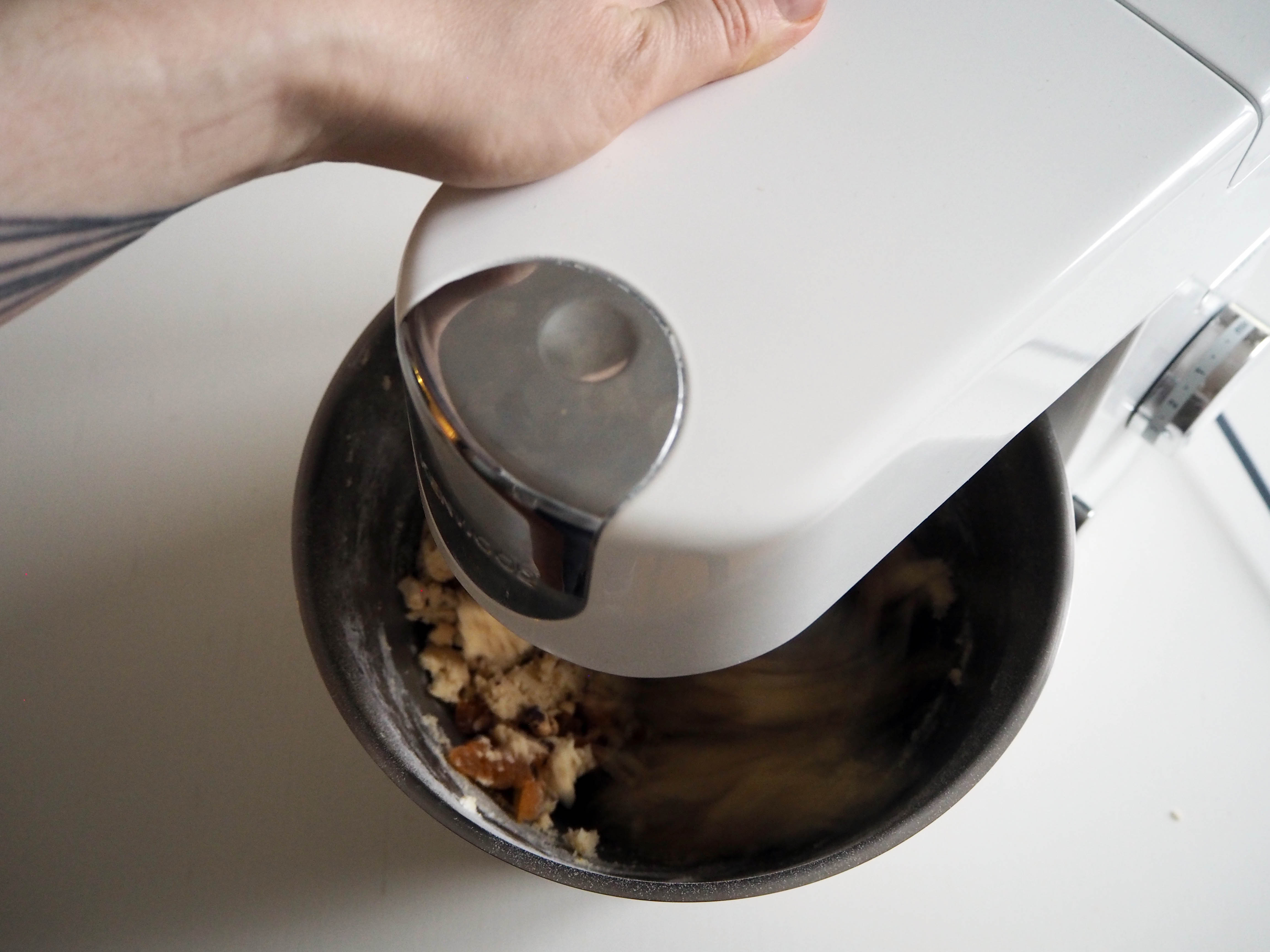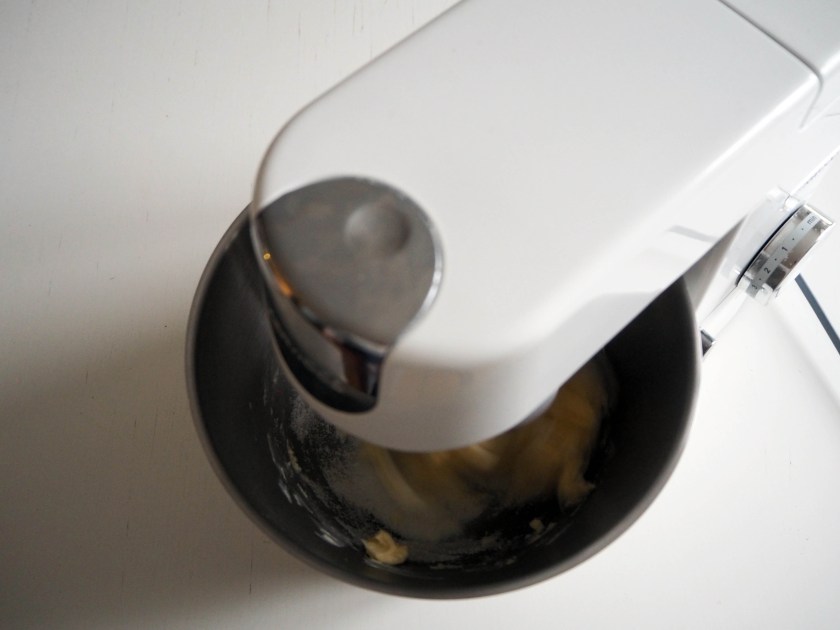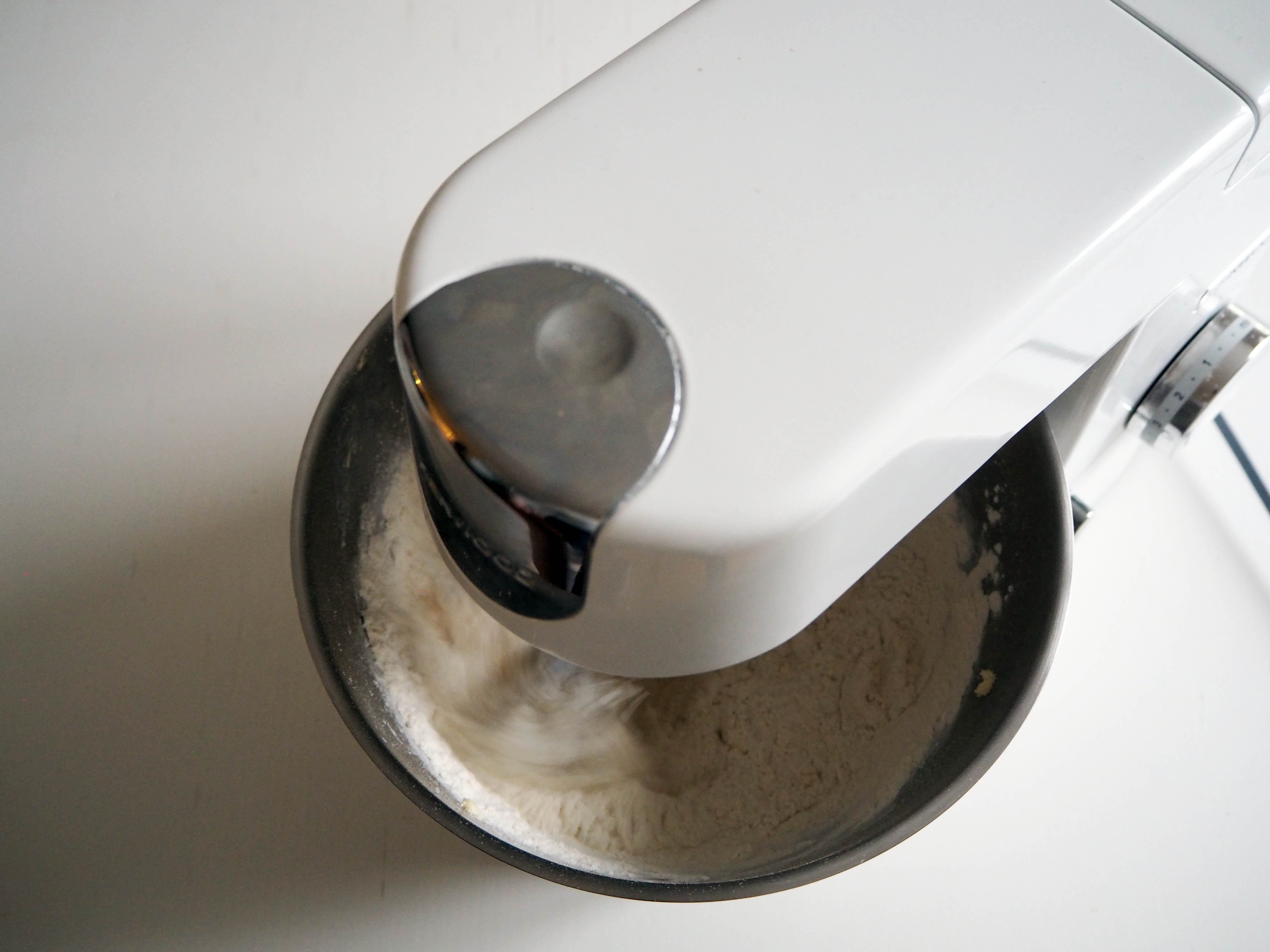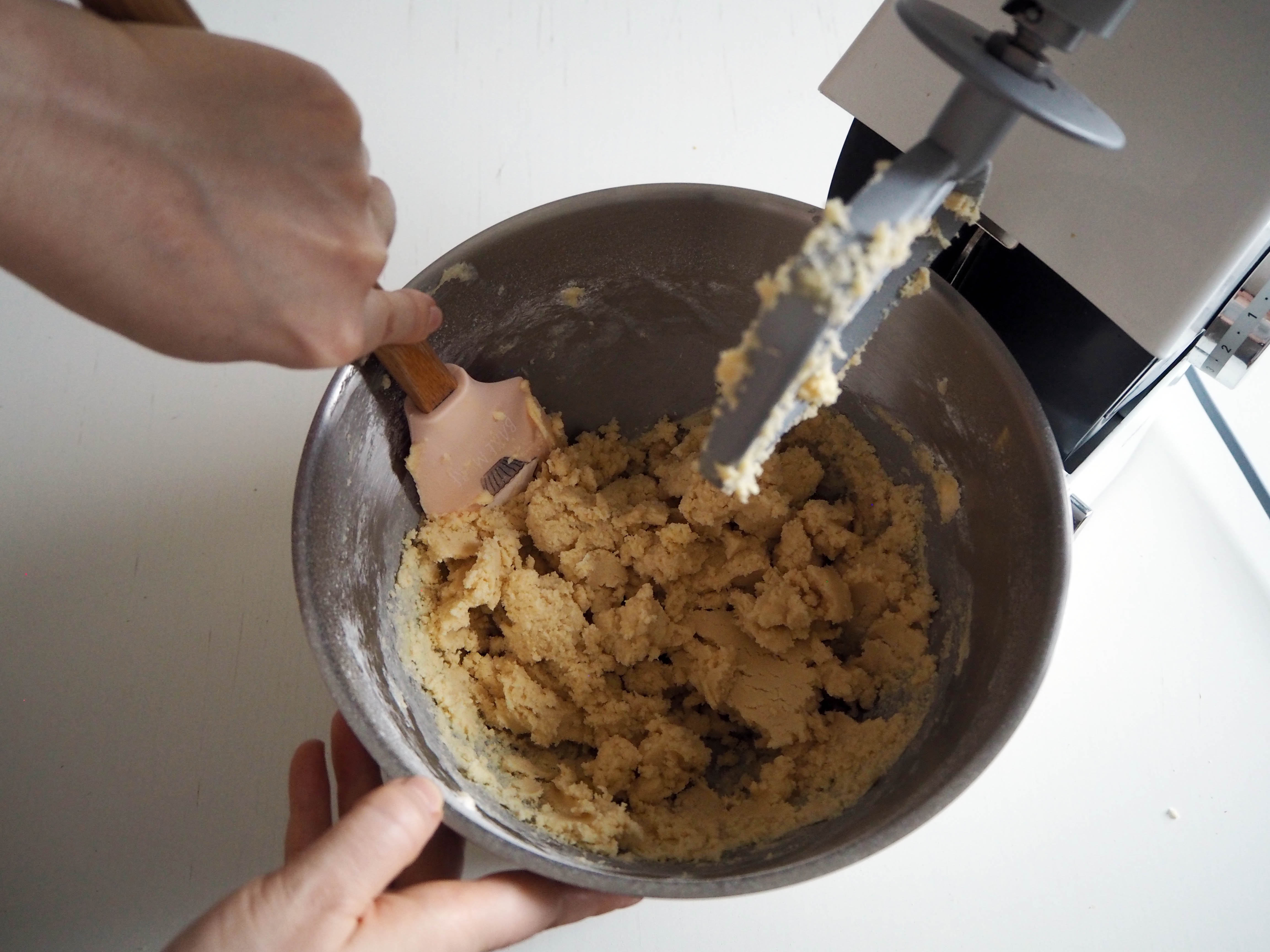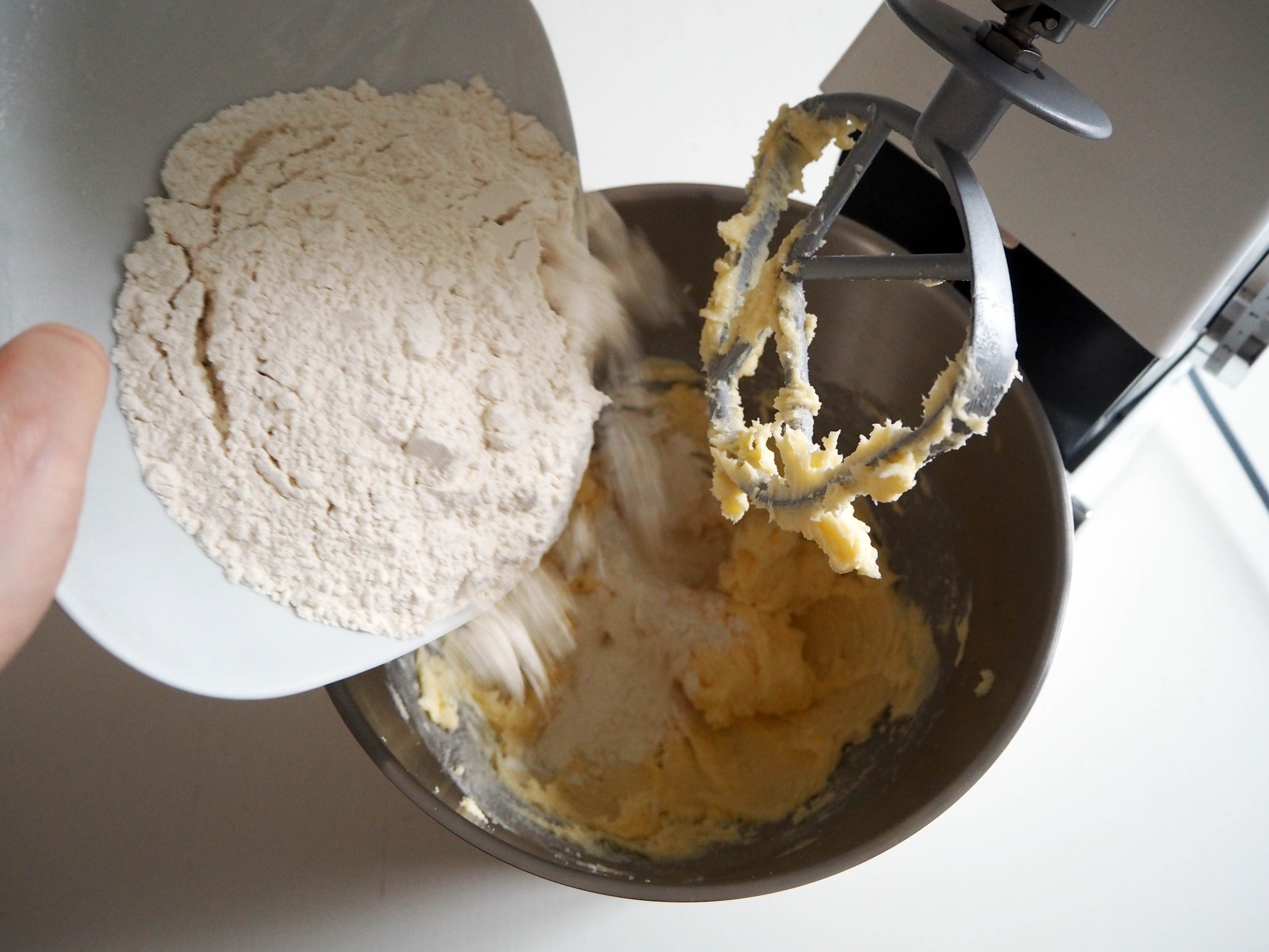 3. Add flour and salt (and vanilla sugar if using) to the mixture and continue to mix until all ingredients are incorporated. Scrape the sides again if needed.