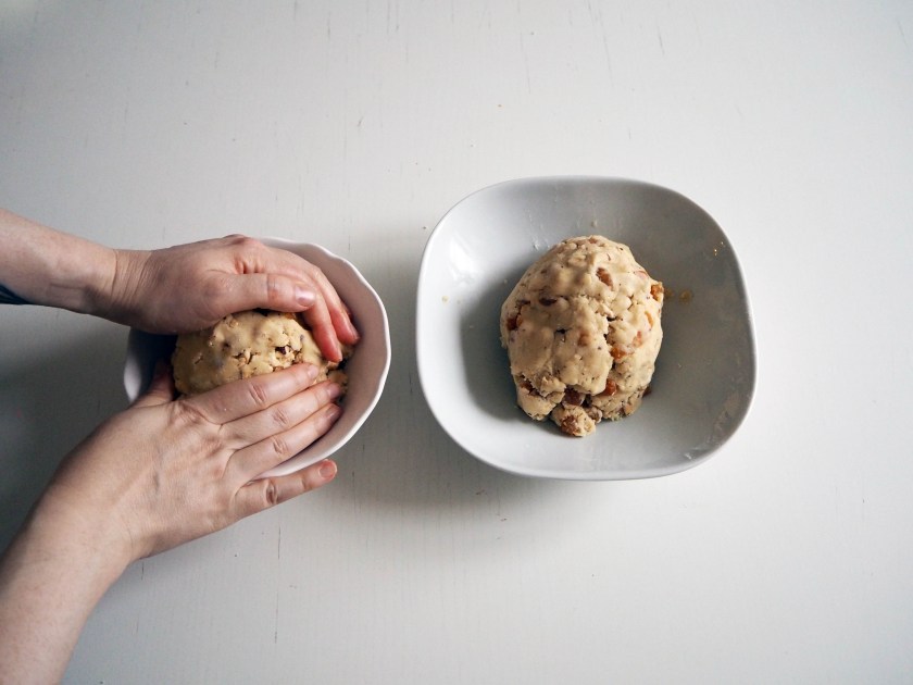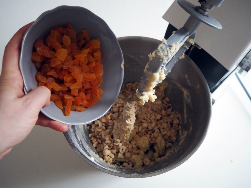 4. Add hazelnuts and apricots and mix only until both are well scattered within the dough.