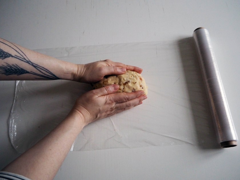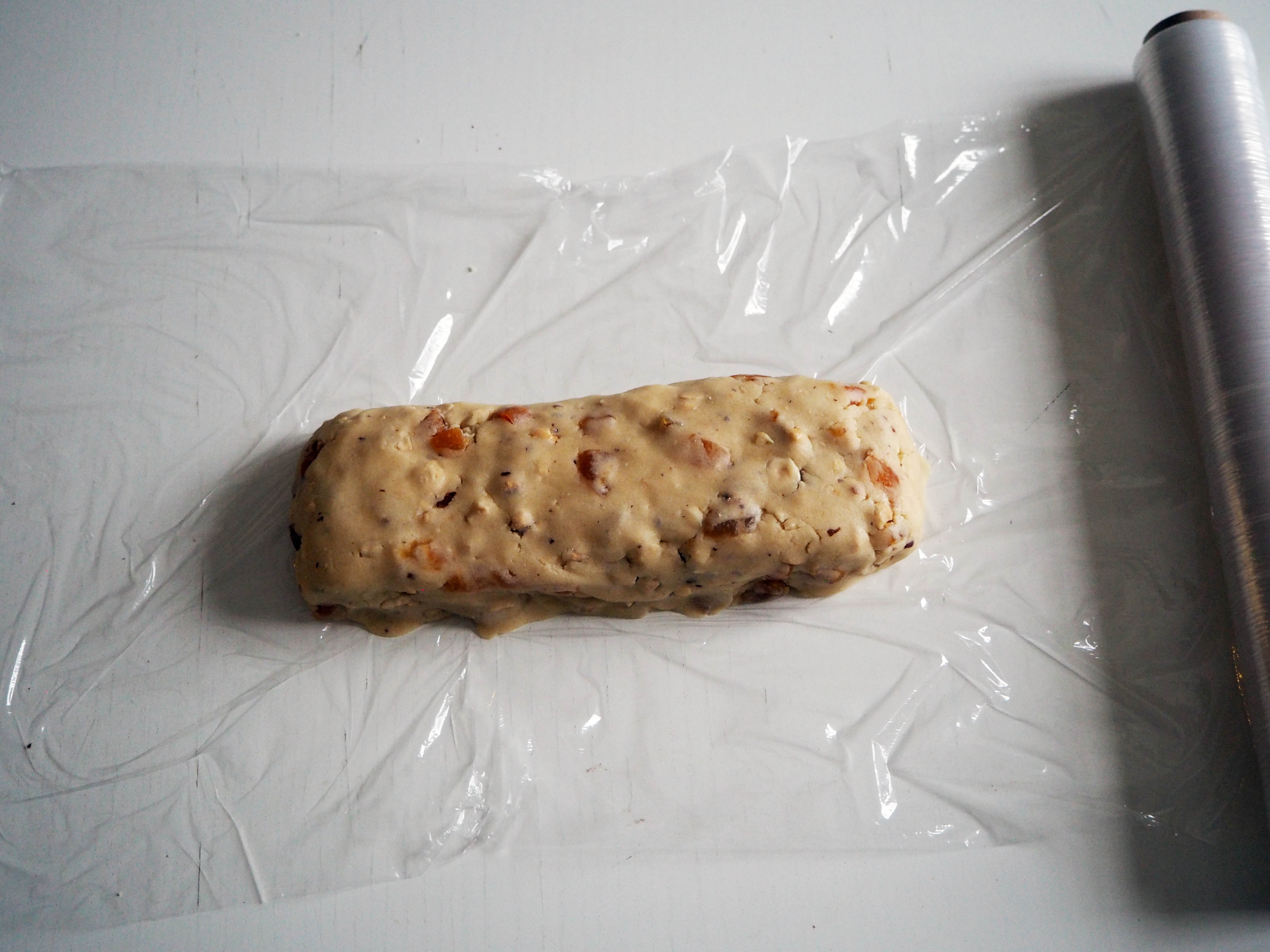 6. Take a large piece of stretch film. Put one piece of dough in the middle and shape it into a rectangle of about 7x20cm. Cover it all with stretch film. Do the same with the second dough as well. Put both dough packages on a plate and put in the fridge for a couple of hours at least, overnight is best (or up to 3 days). I put a baking paper on the plate before putting the packages because I find that dough packages stick to the plate if I put them directly on the plate.