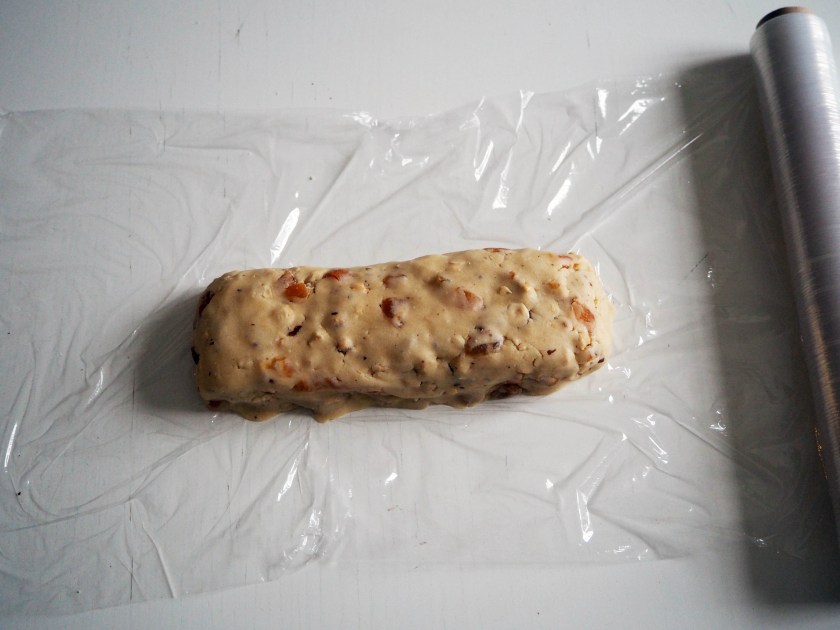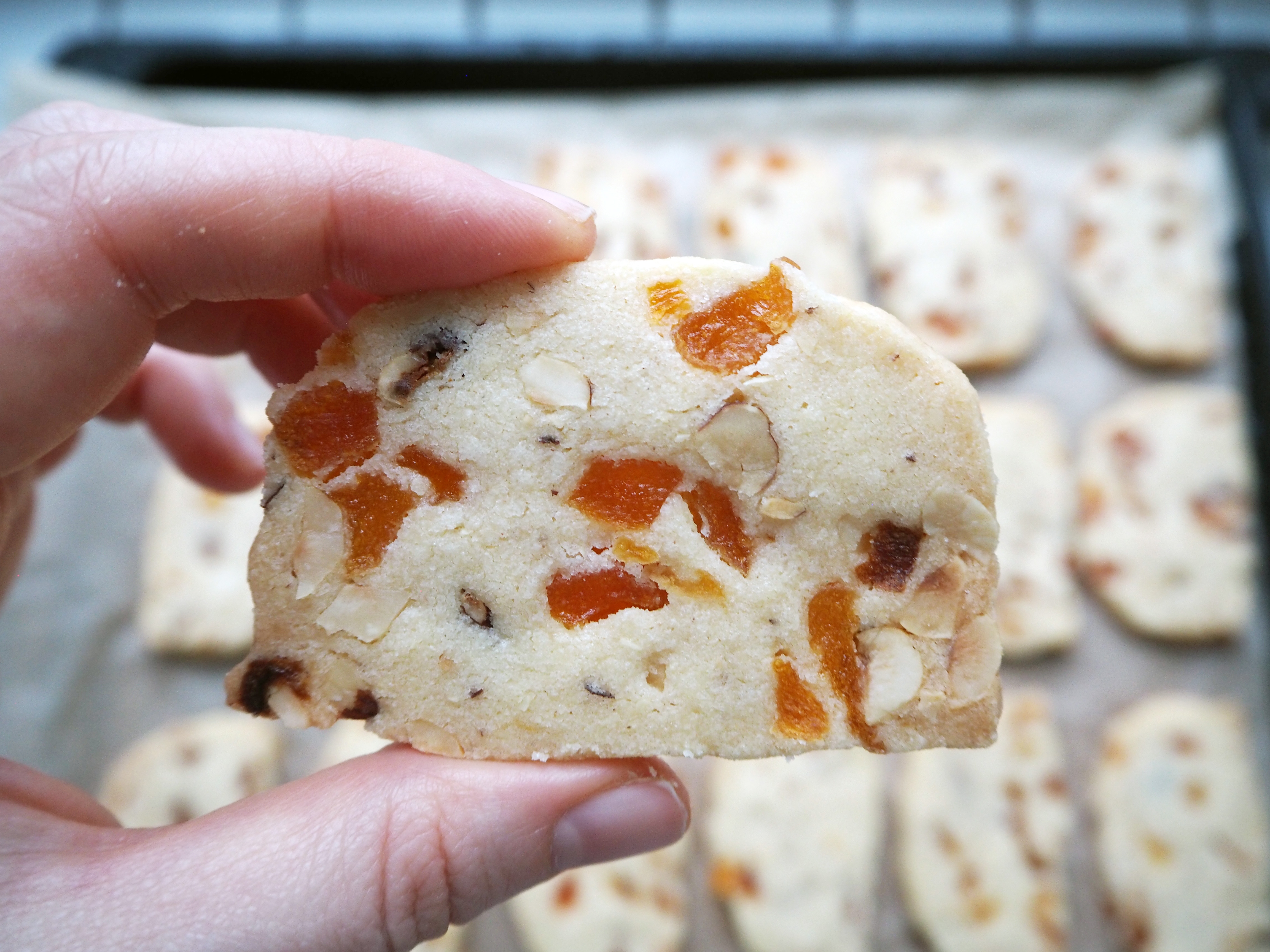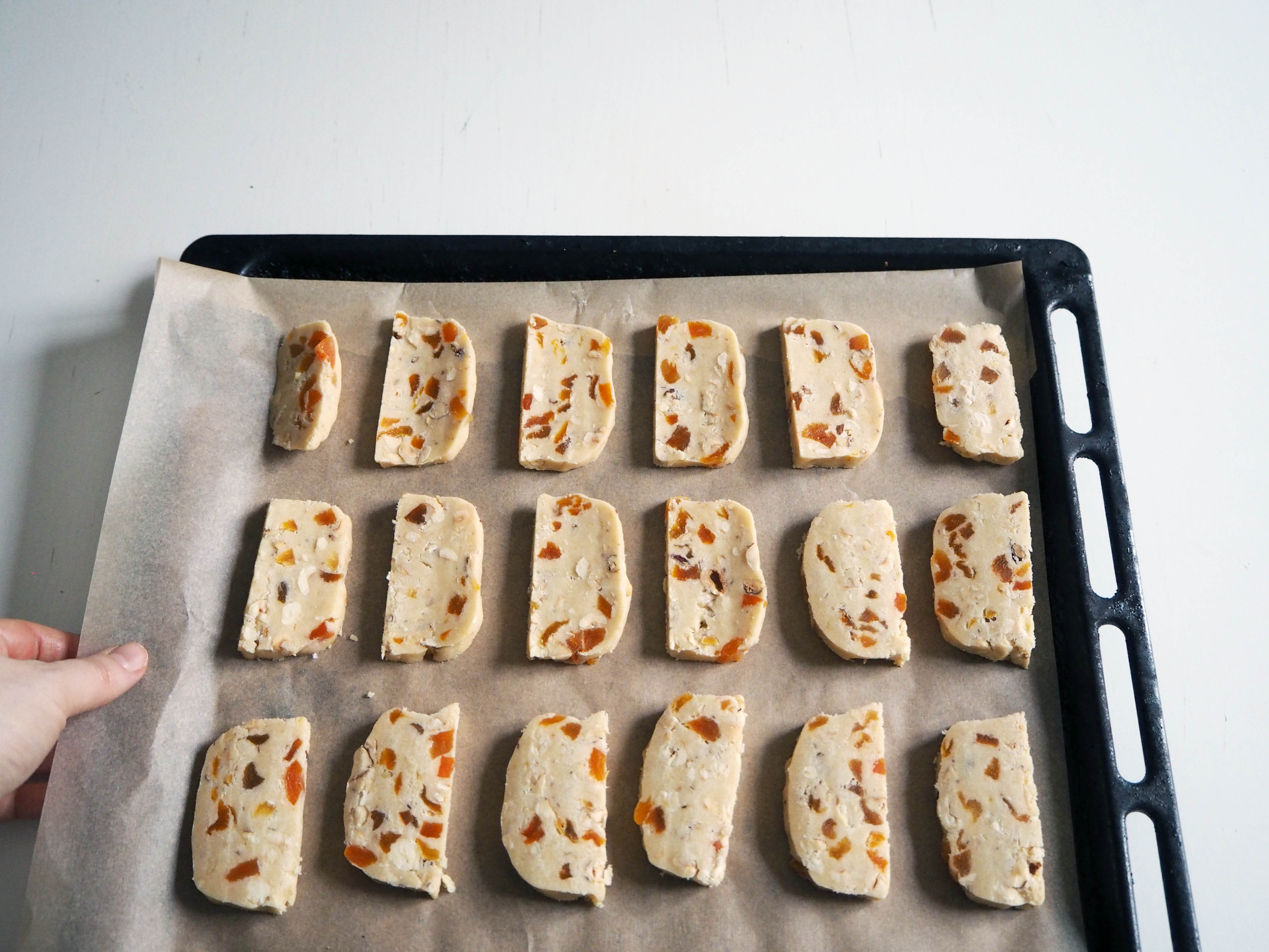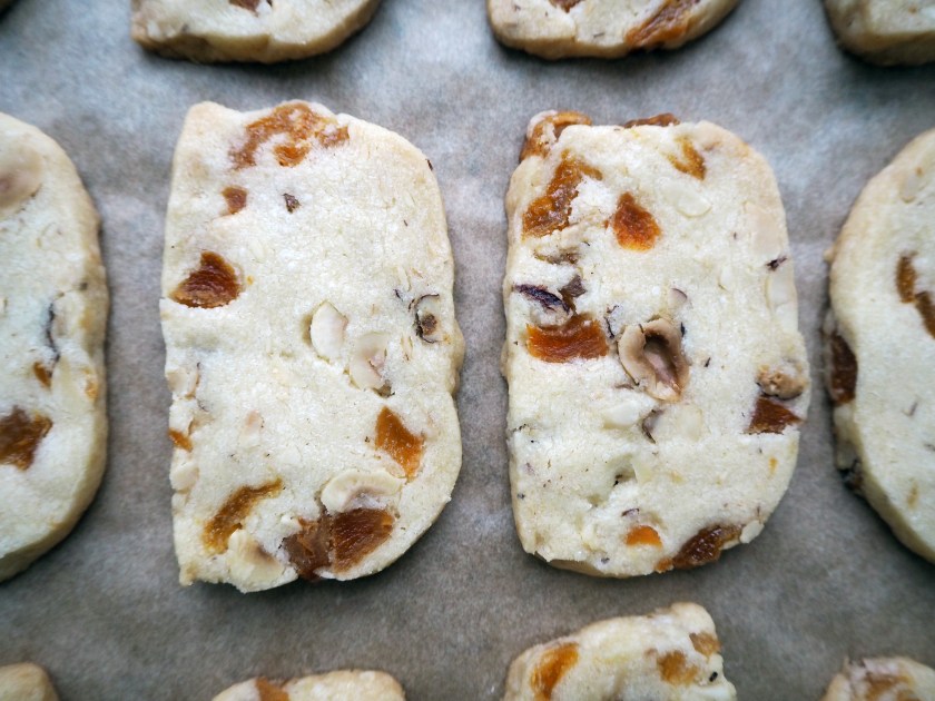 I made these shortbread cookies before, but with different nuts and fruits: pistachios and dried cranberries. That was delicious and had a great colour combination. In this one I wanted to have a different colour combo.
