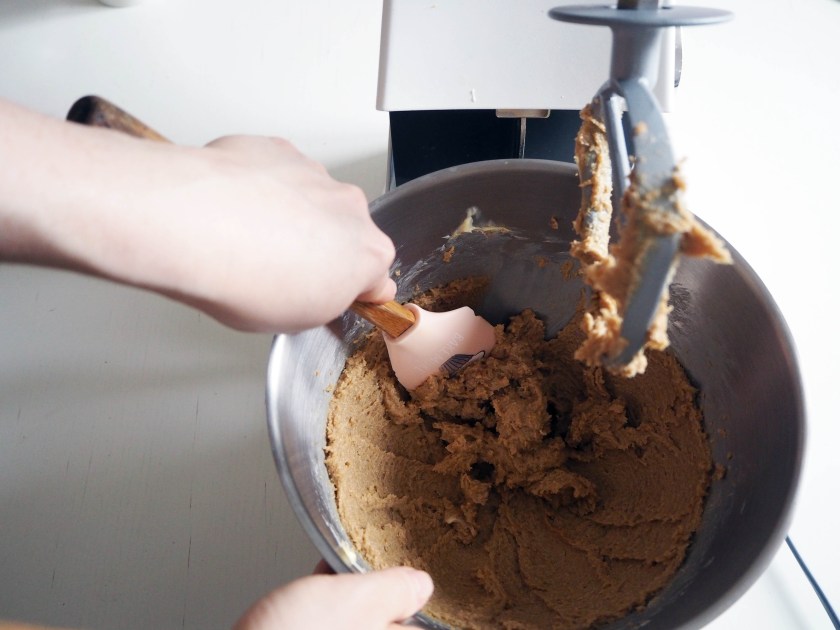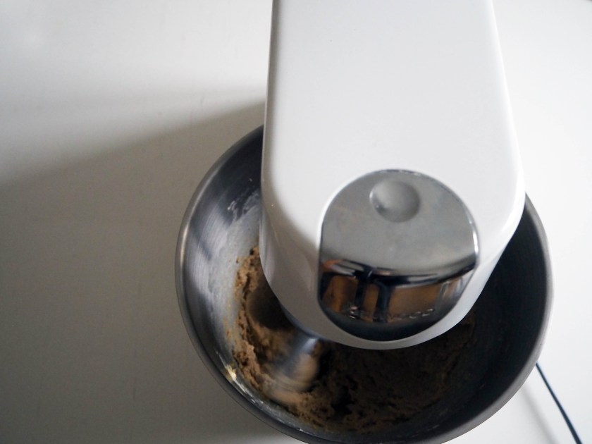 3. In the bowl of an electric mixer, put butter and brown sugar and whisk in medium to high speed for about 5 minutes, until creamy.