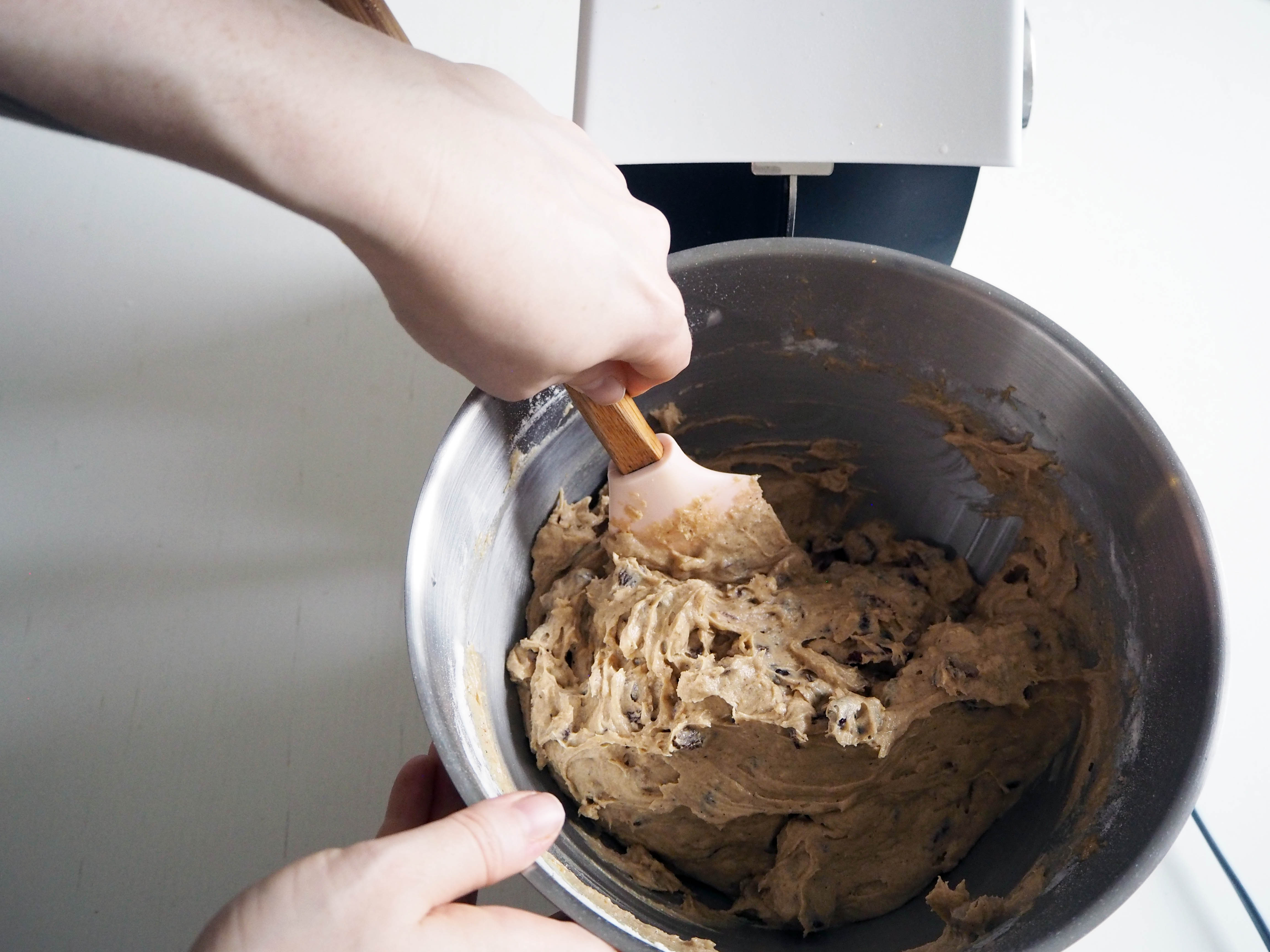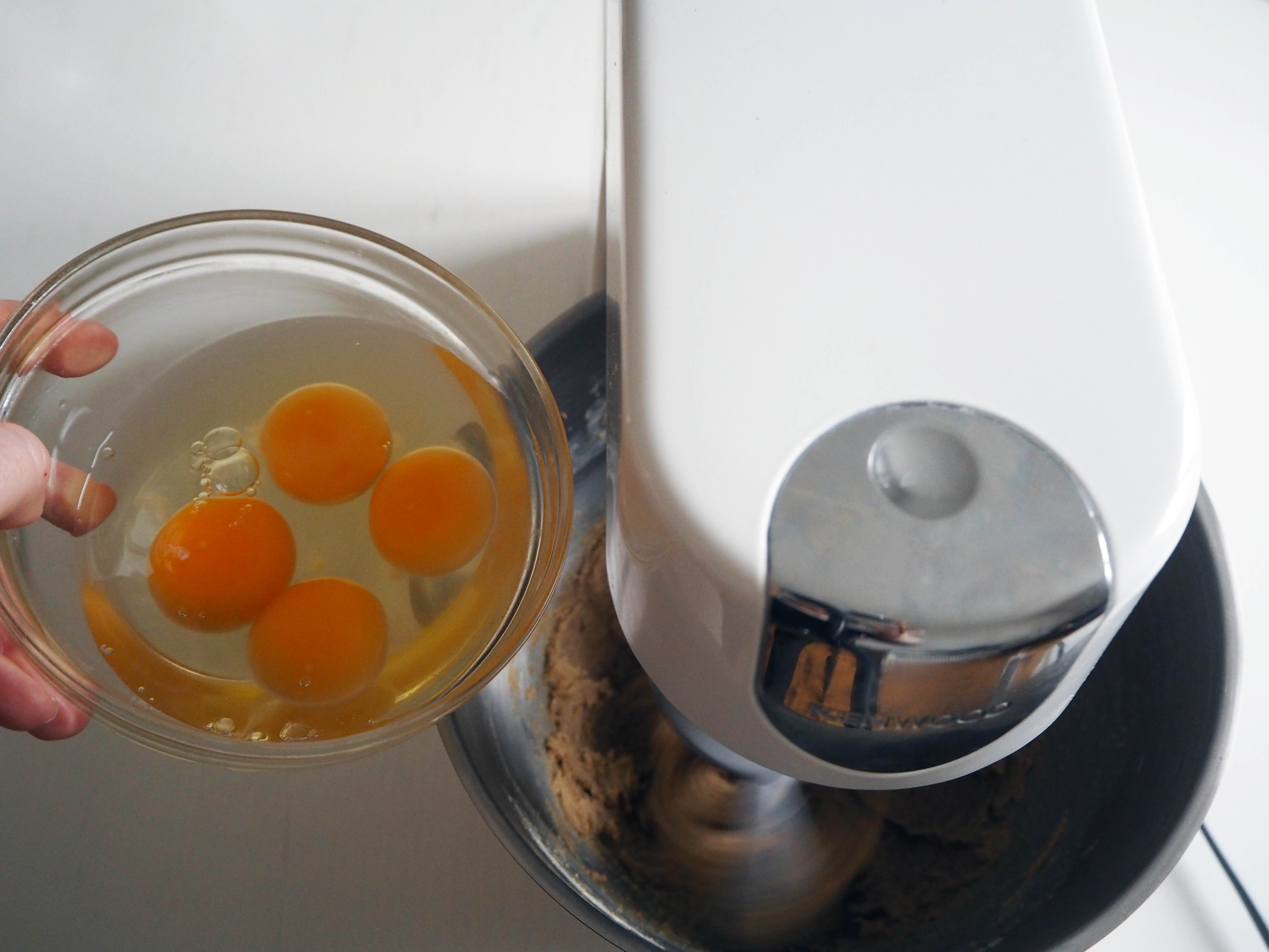 5. Add eggs, one at a time and continue whisking until all ingredients incorporate. Scrape the sides if needed.
