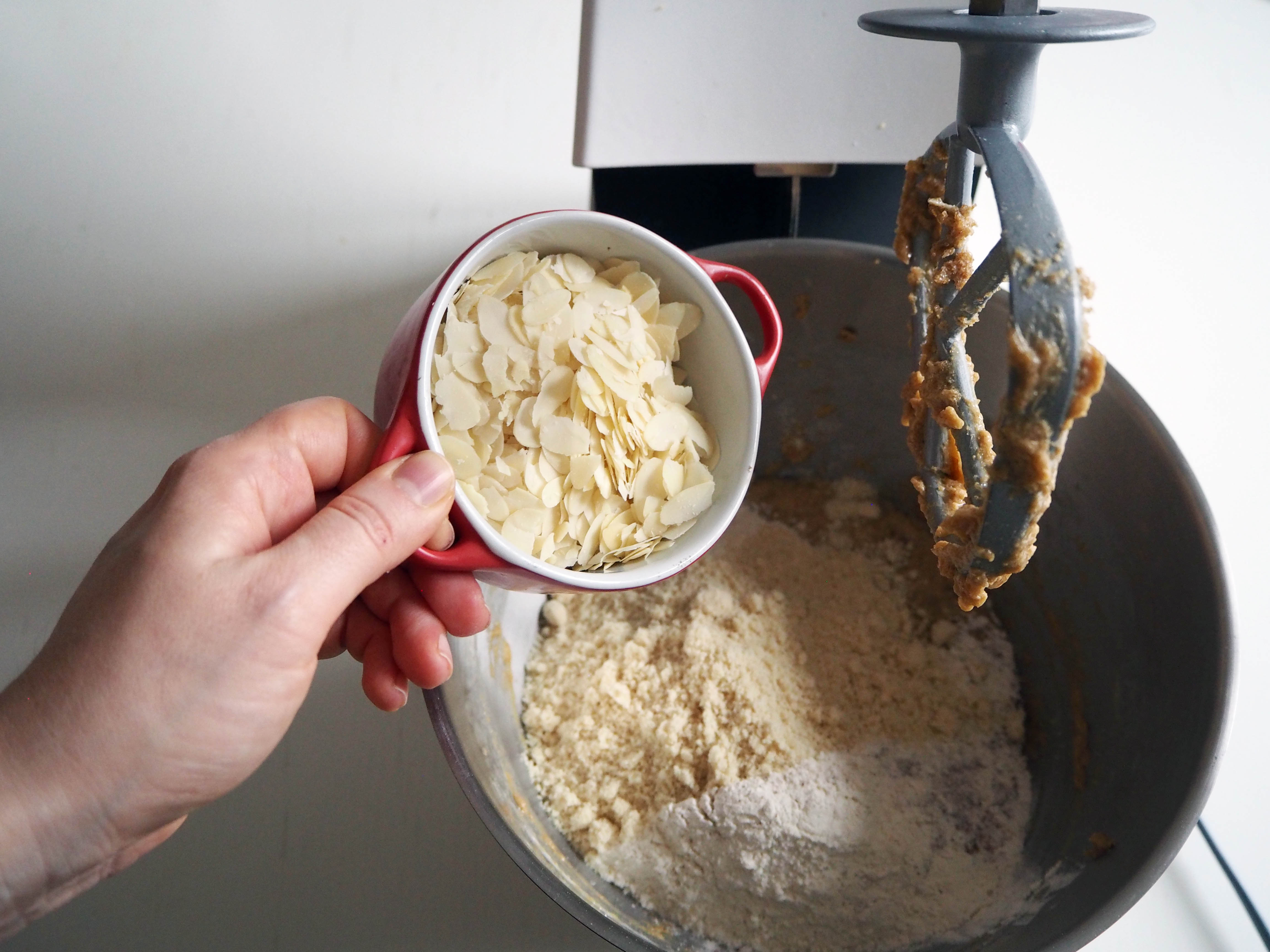6. Add sifted dry ingredients, almond flour and sliced almonds and continue to whisk until incorporated. Scrape the sides if needed.