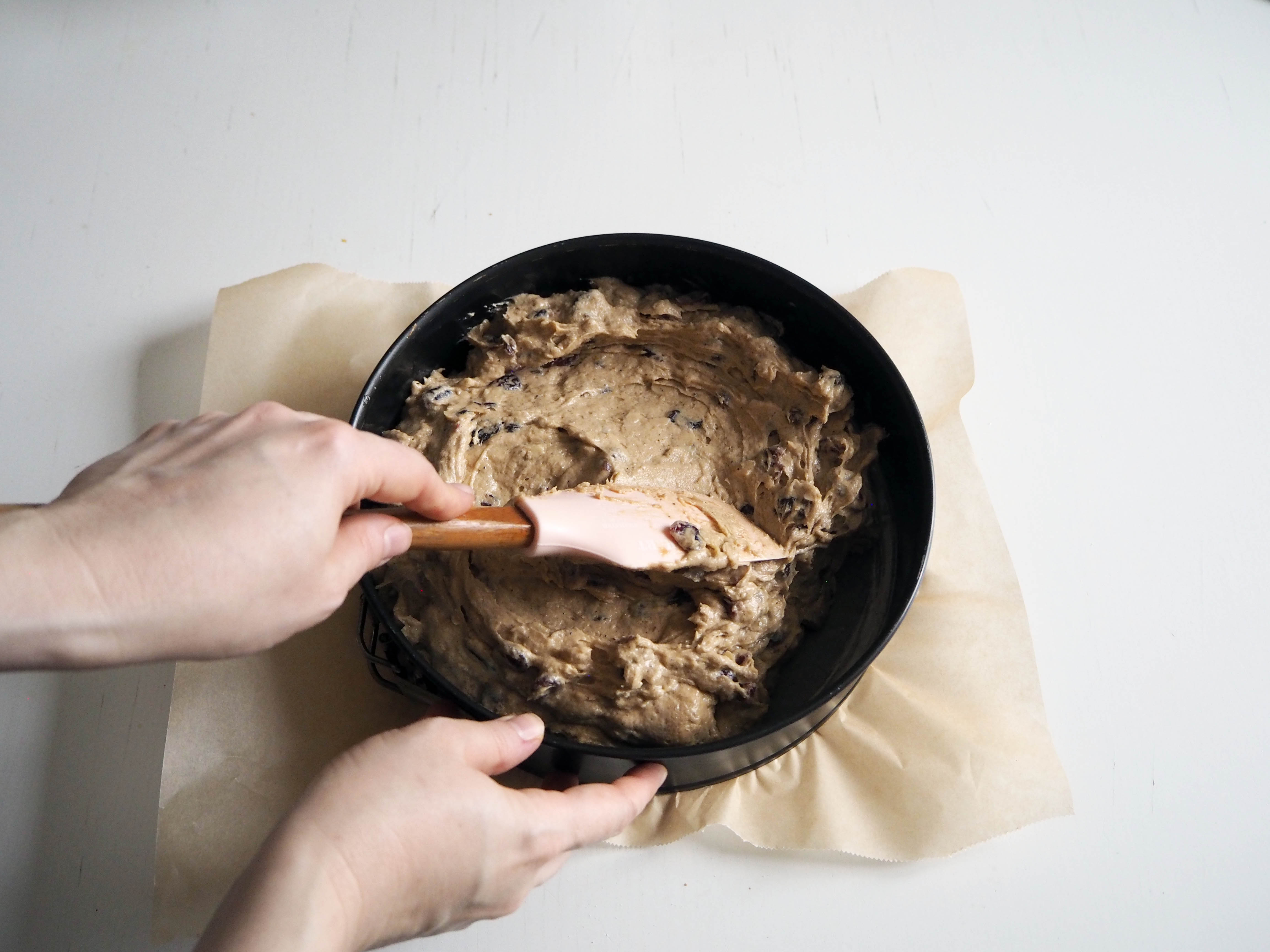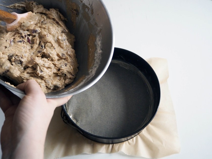 8. Transfer the batter to the cake pan. Spread the batter evenly inside the pan using a spatula or back of a spoon. Bake in the oven, in medium rack for about 60-70 minutes, until a toothpick inserted in the middle comes out clean. If your cake gets too brown on the surface before having baked properly, cover with aluminium foil. When the cake is done, take out of the oven and let it cool inside the pan. The medium of the cake might sink just slightly, don’t worry. Enjoy the cake when it’s freshly baked but cooled, or better yet, enjoy it next day (the flavours develop much much better and richer the next day).
