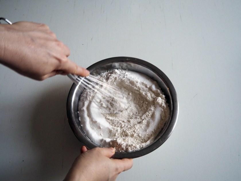 2. In a medium bowl, put dry ingredients (flour, sugar, baking powder and soda, salt) and whisk a little. Put aside.