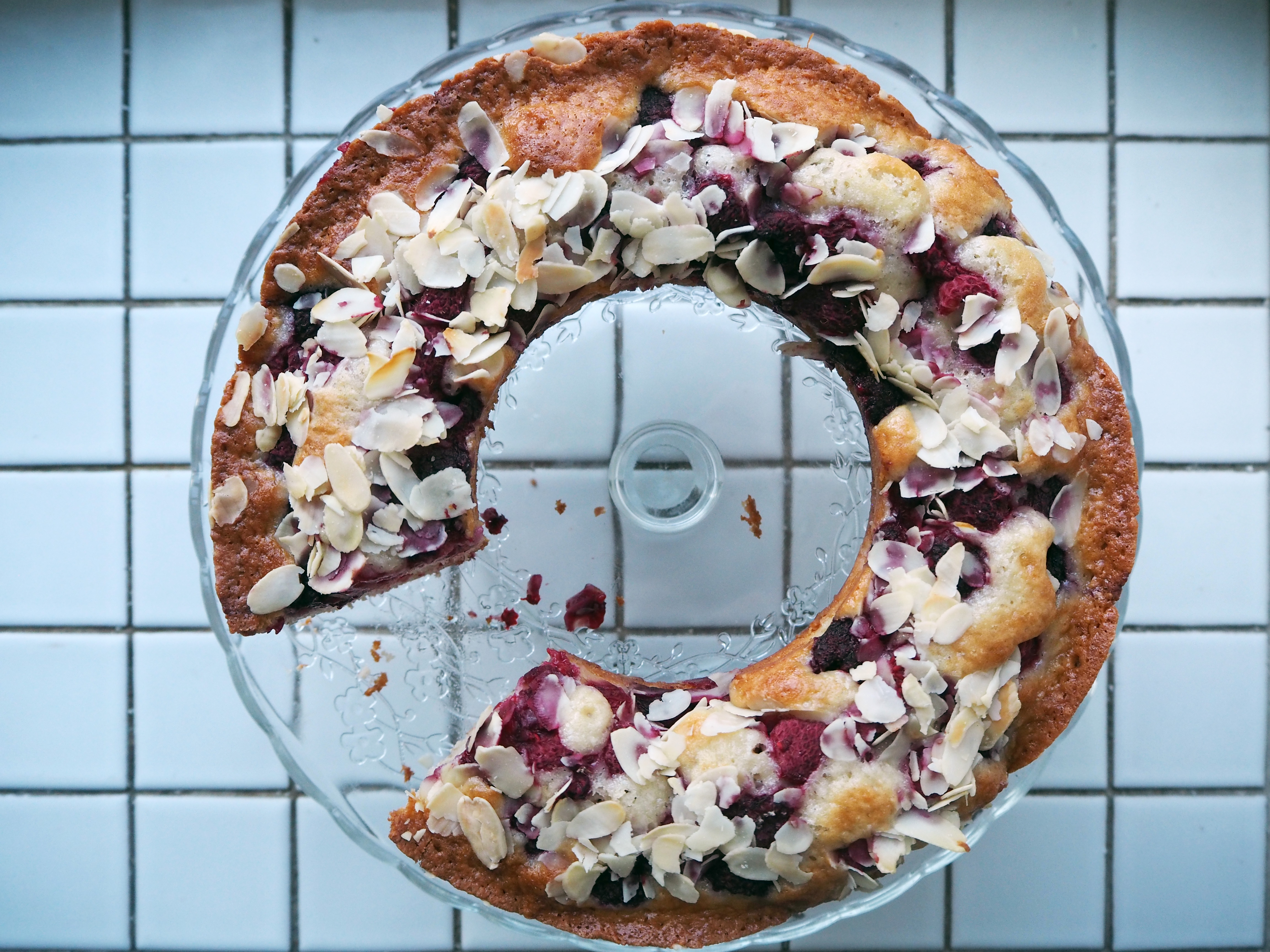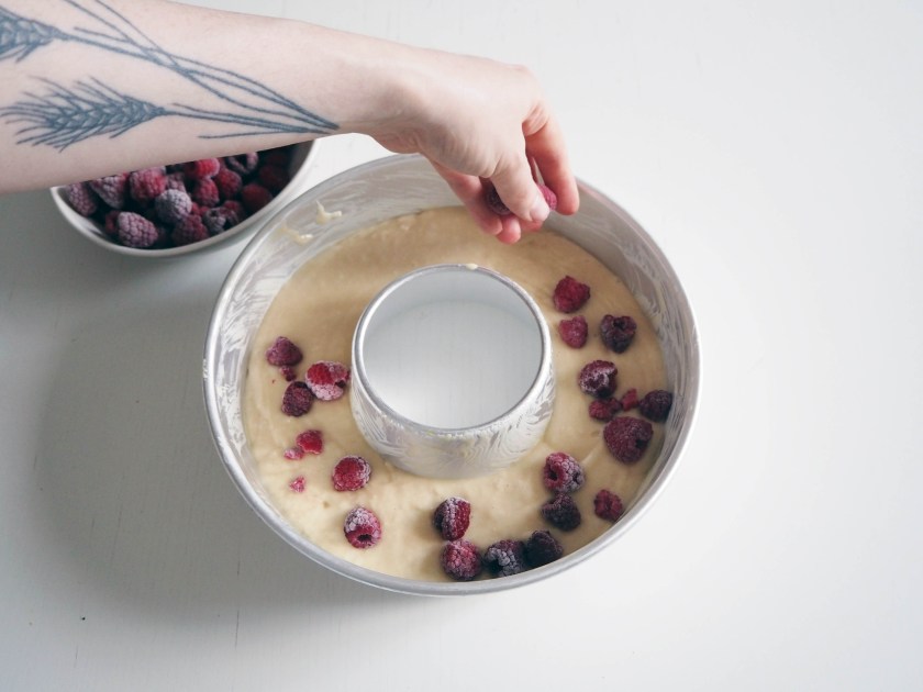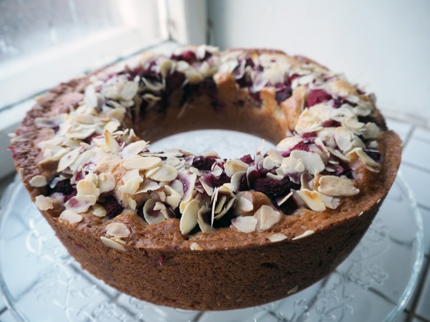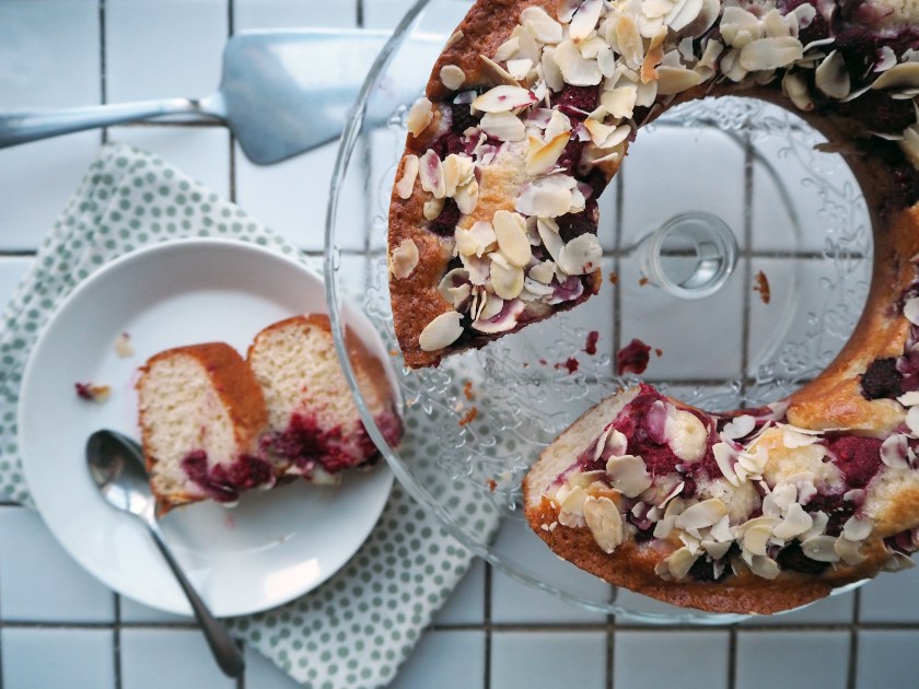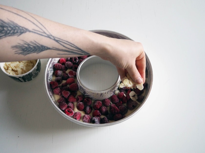 6. Transfer the batter to cake pan. Smoothen the surface with a spatula if needed. Spread raspberries and sliced almonds on top. Bake in the oven, in medium rack, for about 40 to 45 minutes, or until a toothpick inserted in the middle comes out clean. When the cake is out of the oven, let it cool in the pan for at least 30 to 40 minutes before taking it out – use a small knife to help release the cake from the edges. Enjoy with fresh tea or coffee!