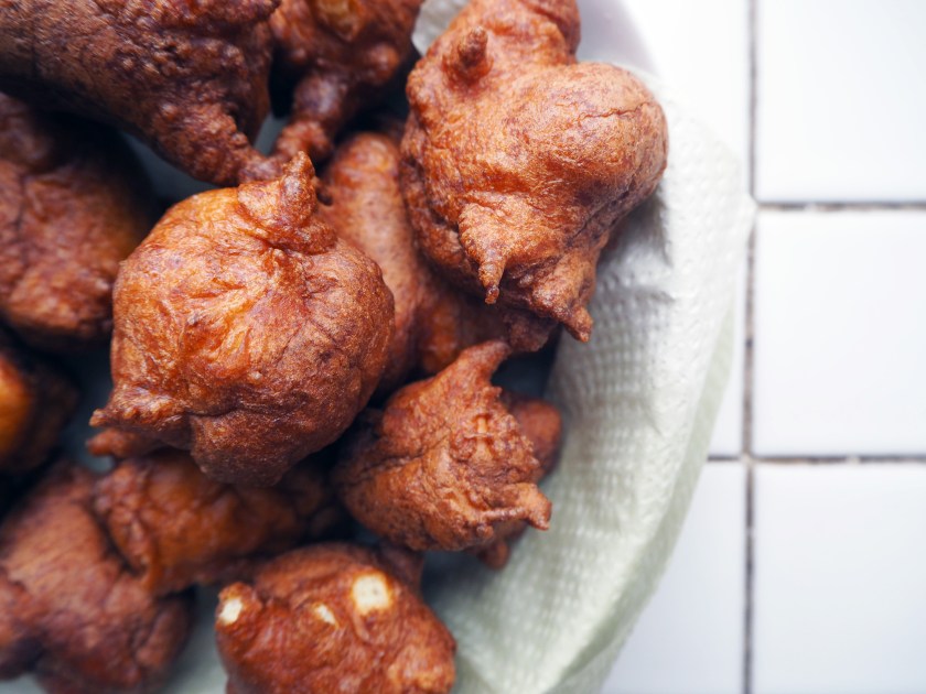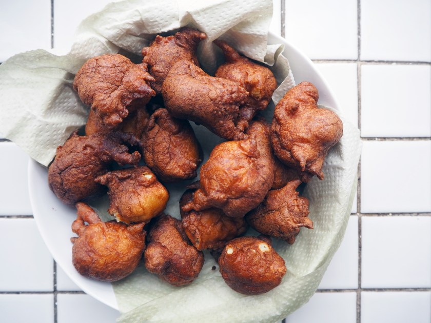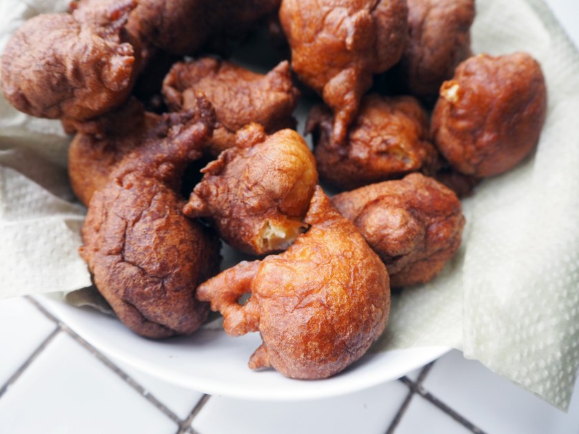 5. When they are fried enough, nicely browned but not too browned or burned, take them out of the oil using a slotted spoon and put on a service plate with a paper towel on. The paper towel will absorb the excess oil. Repeat the frying until all the batter is used. You can eat these mini monsters plain, accompanied by cheese, or sweet with powdered sugar spread on top. Enjoy with fresh tea or coffee!