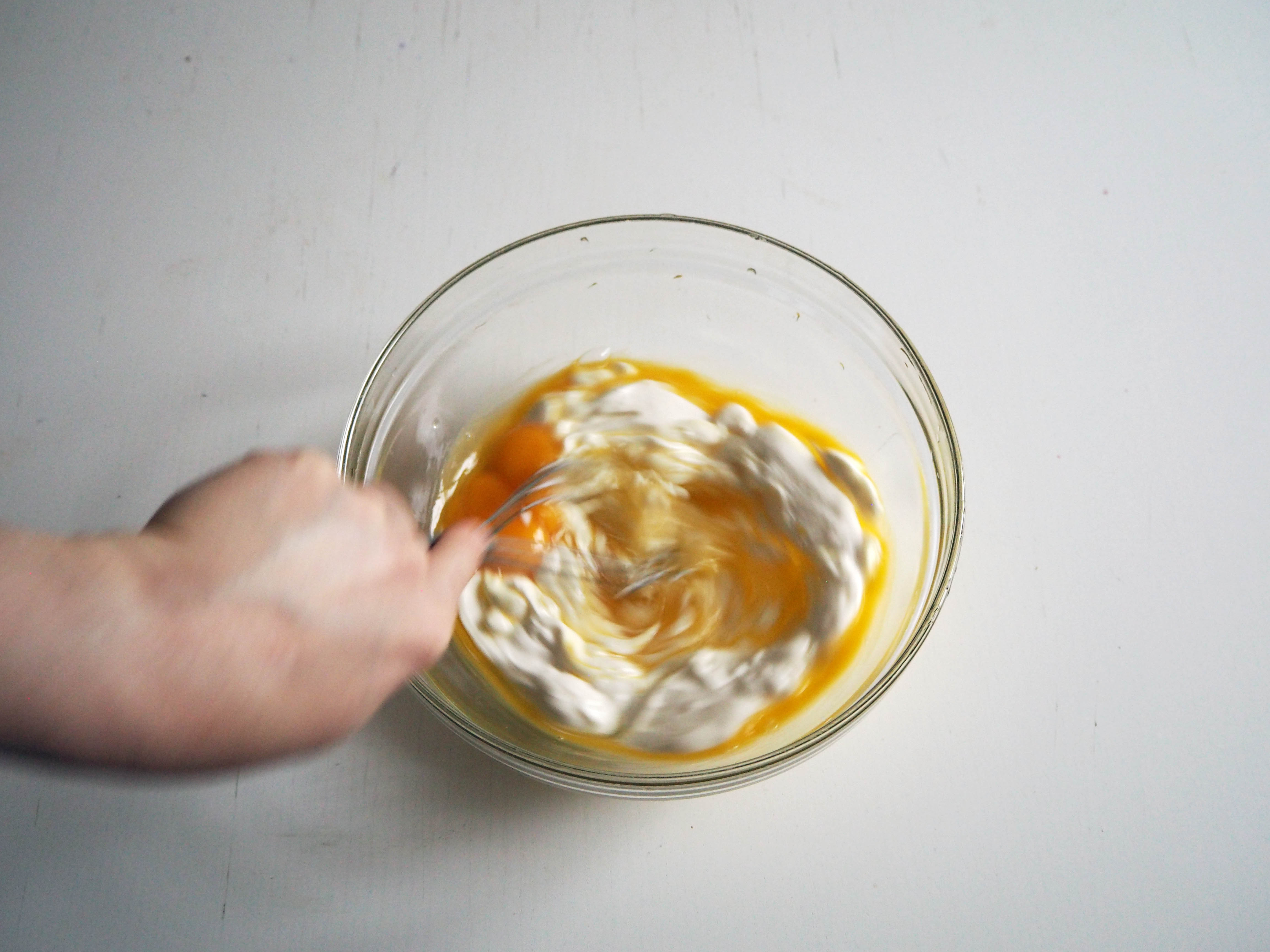 1. In a mixing bowl, put eggs and yogurt and whisk well.