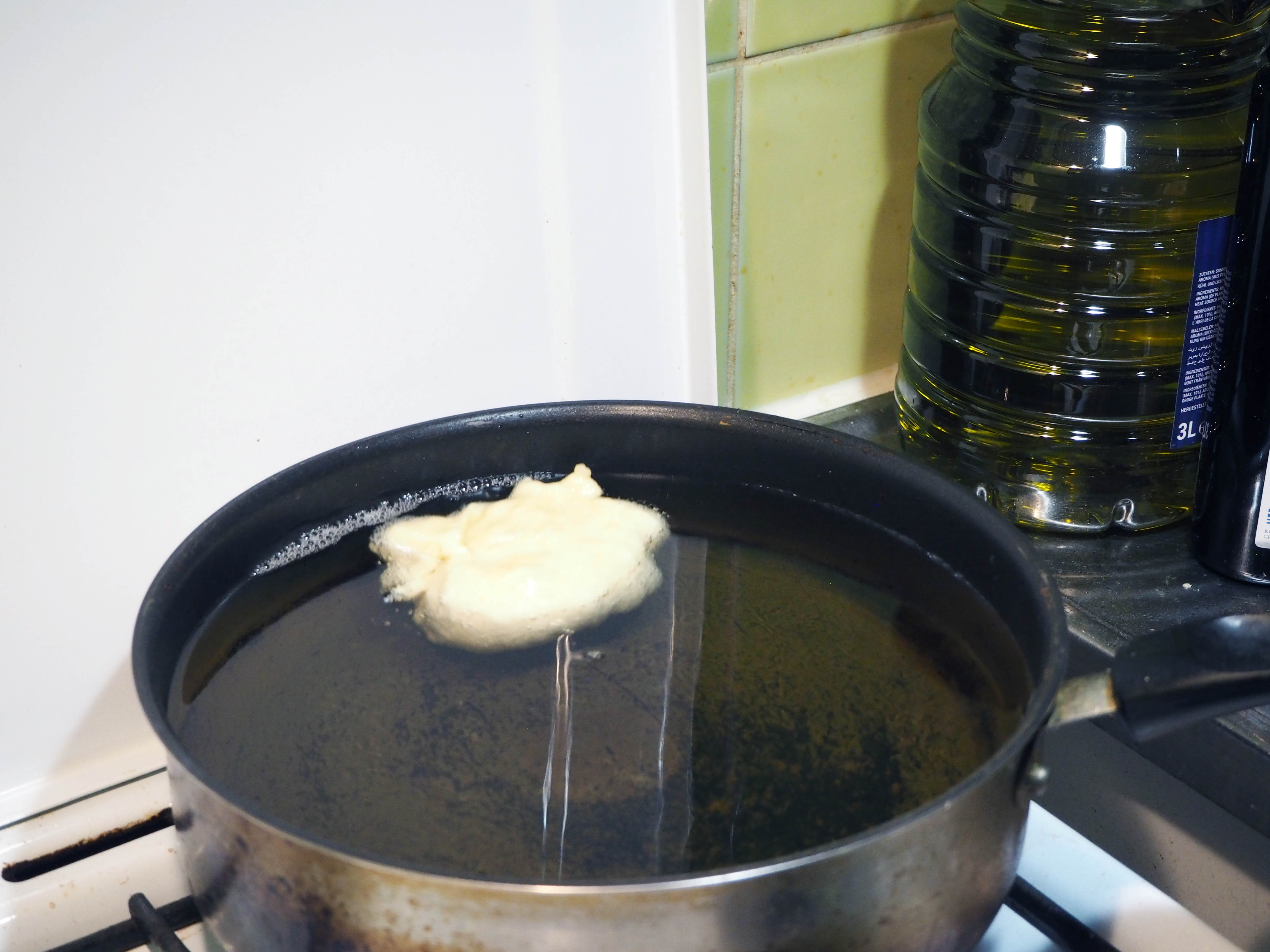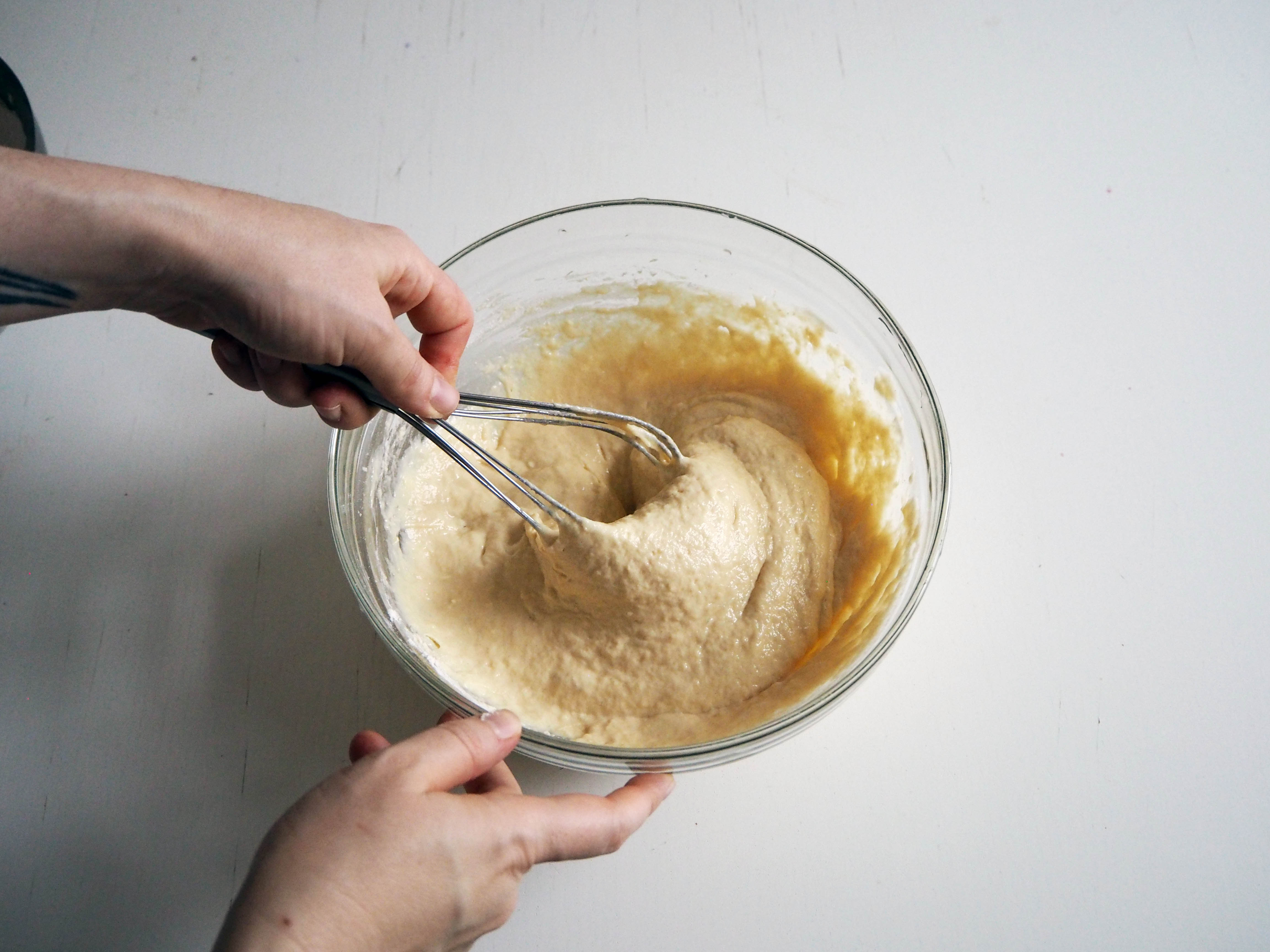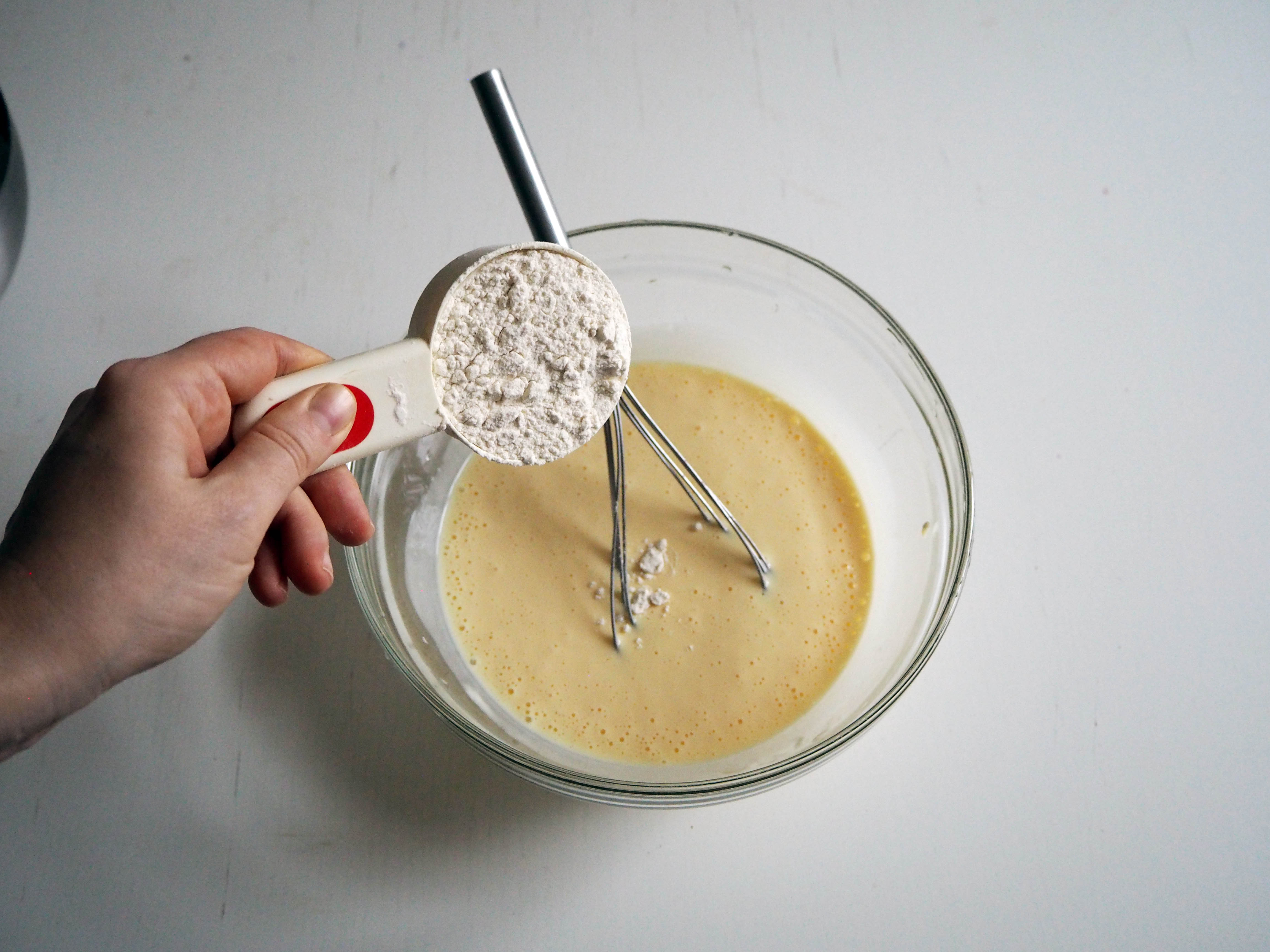 3. Add flour little by little, around 1 dl or 1/2 cup at a time and whisk. For me, 2 cups of flour was just right, but depending on your flour, you might need a little less or a little more flour than that. The final consistency should be a little thicker than pancake batter. You should be able to scoop a spoonful of dough into the oil.