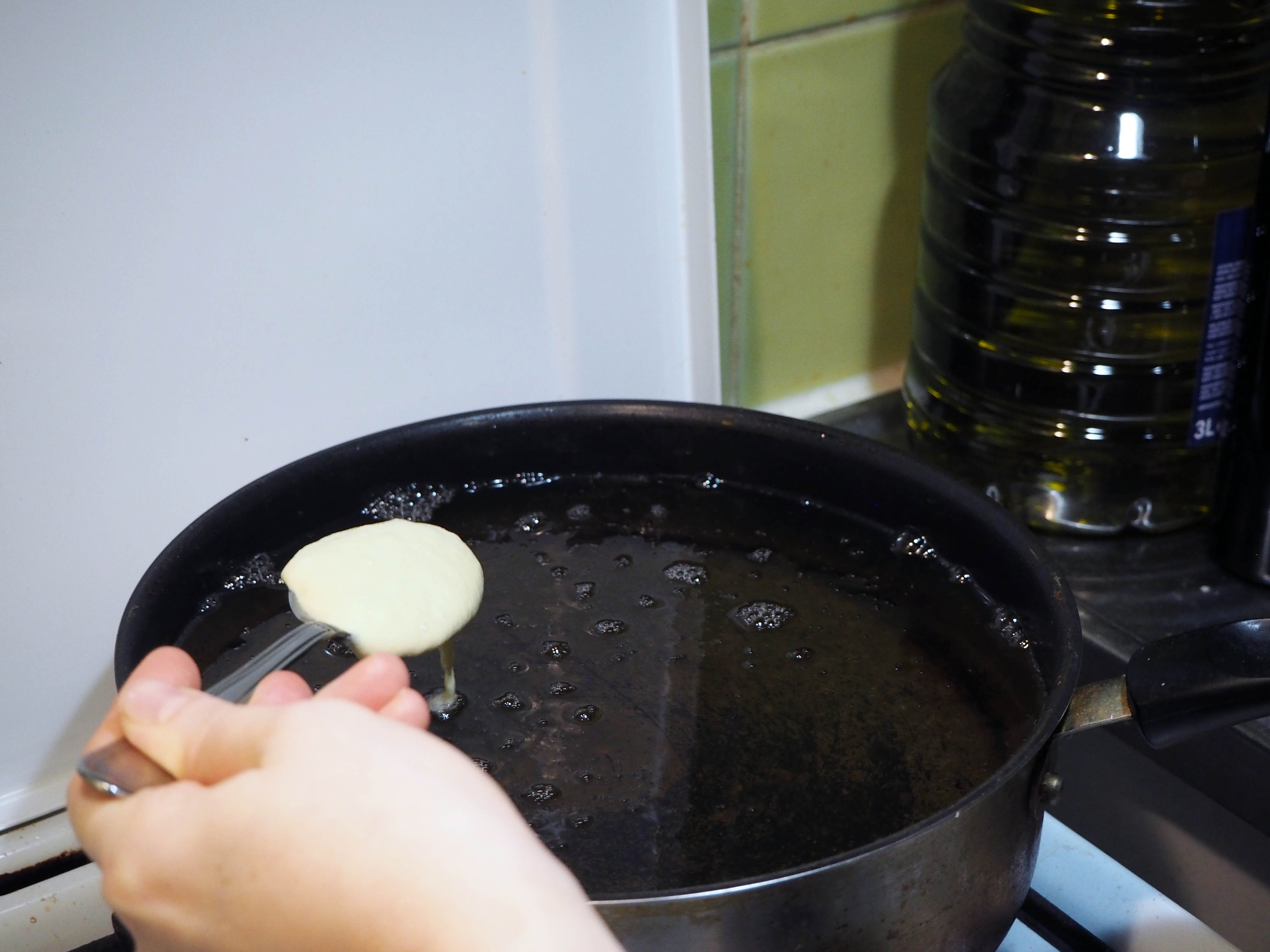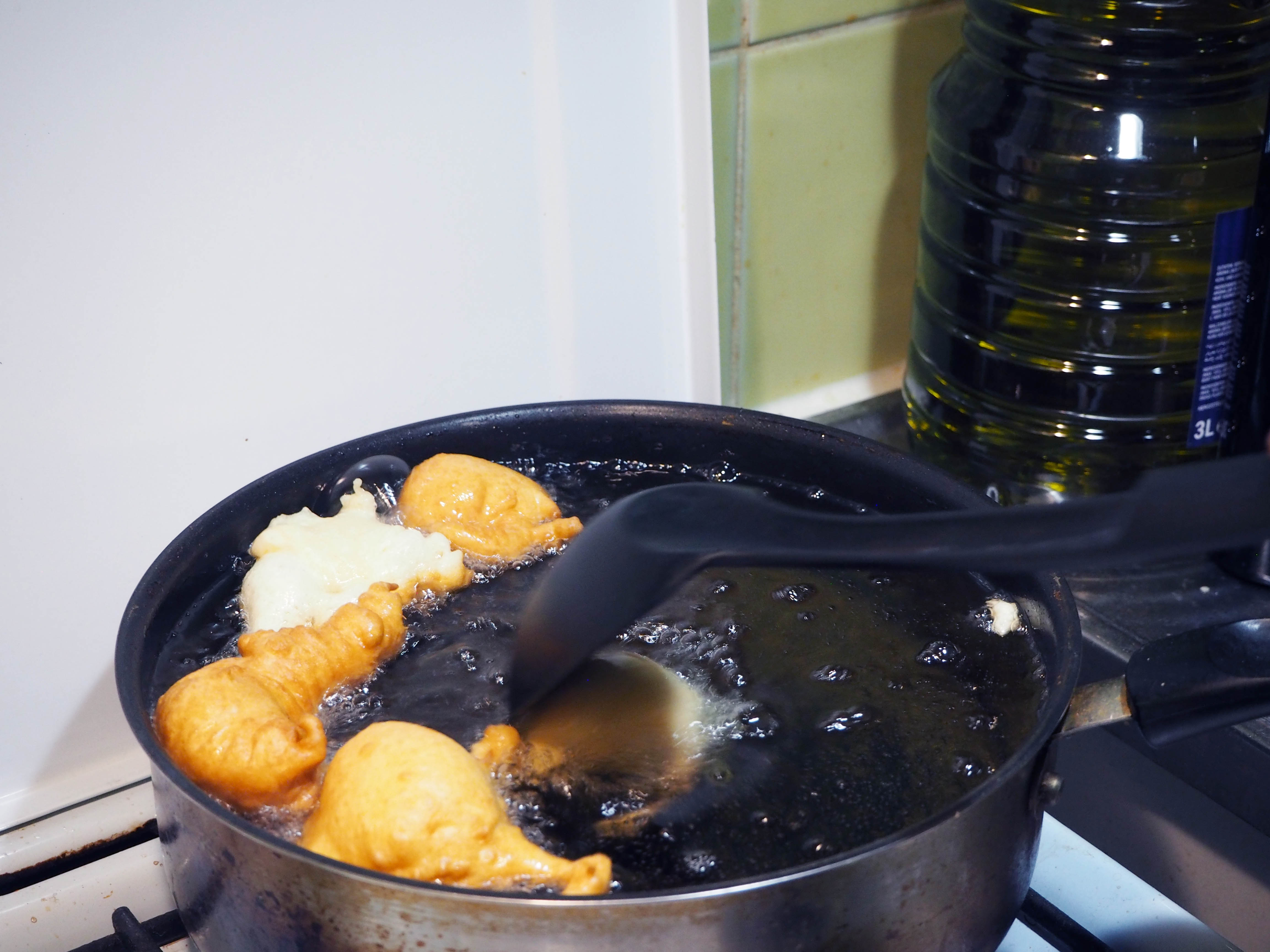 4. In a large pan suitable for frying, put 2 lt. oil and let it get very hot. The amount of oil may sound much more than needed but the thing is, the oil must be too much to properly fry the dough. Otherwise the batter will just absorb all the oil and will be too greasy. When the oil is hot, put spoonfuls of dough in the pan and fry. Using a spatula or a similar tool, stir the frying dough pieces often so that they are covered with oil.