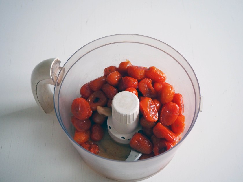 4. Roast the tomato mixture in the mid section of your oven for 45 minutes. Let the mixture cool down for about 10 minutes after roasting.
