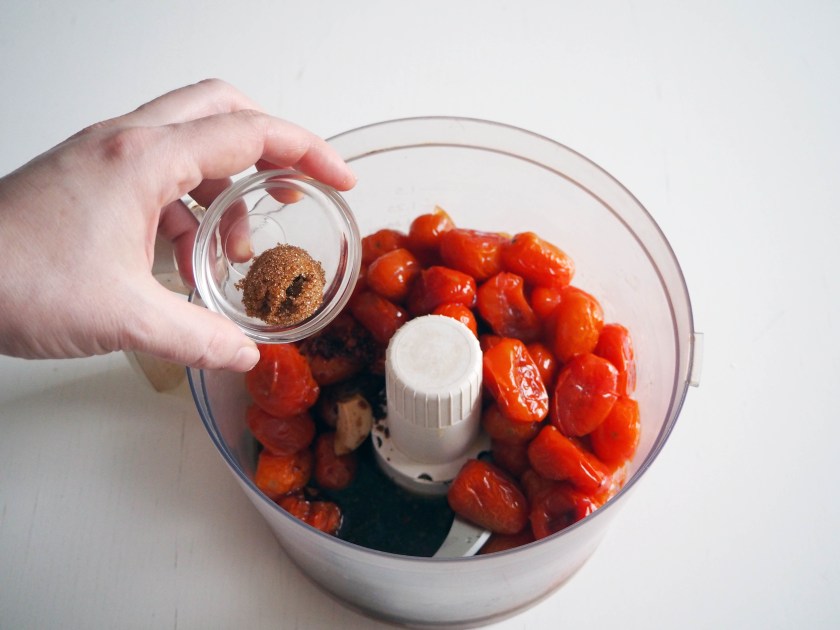5. Put tomato mixture, red pepper flakes, balsamic vinegar and brown sugar in a food processor and process well.