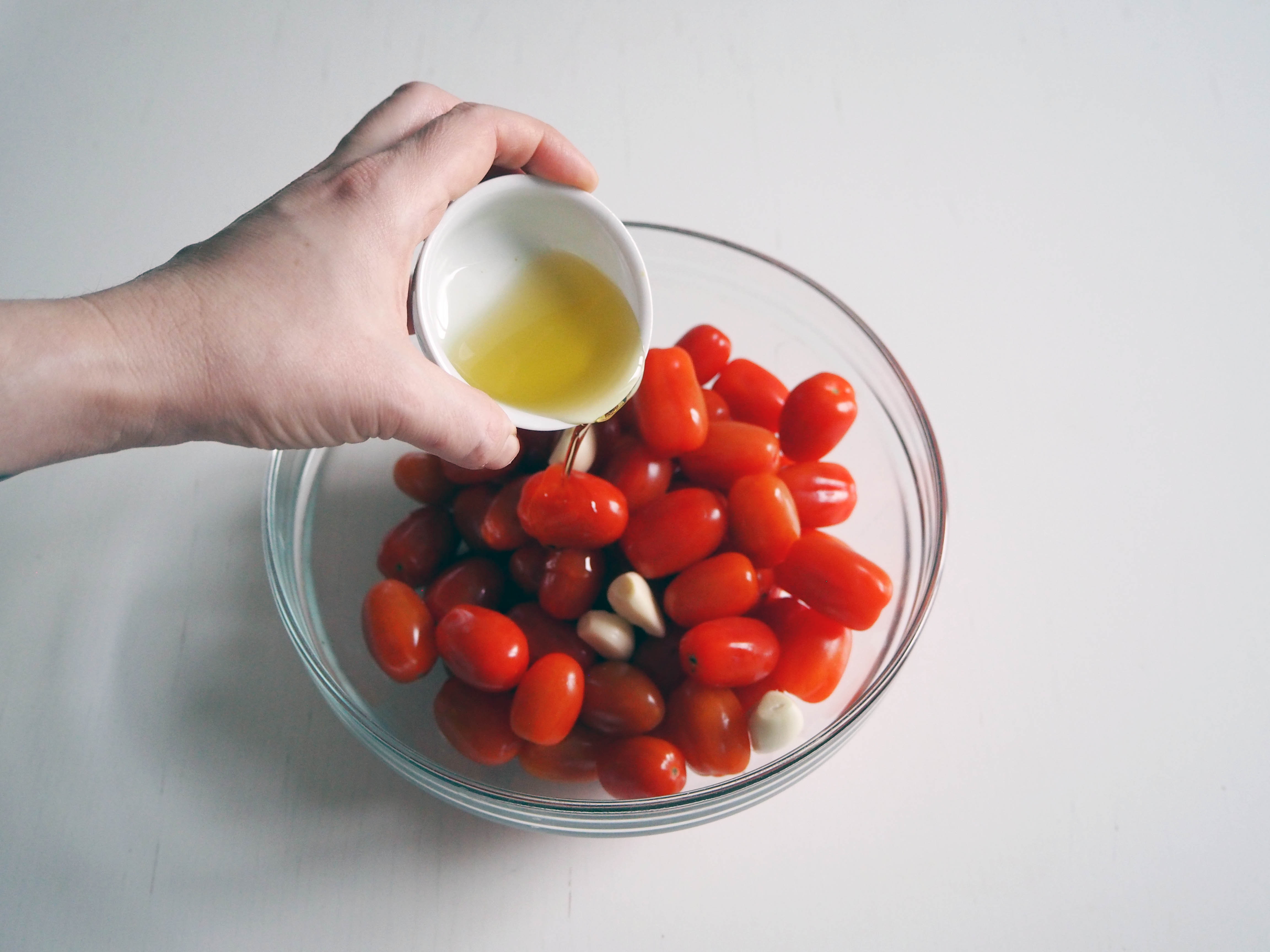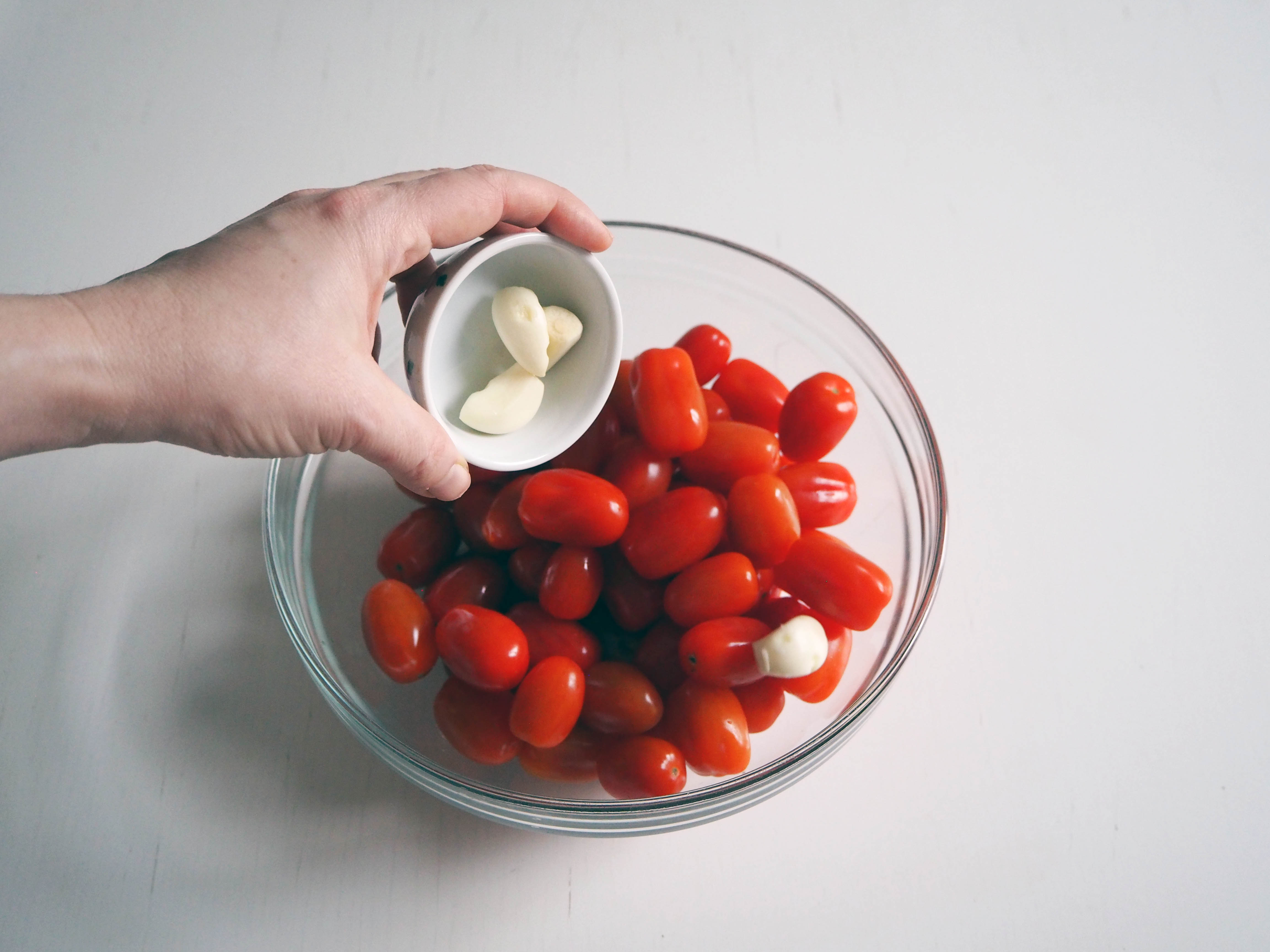 2. In a bowl, put cherry tomatoes, garlic cloves and olive oil and mix well.