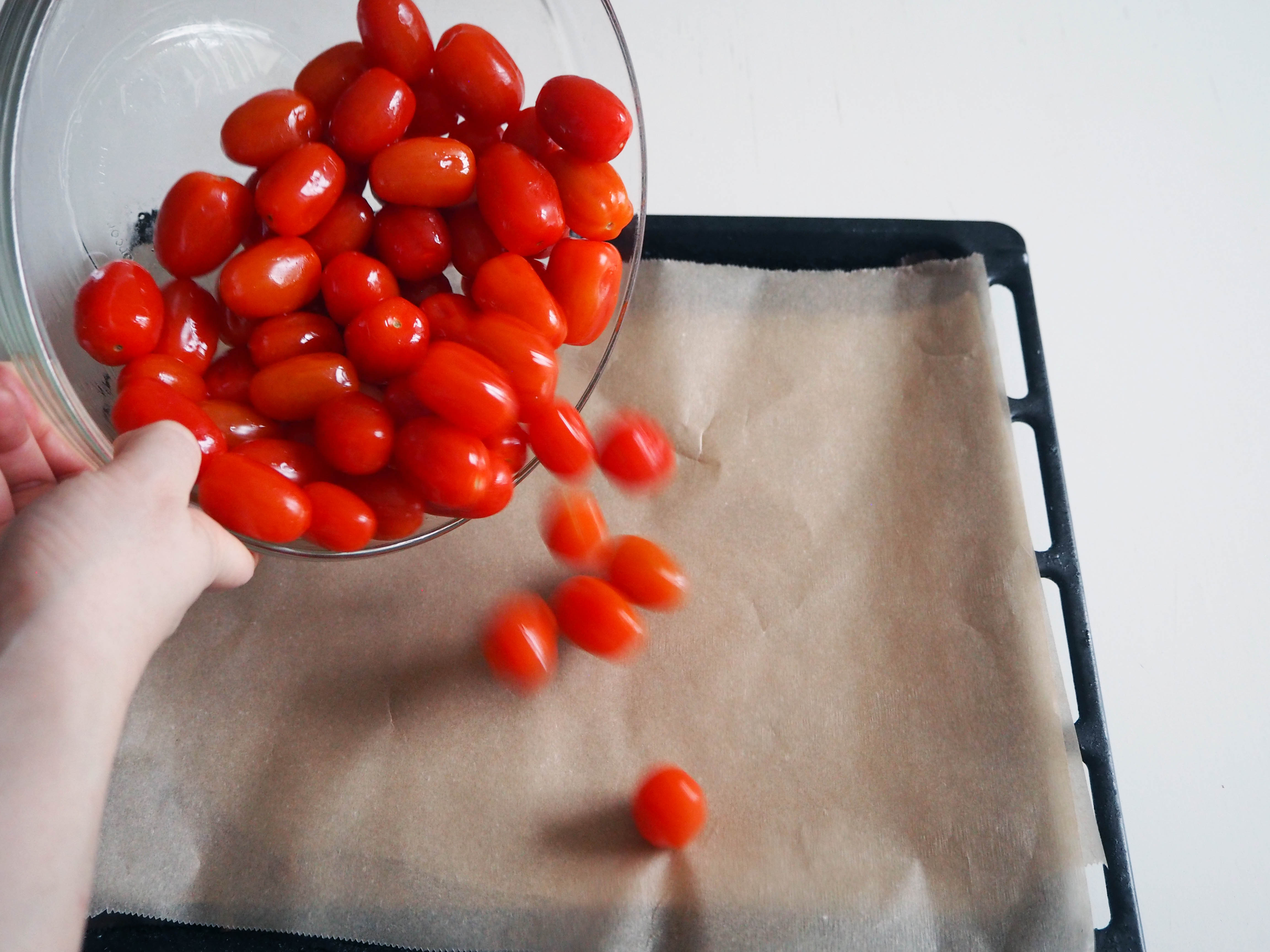 3. Transfer tomato mixture onto an oven tray with a baking paper. Spread them all as one layer.