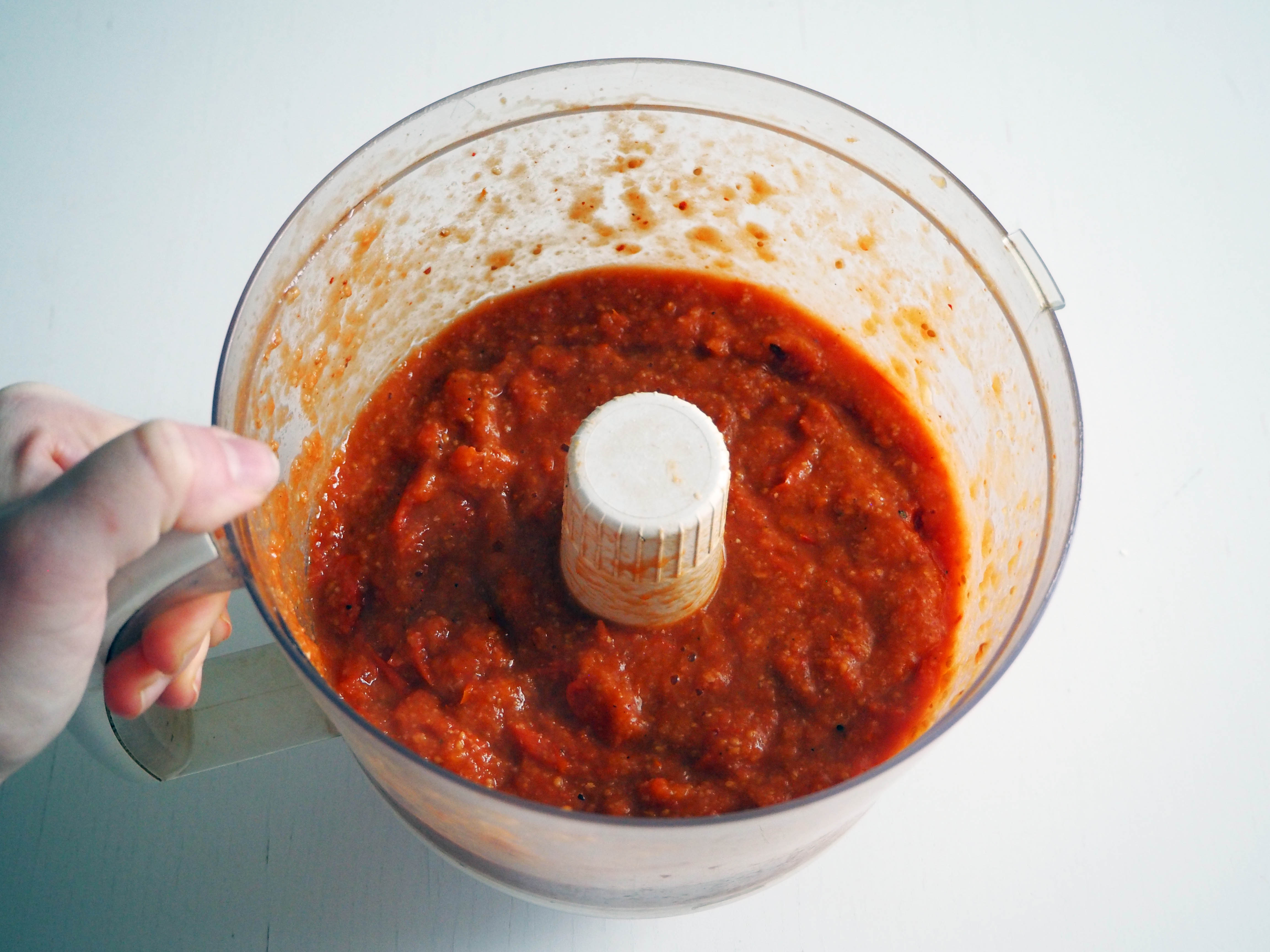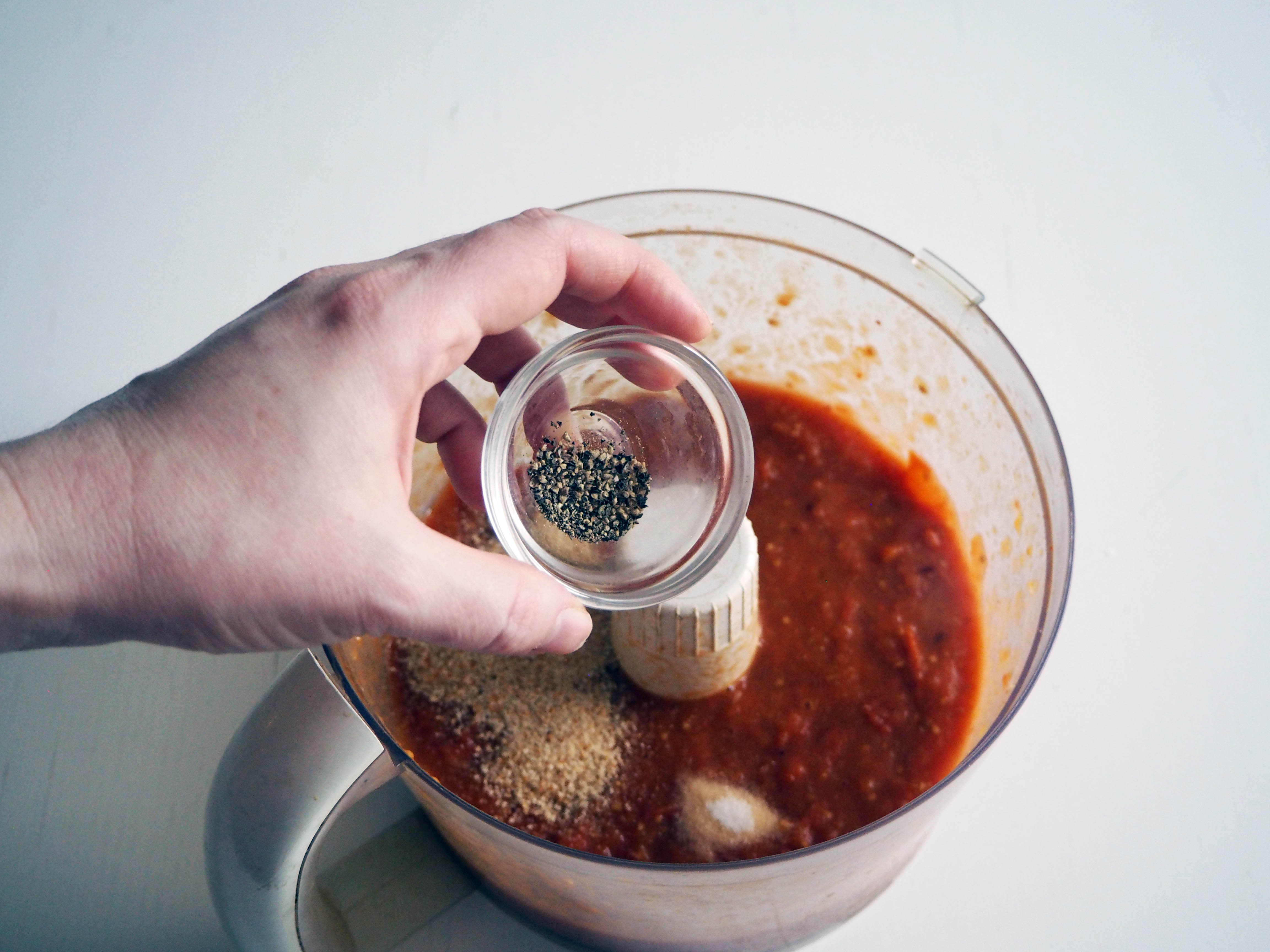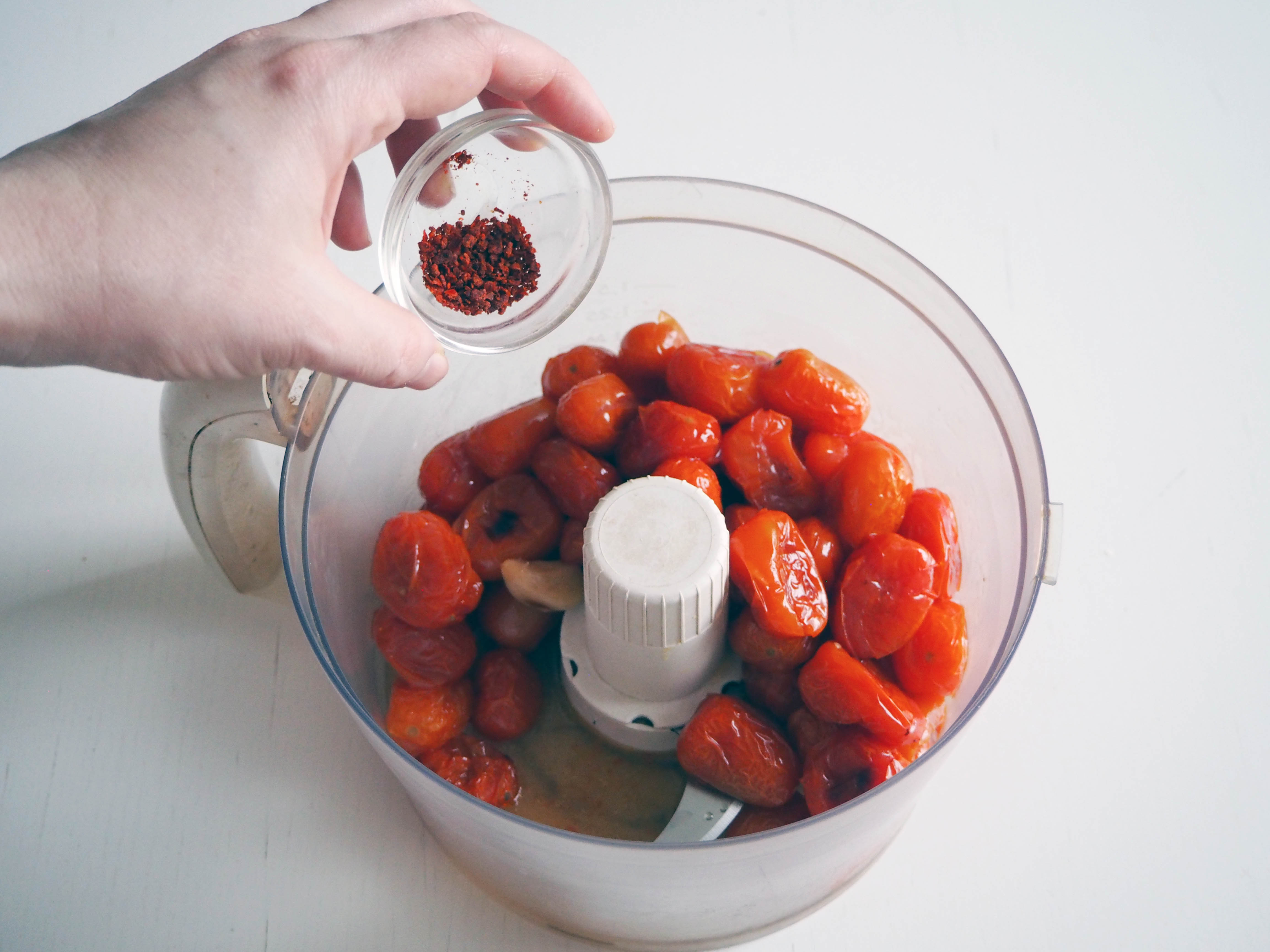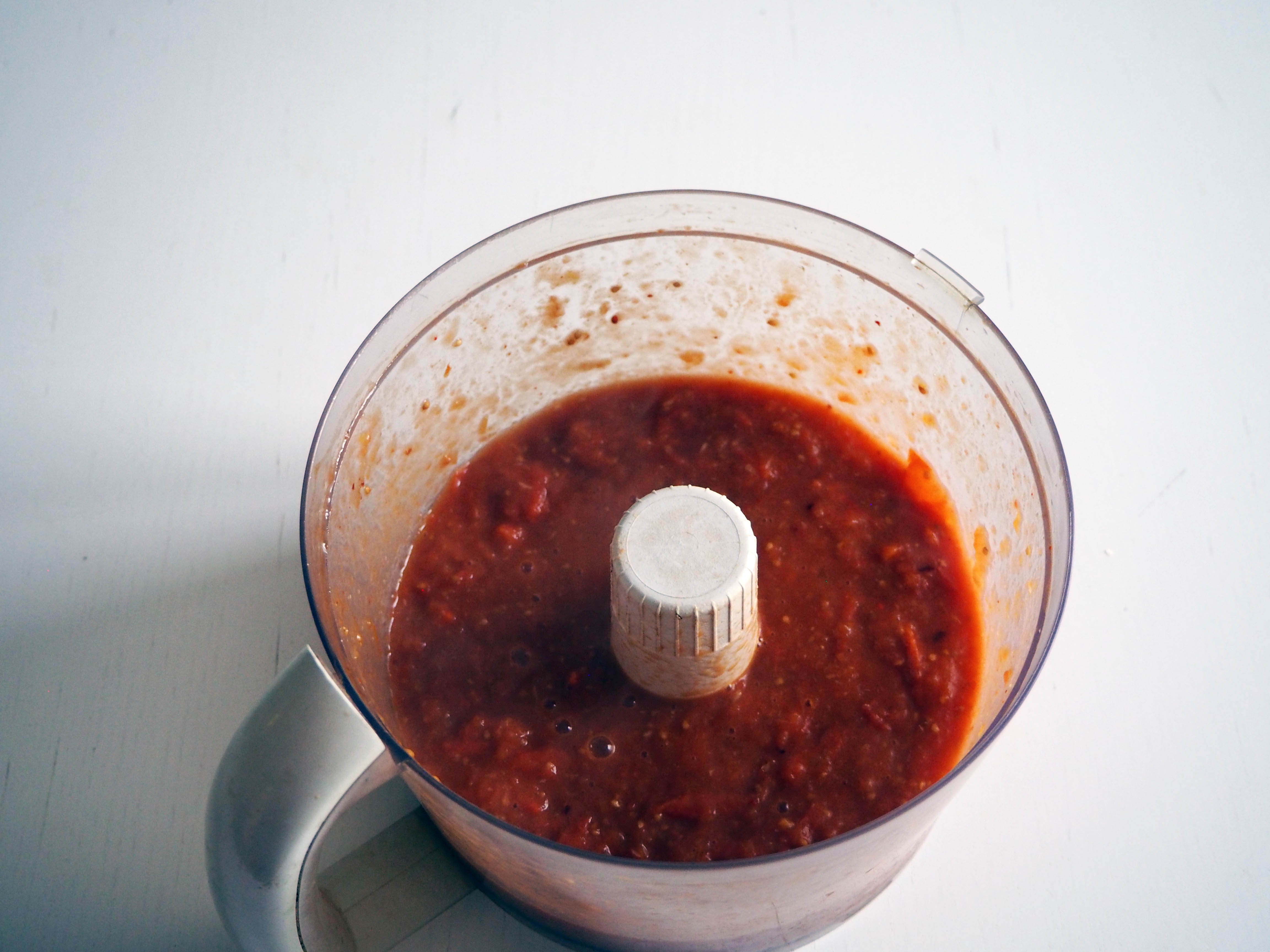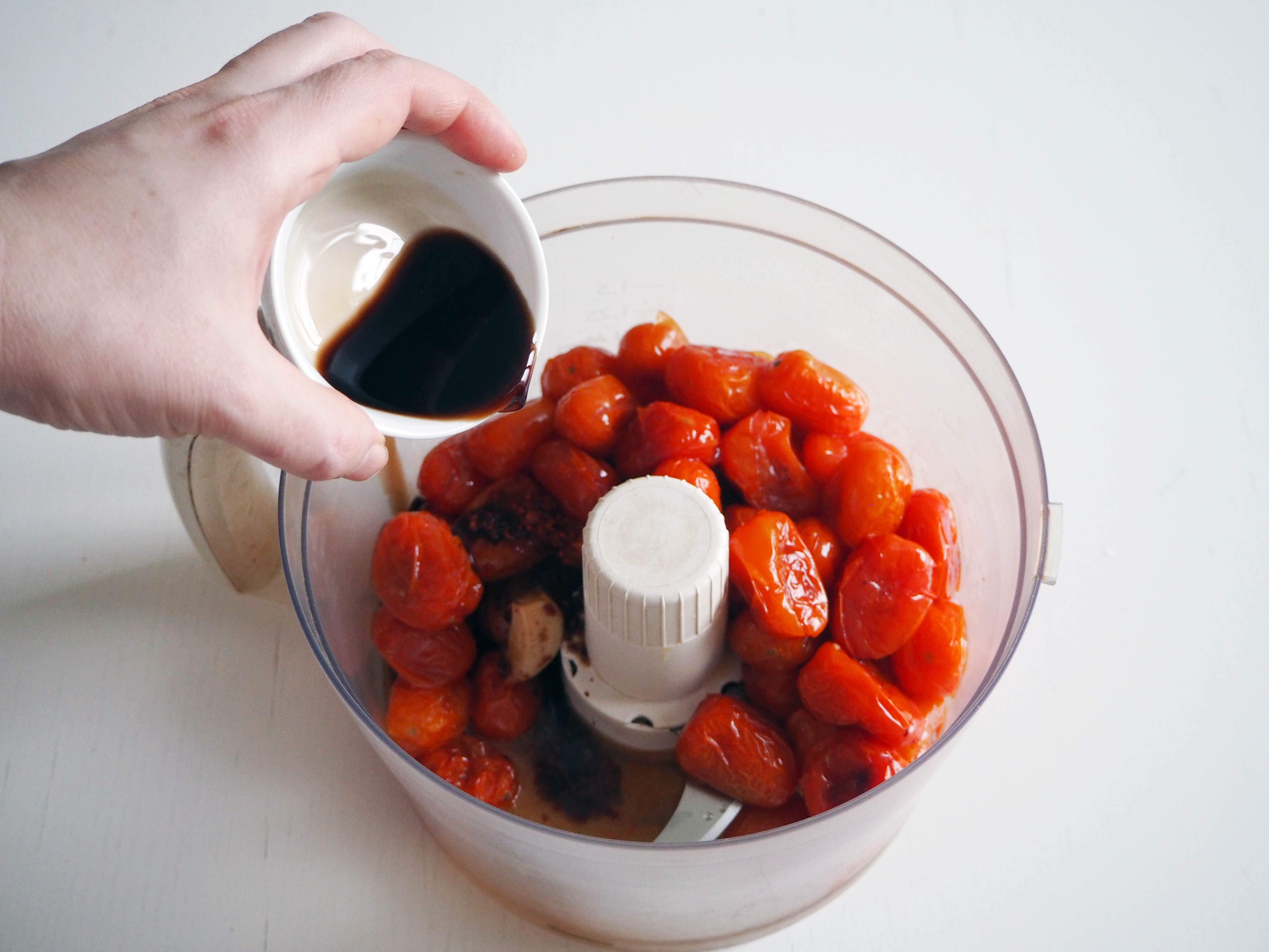 5. Put tomato mixture, red pepper flakes, balsamic vinegar and brown sugar in a food processor and process well.